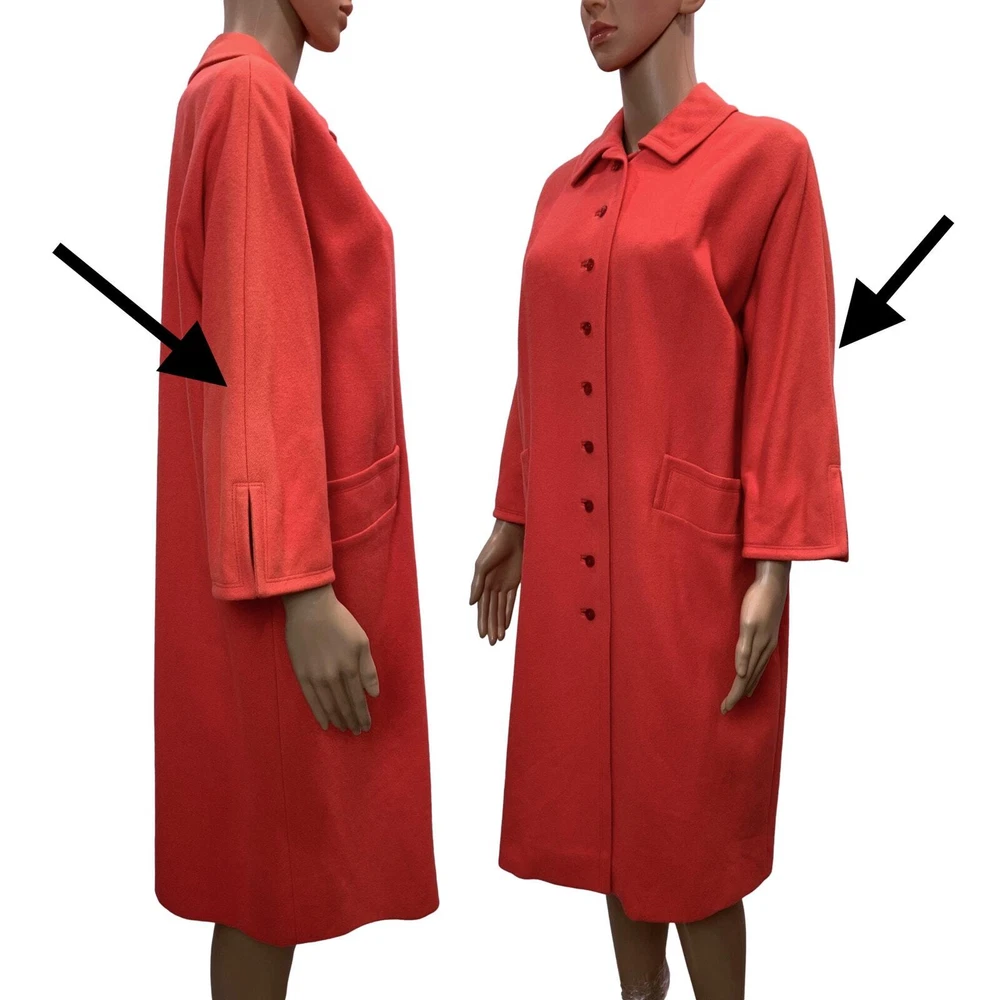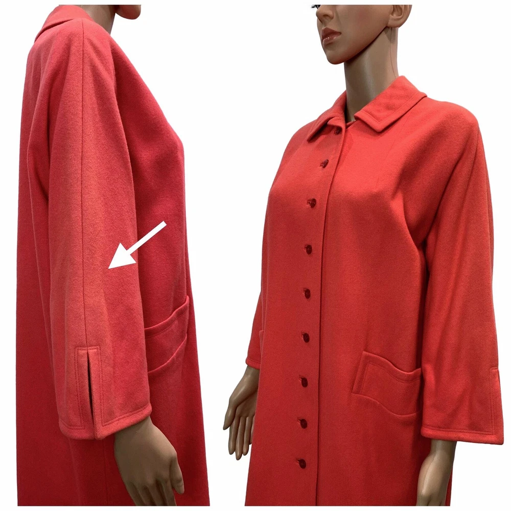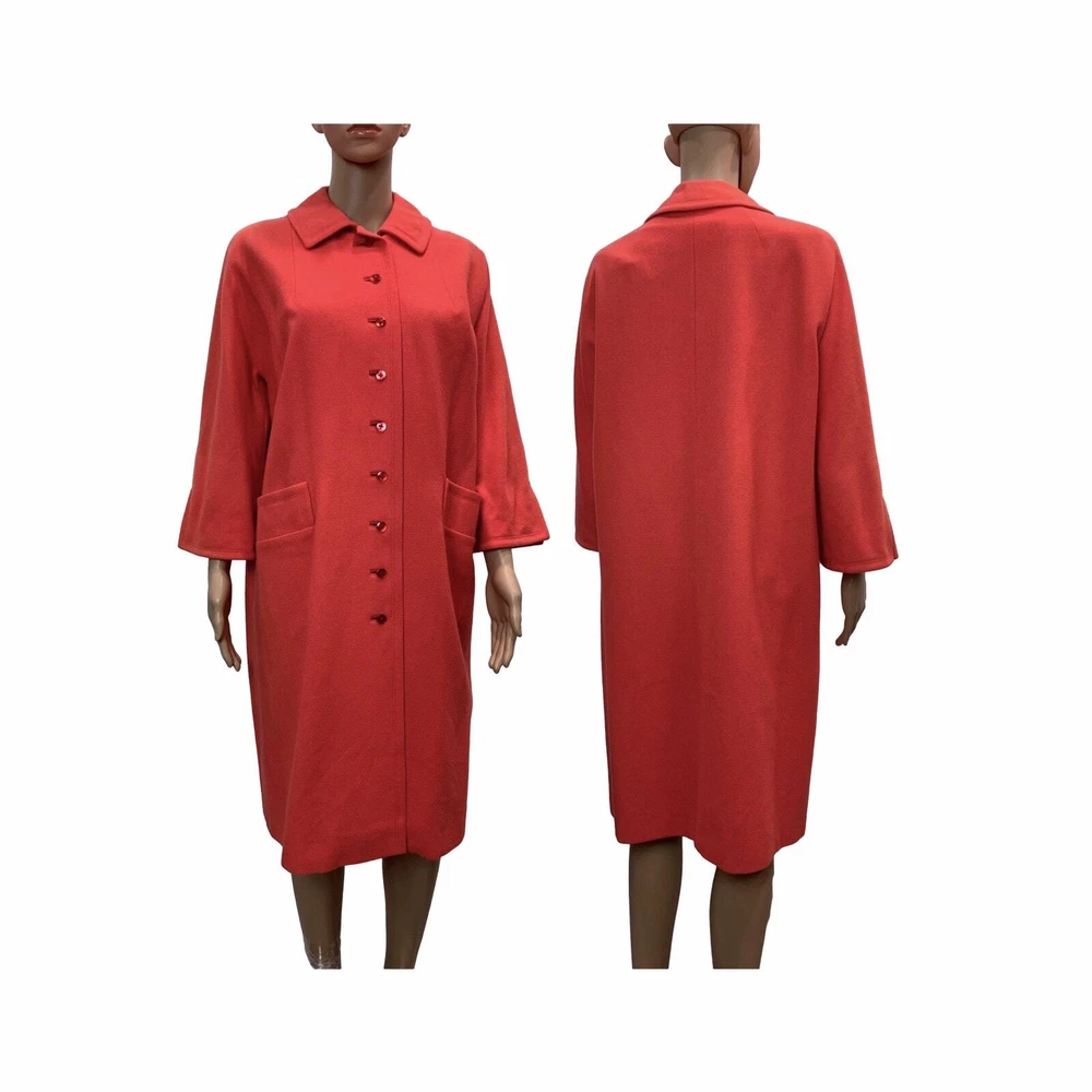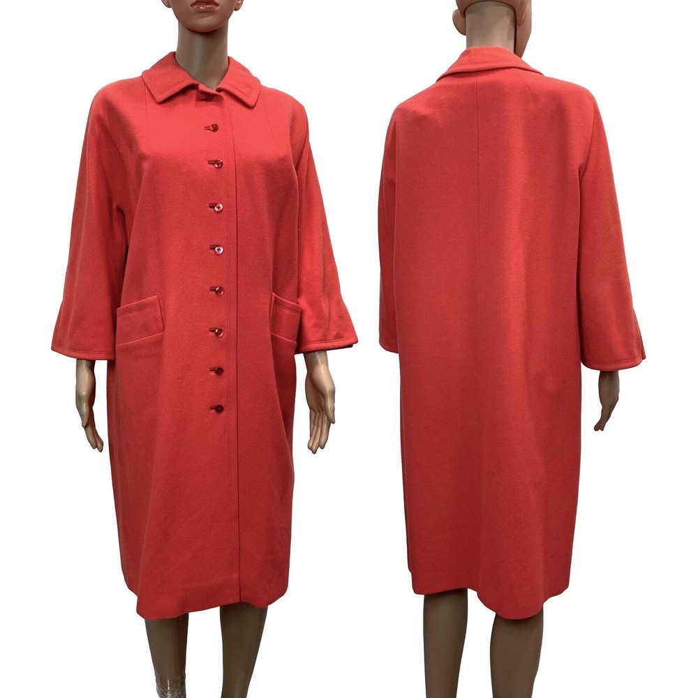 <![CDATA[<div>Jackie Kennedy CHIC! Classic true vintage 1960's Coral (orange/pink shade- more orange than pink) lighter weight wool coat, lovely classic design with 3/4 sleeves with split hems that can be worn down or folded. Inverted flaps on pockets, simple elegant styling. LABEL : Travelaire, MilliSpun by Dumas, union label CONDITION: Good vintage condition, no holes or moth bites found, has some fading on outer edges of sleeves. Please see photos with arrows. Worse on right, doesn't detract much in person - PRICE reflects the fading on sleeve edges SIZE : unmarked - fits XS/S to maybe M - Please compare measurements to a similar garment you own allowing a little room for differences in measuring tools & techniques Mannequin is 33, 24, 34 MEASURED : bust, flat : 21" waist, flat : 22.25" hem, flat : 22.75" shoulder : estimated, raglan : 17" sleeve, from collar seam : 25.5" length, back, collar seam to hem : 39.5" armpit to hem : 28.5" (InS)