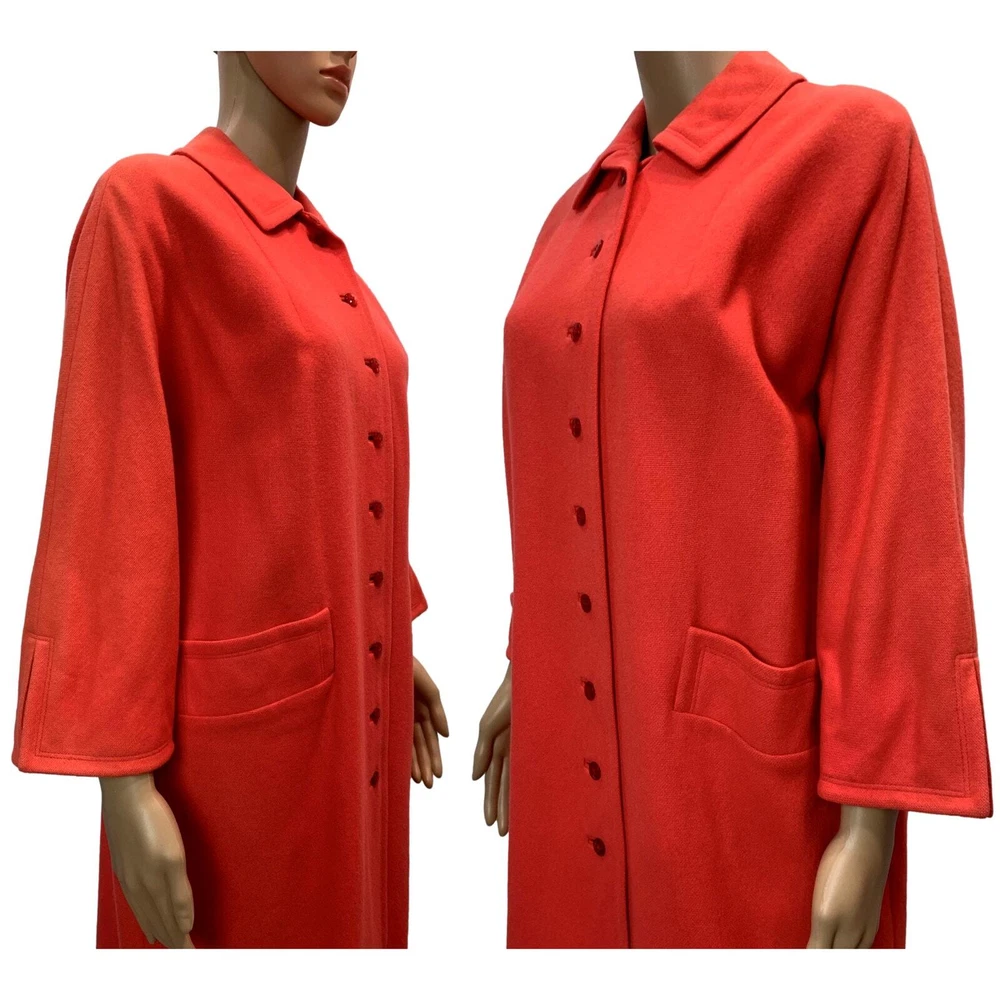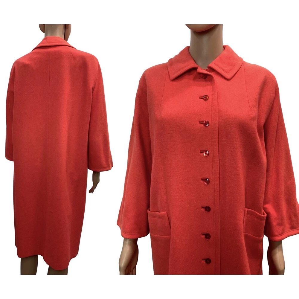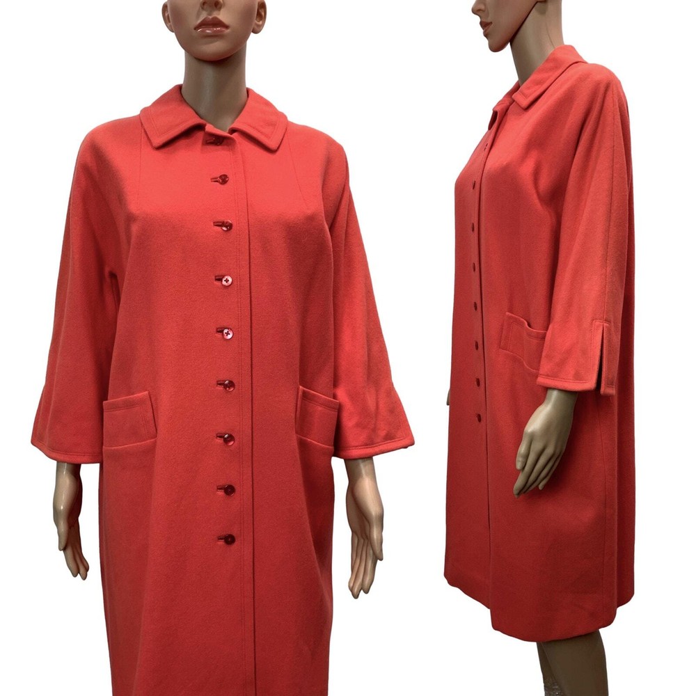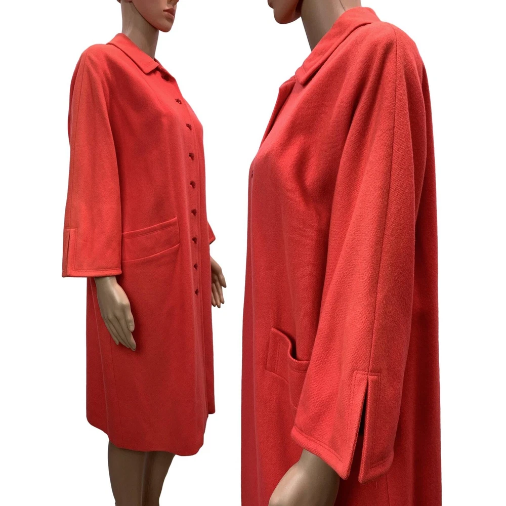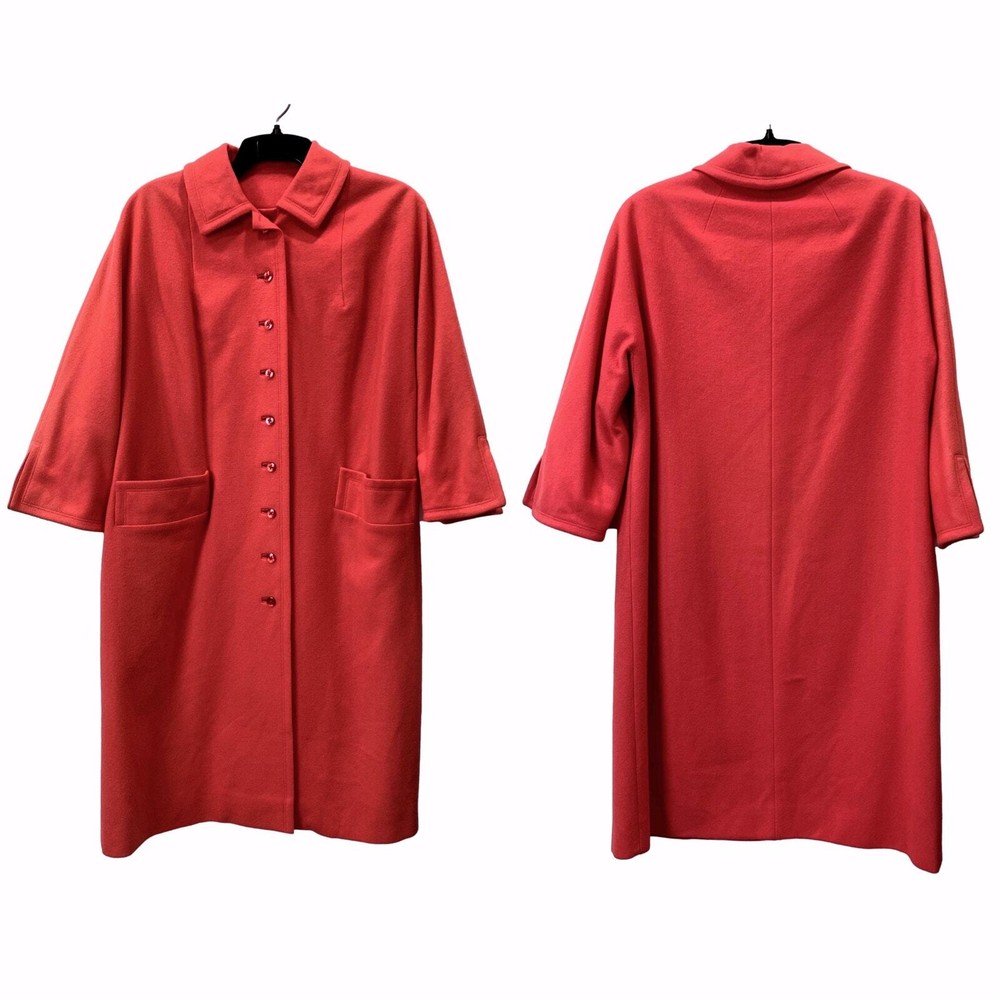 <![CDATA[<div>Jackie Kennedy CHIC! Classic true vintage 1960's Coral (orange/pink shade- more orange than pink) lighter weight wool coat, lovely classic design with 3/4 sleeves with split hems that can be worn down or folded. Inverted flaps on pockets, simple elegant styling. LABEL : Travelaire, MilliSpun by Dumas, union label CONDITION: Good vintage condition, no holes or moth bites found, has some fading on outer edges of sleeves. Please see photos with arrows. Worse on right, doesn't detract much in person - PRICE reflects the fading on sleeve edges SIZE : unmarked - fits XS/S to maybe M - Please compare measurements to a similar garment you own allowing a little room for differences in measuring tools & techniques Mannequin is 33, 24, 34 MEASURED : bust, flat : 21" waist, flat : 22.25" hem, flat : 22.75" shoulder : estimated, raglan : 17" sleeve, from collar seam : 25.5" length, back, collar seam to hem : 39.5" armpit to hem : 28.5" (InS)