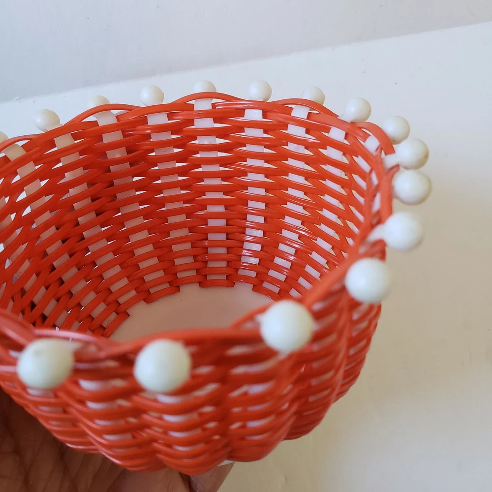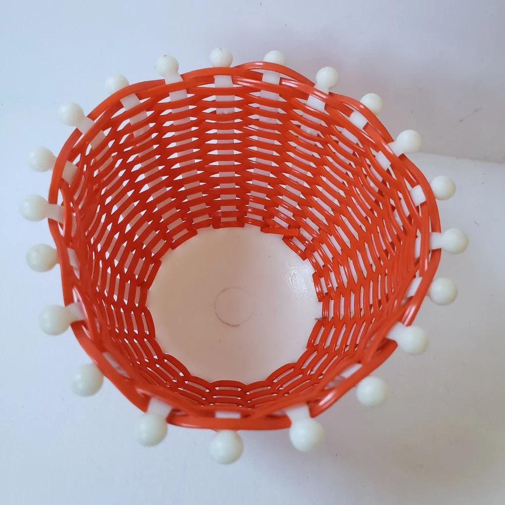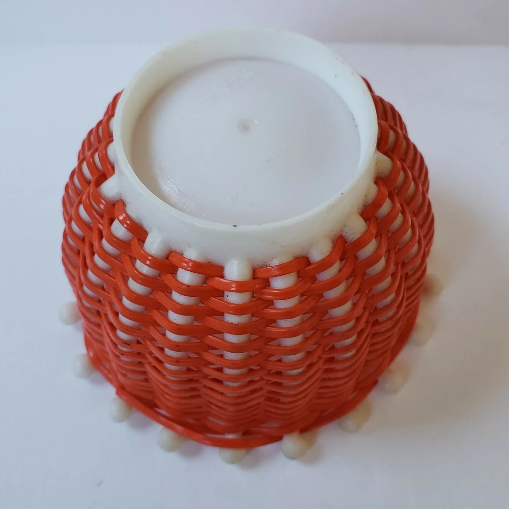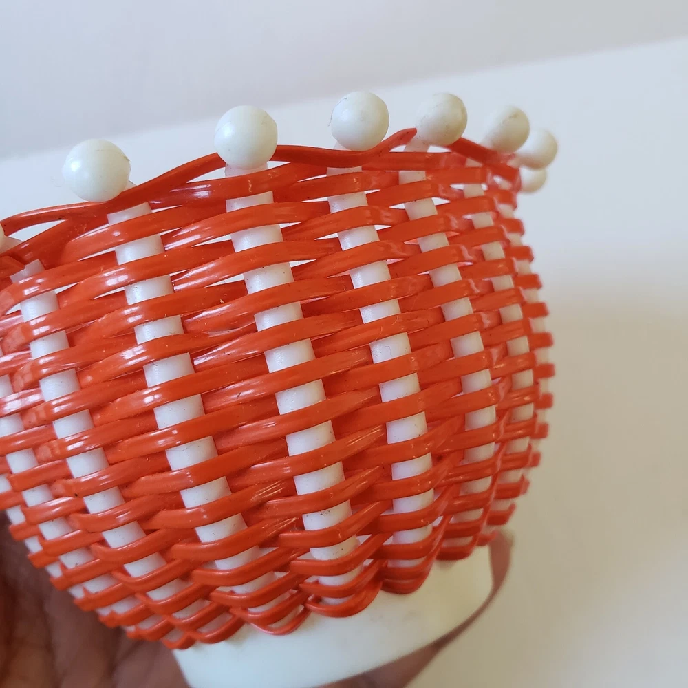 70's MOD S&S Arts Crafts Miniature Orang Plastic Woven Basket Mid Century Home Decor Artisan Mini Plastic Basket 3"Hx4W"...