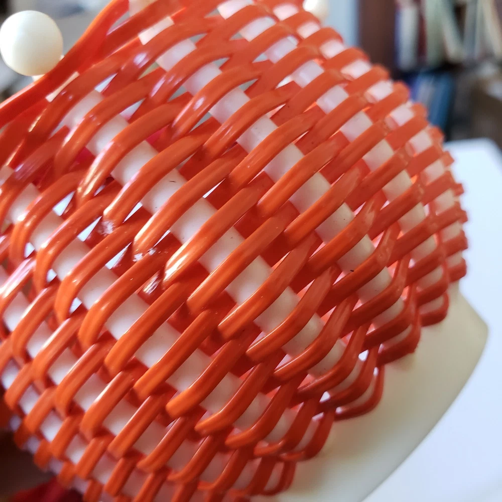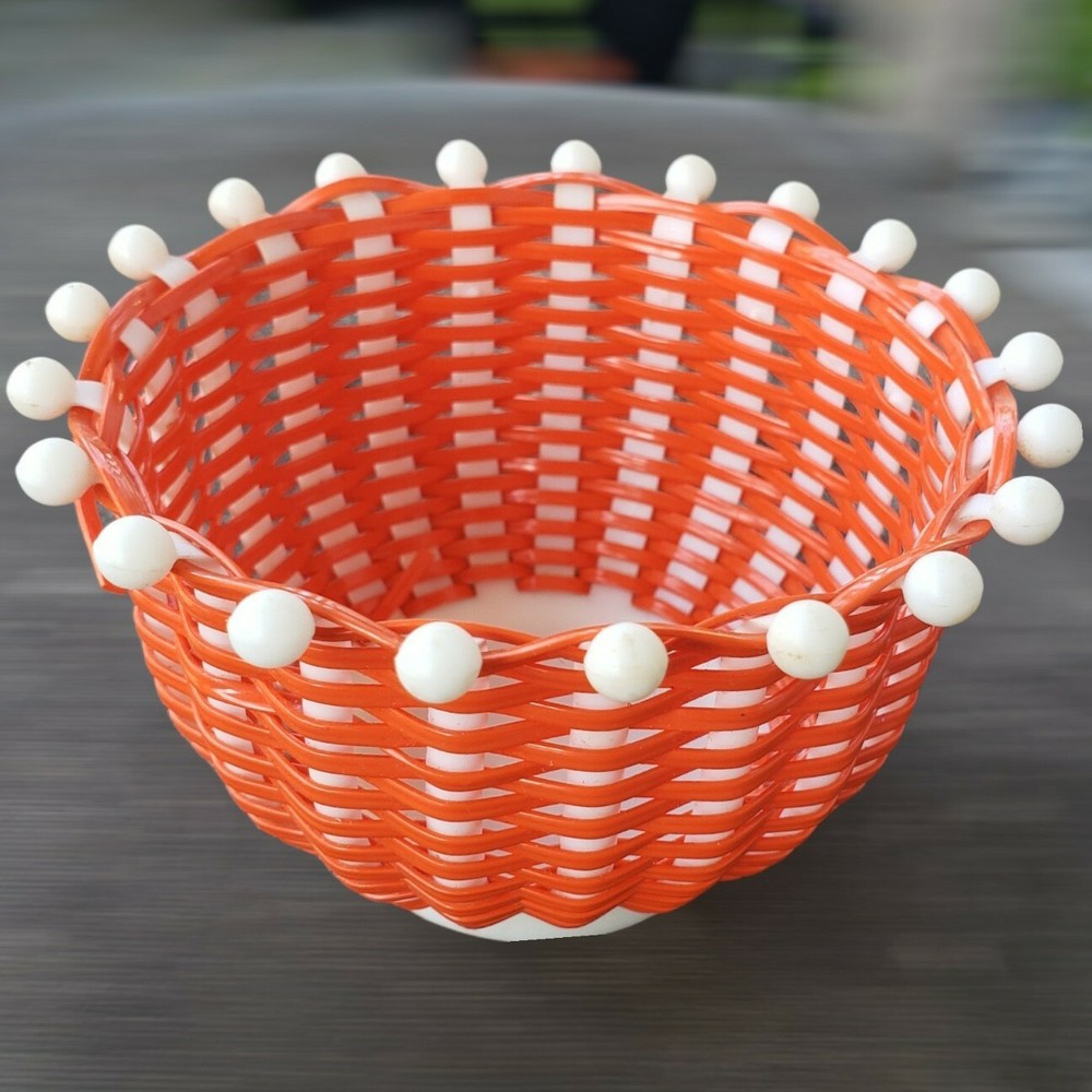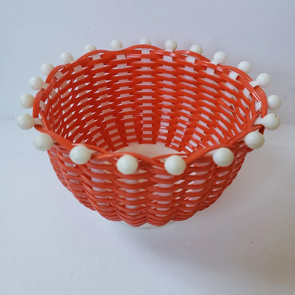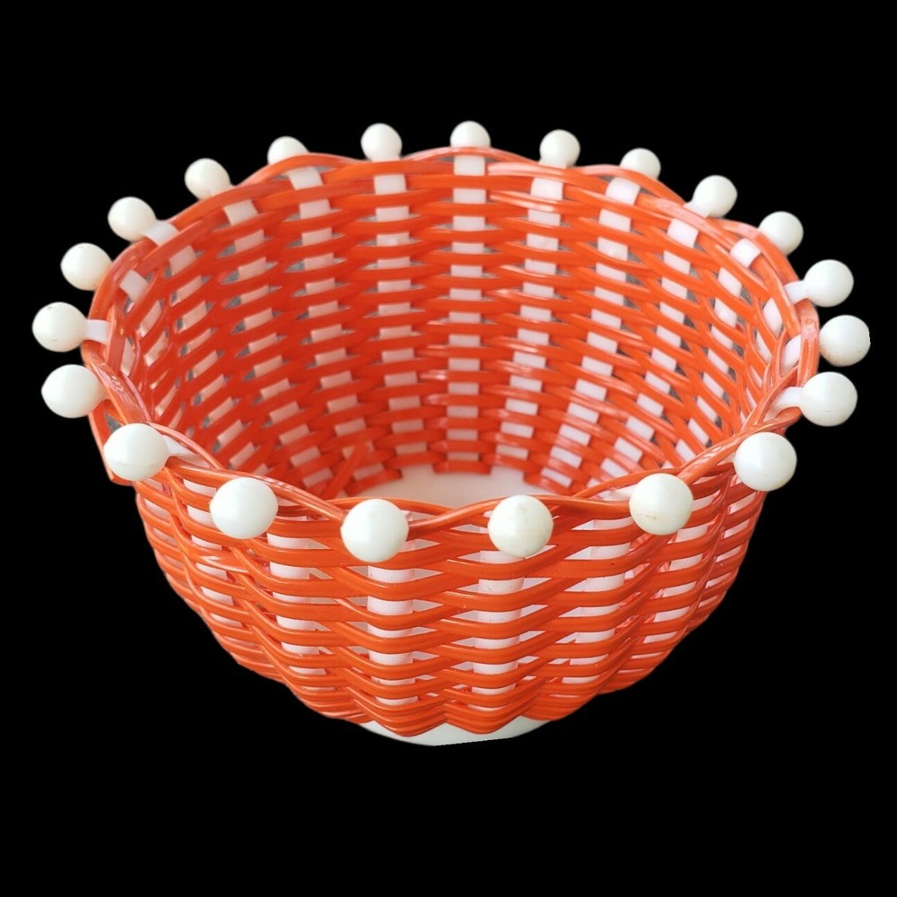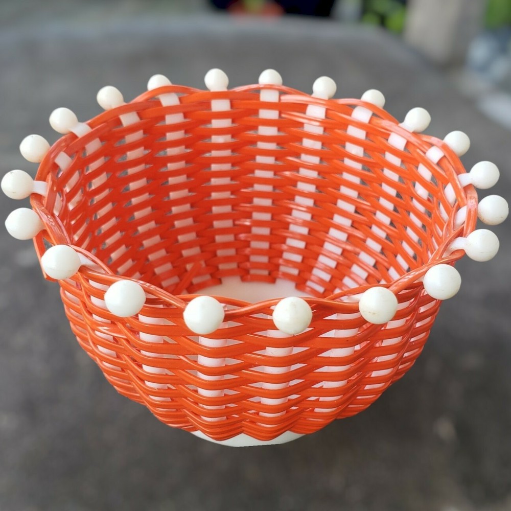 70's MOD S&S Arts Crafts Miniature Orang Plastic Woven Basket Mid Century Home Decor Artisan Mini Plastic Basket 3"Hx4W"...