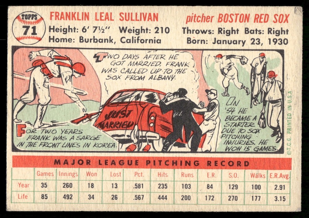 This is a nice example of a 1956 Topps #71a Frank Sullivan Other important information about this card: White Back In 1956 Frank Sullivan played for the Boston Red Sox. Please check out our other listings for more great cards.