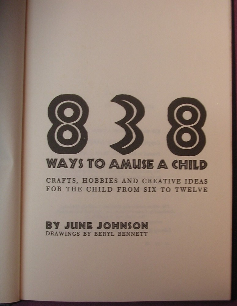 Hard Cover, 838 Ways to Amuse a Child by June Johnson. Crafts, Hobbies and Creative Ideas For the Child From Six to Twelve. Gramercy Publishing Co. 1960. Fun and Entertainment for a rainy da y. Multiple purchases combined for reduced shipping. Email me before purchasing for details.
