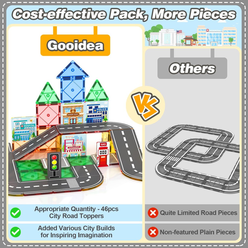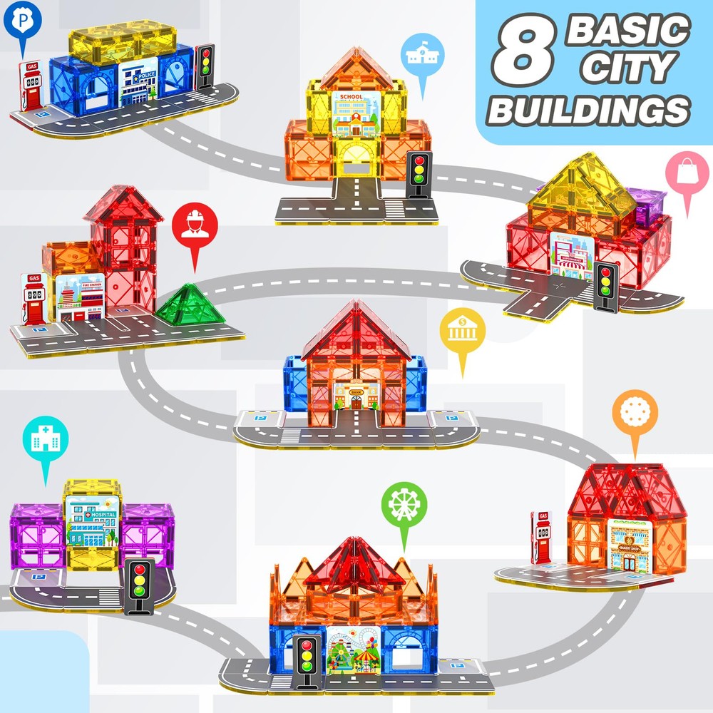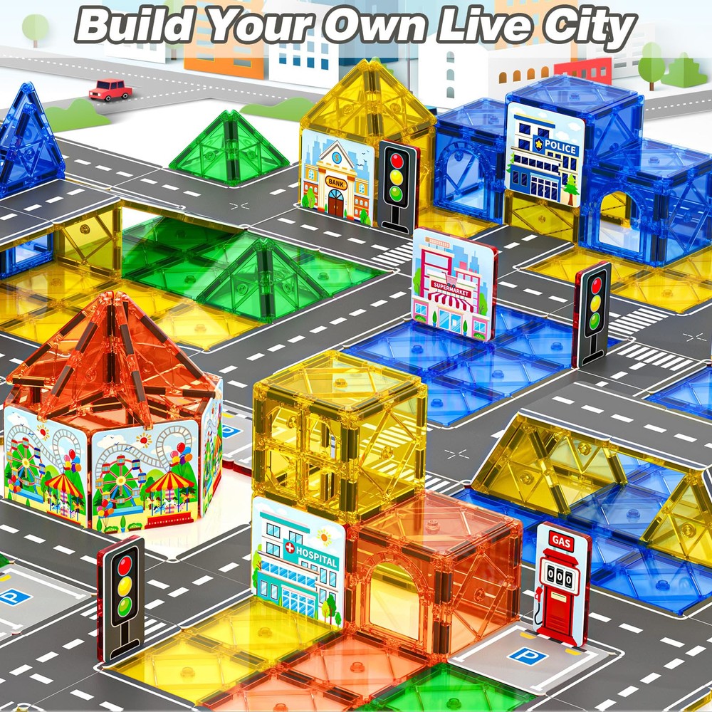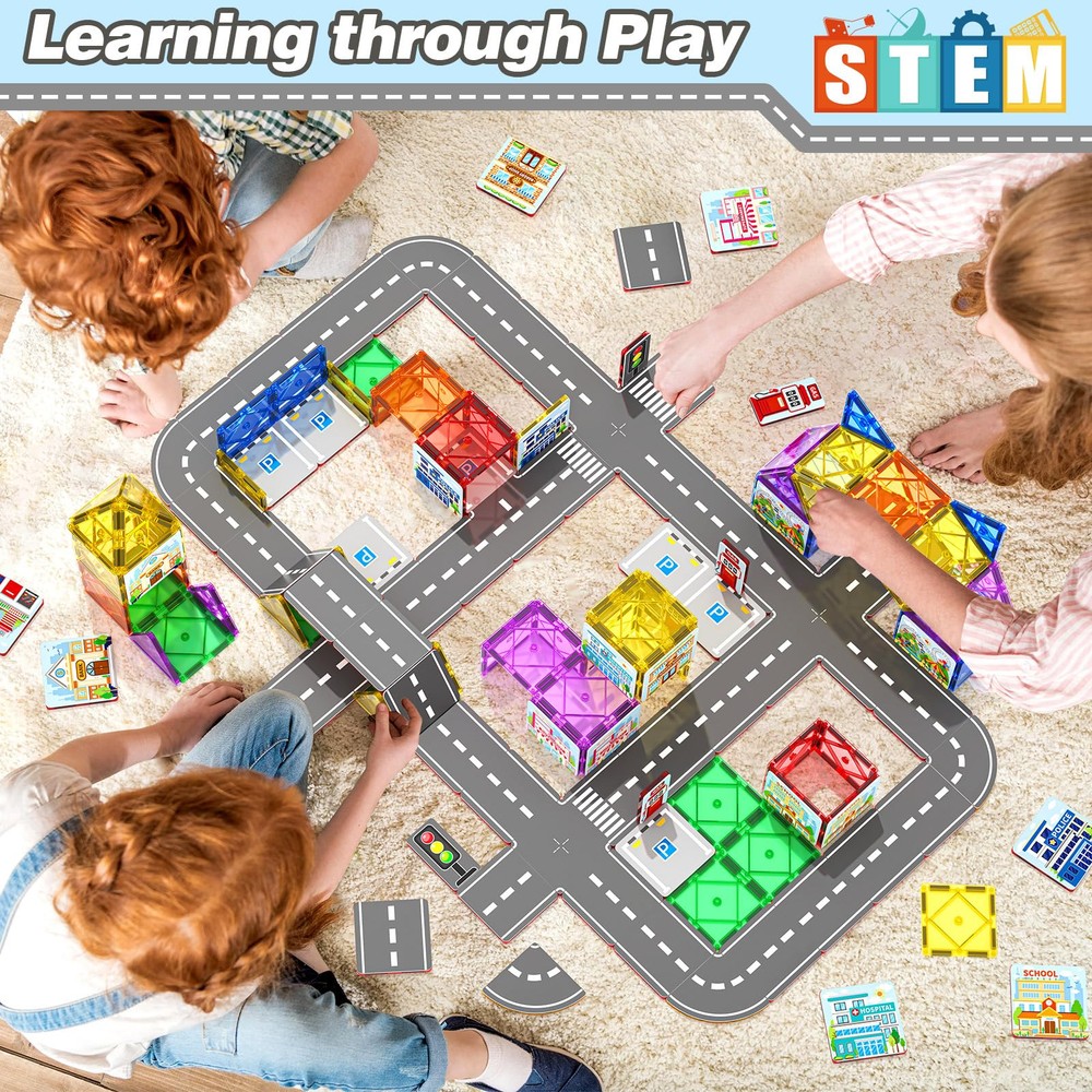 【PRETEND PLAY MAGNETIC TILES】Build your own live city with 92PCS City Construction Playset! This kids' toys includes 8 city buildings, bakery, police office, bank, school, fire station, hospital, amusement park, supermarket. After "I" drived a car to go shopping in the supermarket, I buy some cakes at the bakery for the party tonight...Buildings with different themes can be strung together into a complete storyline, which will stimulate the kids' imagination to the maximum and cultivate language organization and expression ability. Let's immerse ourselves in the city you built! 【SAFETY AS TOP PRIORITY】Safety is always our top concern! The city building construction playset are made from premium PVC material and metal tape with a wipeable layer on top for easy cleaning. Tile toppers do not contain magnets themselves but stick to the magnetic tiles using the metal contained inside them. Durability is guaranteed, growing with kids, offering endless educational value and creativity possibilities for kids. 【STEM EDUCATION THROUGH PLAY】On a cozy afternoon, "I" am building a unique city landscape with my parents. We put the bakery next to our house because we all have a sweet tooth, behind the house is an amusement park for weekend fun...What a great pretend play toy! Each play session is a journey of growth and discovery. Through building, Kids can learning trafiic rules, logical ability, problem-solving skills...Transform playtime into an educational adventure! Recommended Preschool classroom learning toys for kids age 3+, and also sensory toys for kids with ADHD/ASDs. 【IDEAL CREATIVE GIFT FOR KIDS】Ideal gift for home, classroom activities, Christmas, birtyday, Easter, Thanksgiving...These magnetic tiles provide unlimited joy and educational value for kids. A perfect toys that grow with kids. Whether in home or outdoors, the magnetic toys meet kids couriosity and provide creative fun. Great outdoor toys for gaining the fun of 100% screen-free games and learning activities! 【PERFECT TOY FOR STORY MAKER】Everyday before going to school, "I" often eat bread as breakfast which "mom" bought in the bakery. The school bus will pass by police station, hospital, fire station... After school, sometimes "I" go to the amusement park with "my classmates", and sometimes go to the supermarket with "my parents"... At this point, kids have imagined an interesting story by simulating different traffic scenarios and exploring more than 10 ways to build city roads and sparking imagination while having fun. Great pretend play toys for toddlers. Let's kids to be the "city planner".