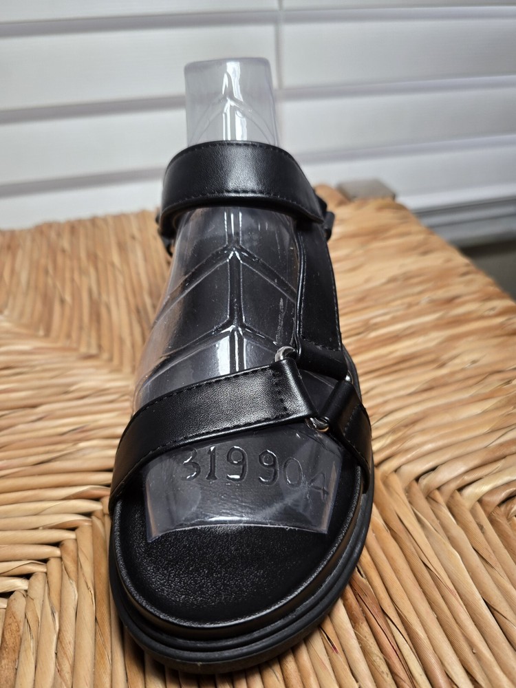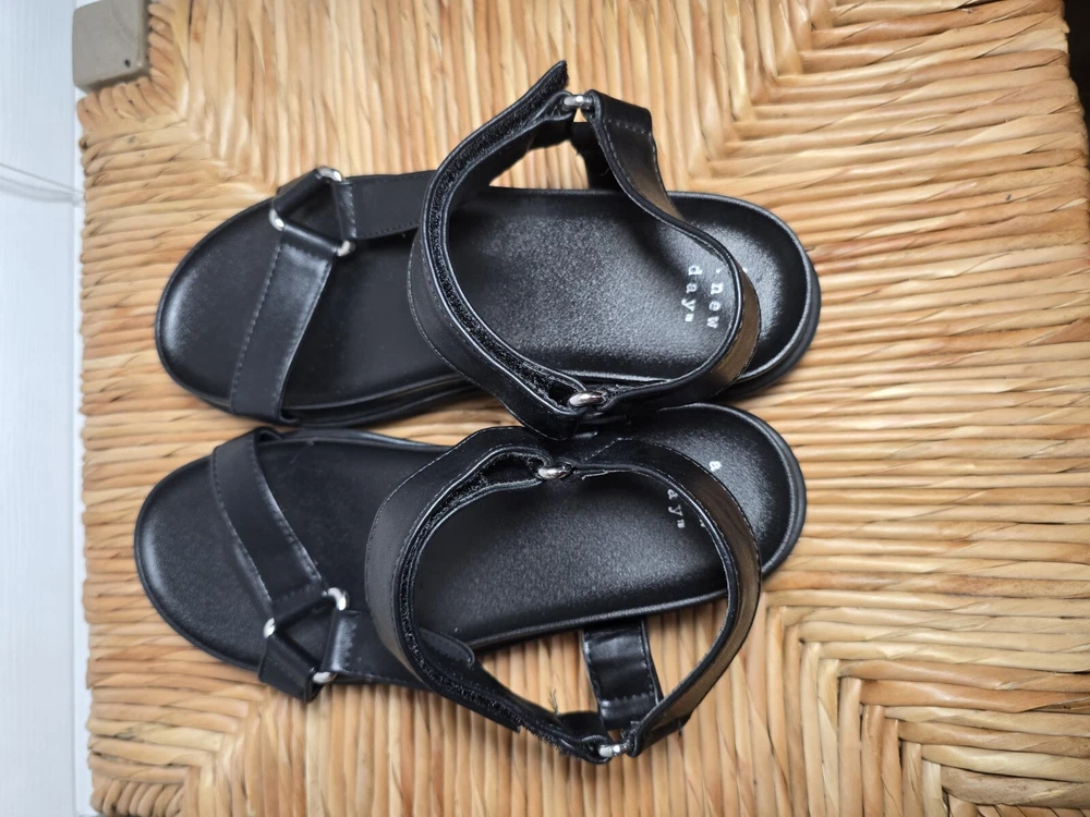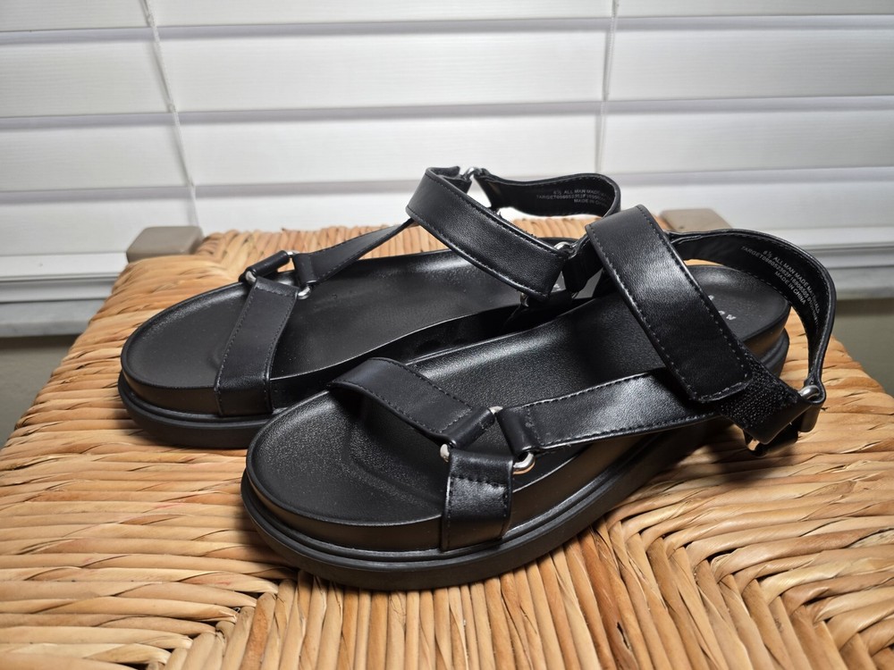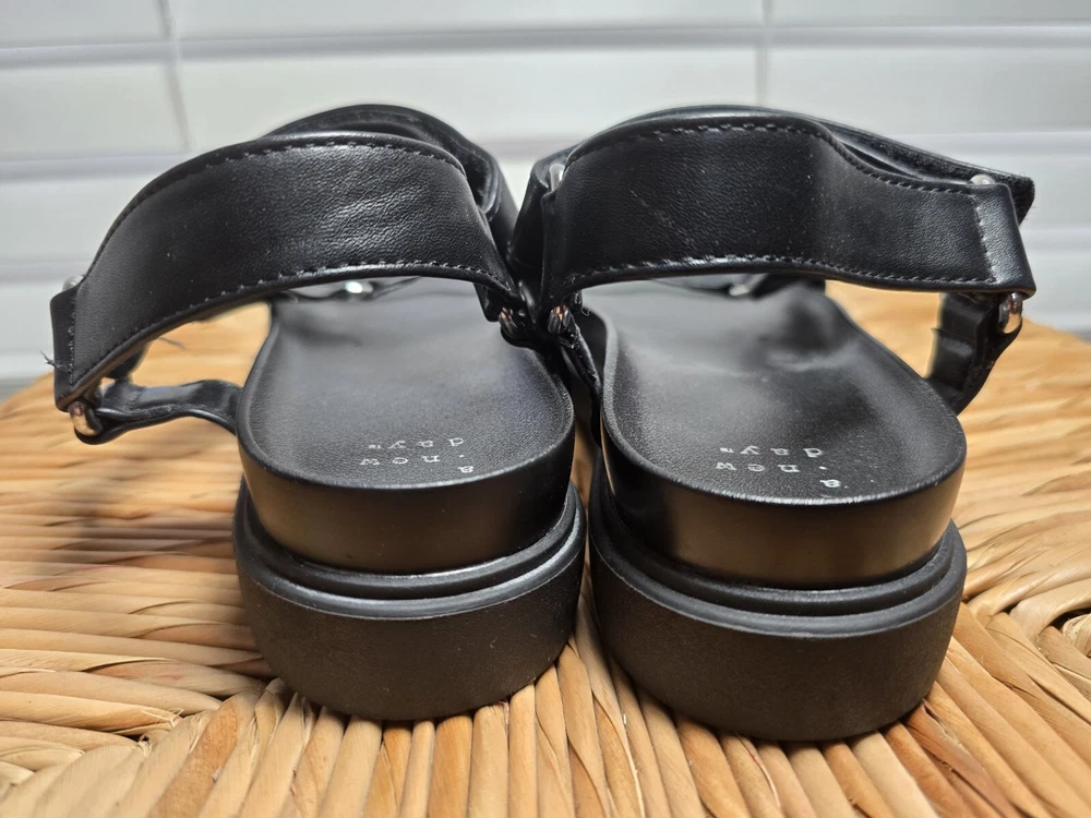 Up for sale are a stylish and comfortable pair of sandals from A New Day. These strappy sandals feature hook and loop closures and buckles for a secure fit. The footbed is designed for all-day comfort. The upper material is man-made and the color is black. These sandals are perfect for women who want both style and comfort. The US shoe size is 11, but please check the measurements before purchasing. Don't miss out on this great deal!