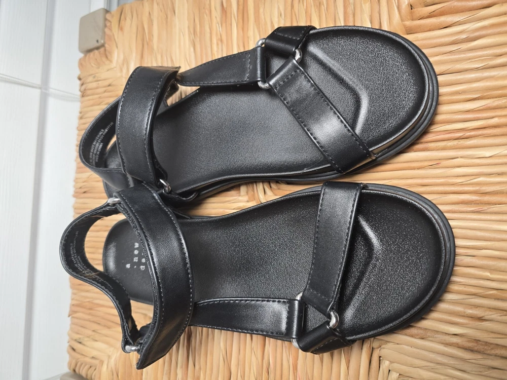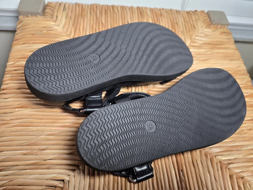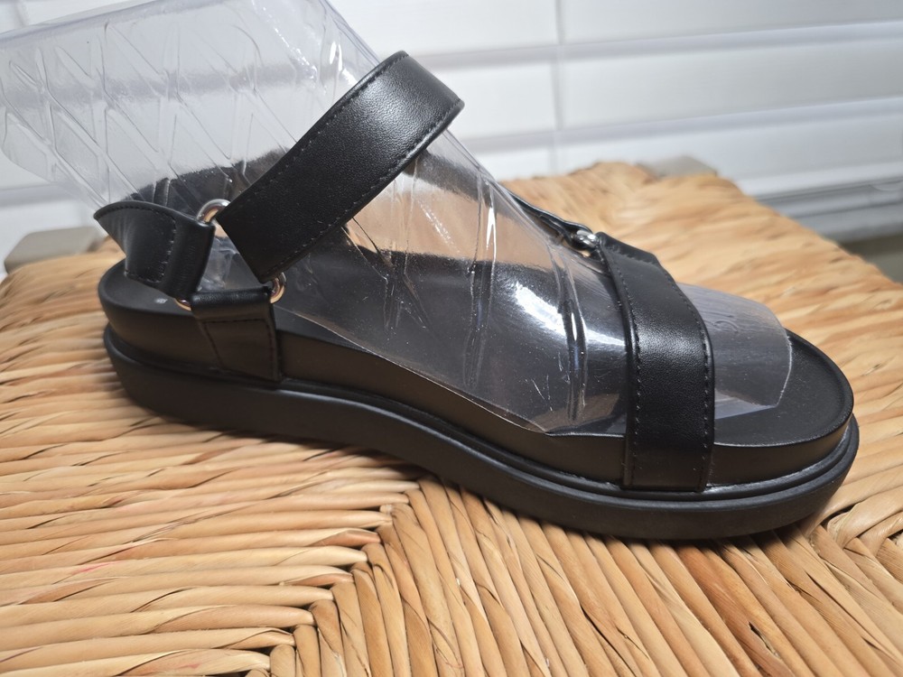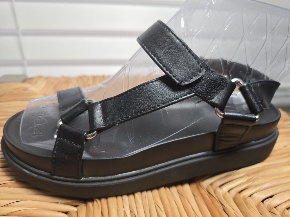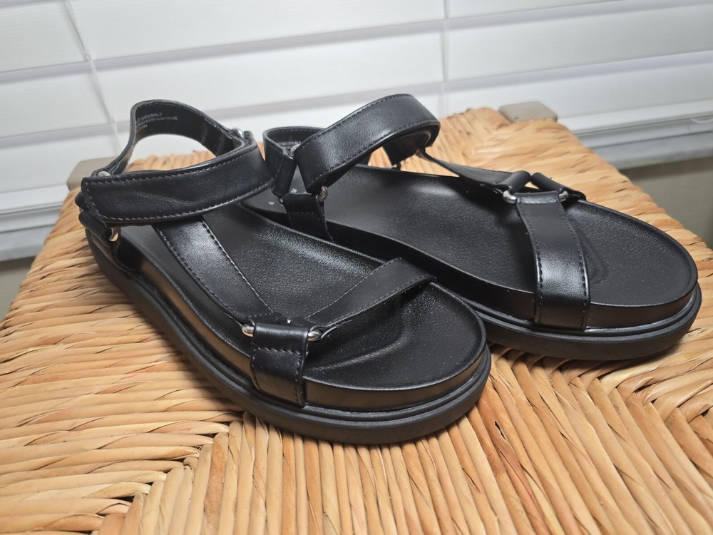 Up for sale are a stylish and comfortable pair of sandals from A New Day. These strappy sandals feature hook and loop closures and buckles for a secure fit. The footbed is designed for all-day comfort. The upper material is man-made and the color is black. These sandals are perfect for women who want both style and comfort. The US shoe size is 11, but please check the measurements before purchasing. Don't miss out on this great deal!