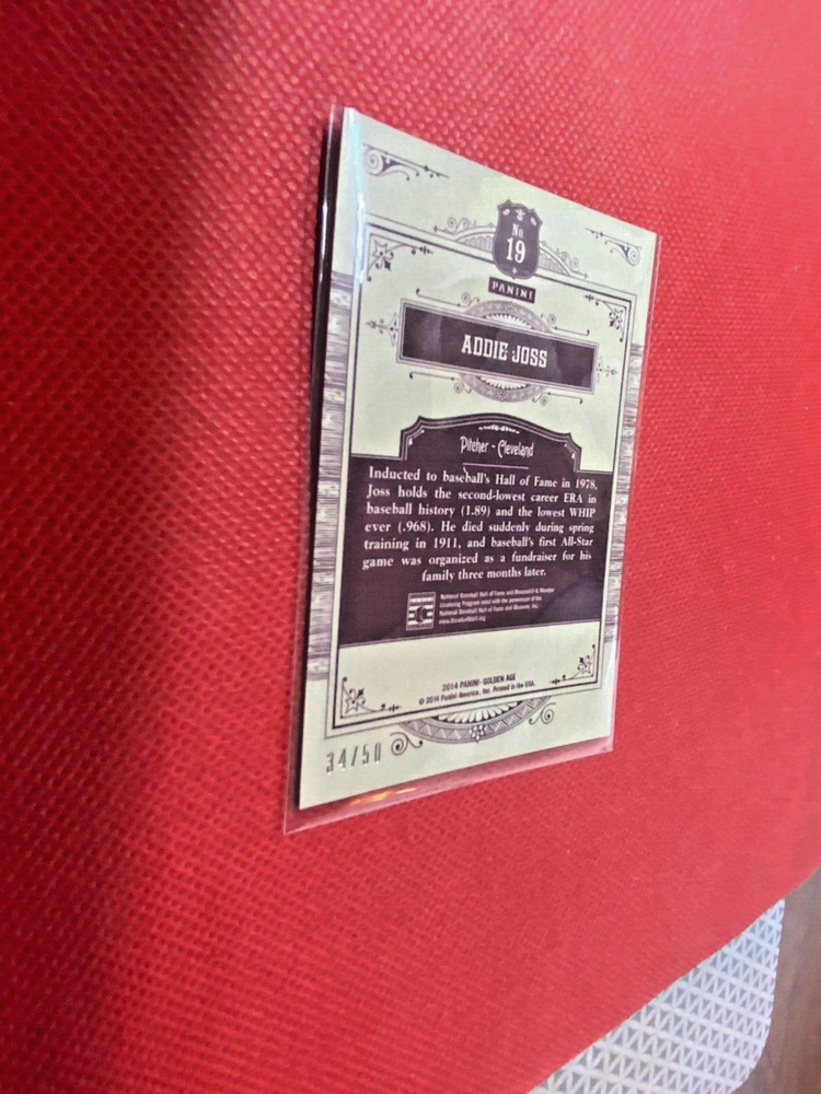 This 2014 Panini trading card features Addie Joss and is part of the GOLDEN AGE FIRST FIFTY insert set. The card number is 19 out of a print run of 50. The card is ungraded and comes in a single pack. The manufacturer is Panini and it is an original card, not a licensed reprint. It is a great addition to any sports trading card collection and perfect for fans of movies and the sport of baseball.