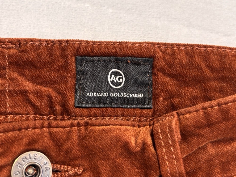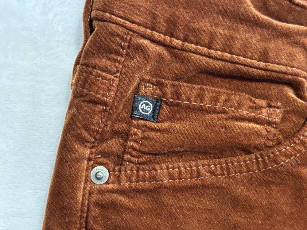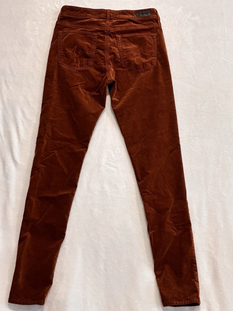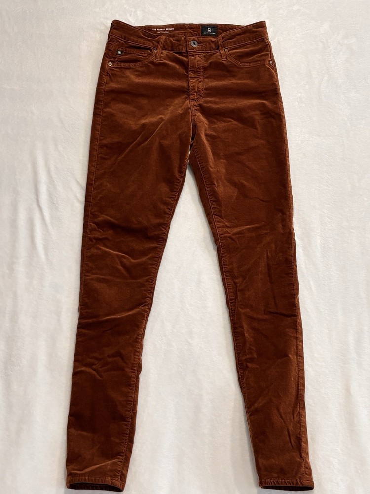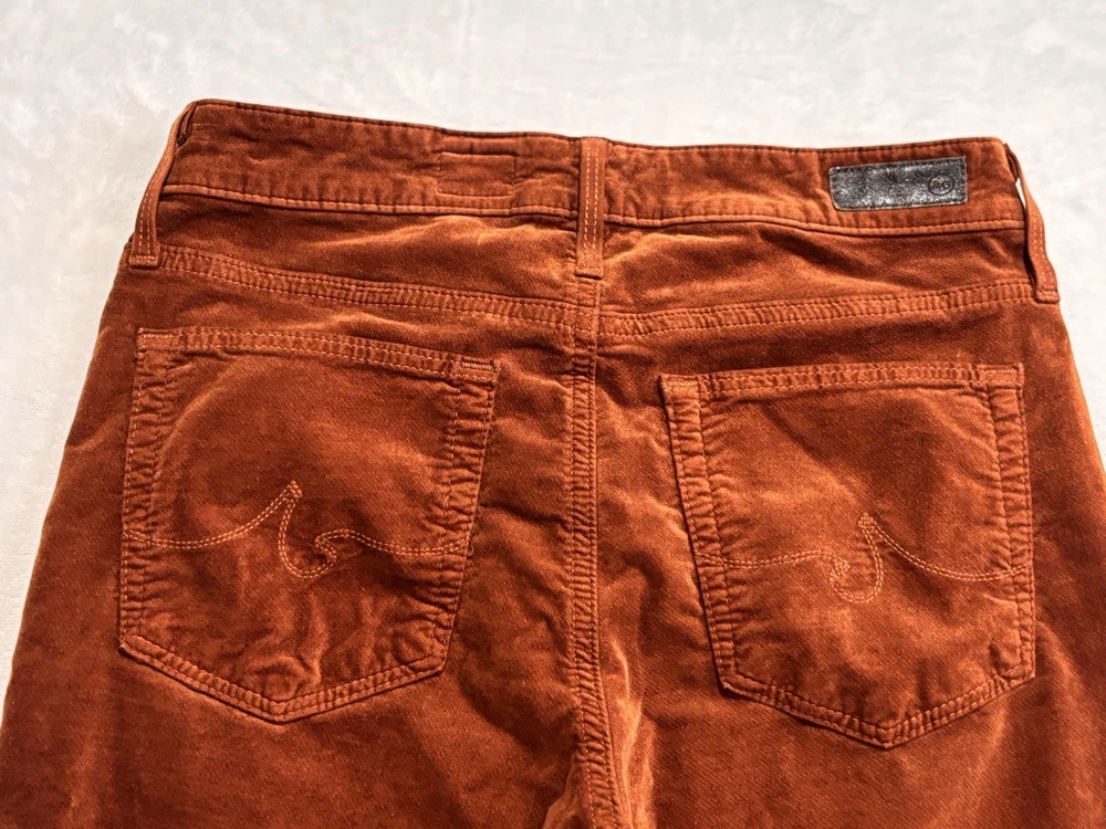 The AG Adriano Goldschmied Brick Farrah High Rise Skinny Jeans in size 28R are a stylish and versatile option for women's wardrobe. Made from a cotton blend fabric with a velveteen texture, these jeans feature a mid-rise fit with a 29-inch inseam and a skinny style for a modern look. The jeans are accented with the brand's logo and have a traditional 5-pocket design, perfect for adding functionality to the designer piece. With a vibrant orange color and stretch material, these jeans are suitable for wearing in the winter, fall, and spring seasons.