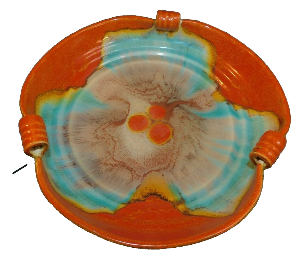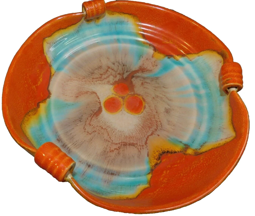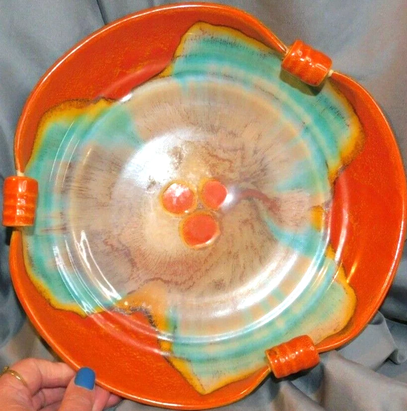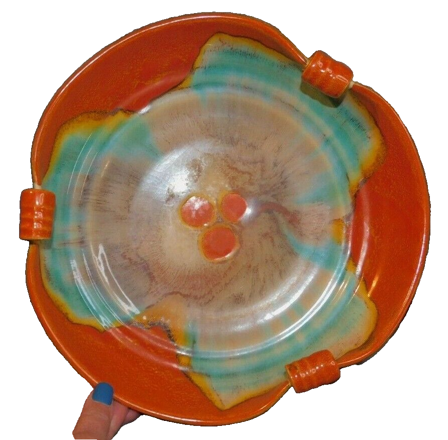 STUNNING ART DECO / MODERNIST or ARTS & CRAFTS BOWL #4027 COLORS ARE SPLATTERED~ORANGE, TEAL, BROWN ~ APPROXIMATELY 3" TALL X 10 5/8" ACROSS ~~ THIS PIECE IS FABULOUS!!!! This stunning Art Deco/Modernist bowl by 4027 is a rare find for any collector. The bowl features a beautiful splattered pottery design in orange, teal, and brown, with a glossy finish that adds to its elegance. Measuring 10 5/8 inches in width and 3 inches in diameter, this bowl is perfect for all occasions and is sure to be a conversation starter. Crafted in the early 20th century using the pottery production technique, this bowl is a true piece of history. It comes as a set of one item and is ideal for anyone looking to add a touch of sophistication to their decorative cookware, dinnerware, and serveware collection. Don't miss out on the chance to own this unique and stunning bowl.