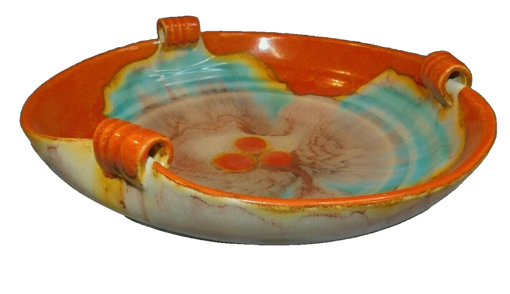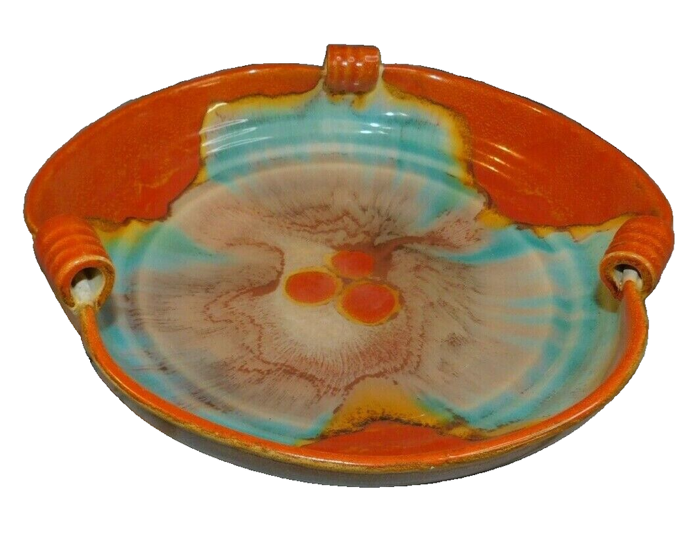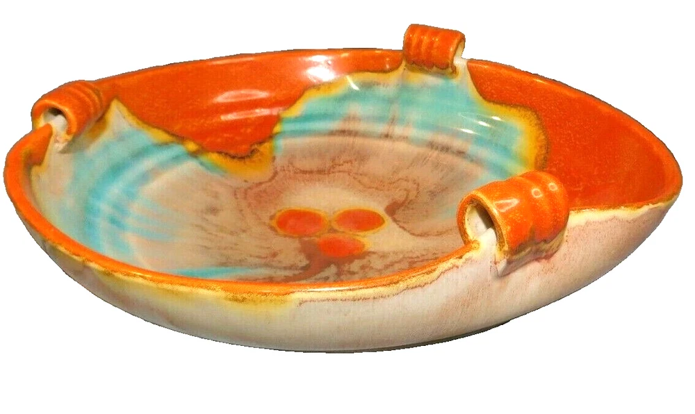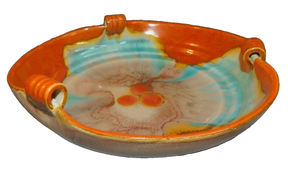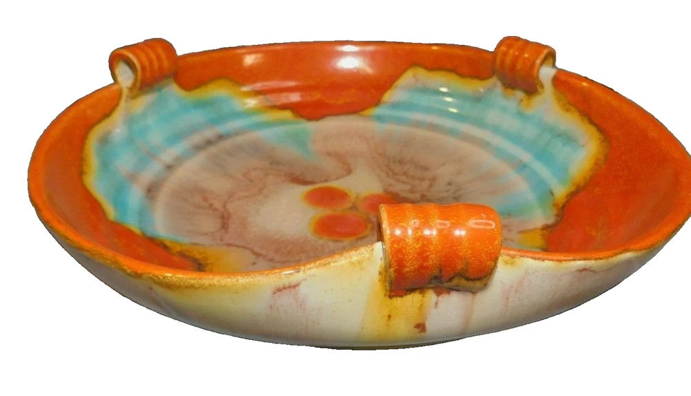 STUNNING ART DECO / MODERNIST or ARTS & CRAFTS BOWL #4027 COLORS ARE SPLATTERED~ORANGE, TEAL, BROWN ~ APPROXIMATELY 3" TALL X 10 5/8" ACROSS ~~ THIS PIECE IS FABULOUS!!!! This stunning Art Deco/Modernist bowl by 4027 is a rare find for any collector. The bowl features a beautiful splattered pottery design in orange, teal, and brown, with a glossy finish that adds to its elegance. Measuring 10 5/8 inches in width and 3 inches in diameter, this bowl is perfect for all occasions and is sure to be a conversation starter. Crafted in the early 20th century using the pottery production technique, this bowl is a true piece of history. It comes as a set of one item and is ideal for anyone looking to add a touch of sophistication to their decorative cookware, dinnerware, and serveware collection. Don't miss out on the chance to own this unique and stunning bowl.