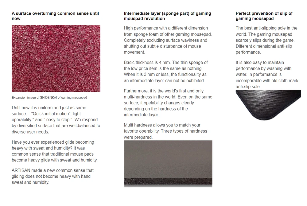 < p > The FX series solves the hard edges and stickiness problems unique to the CLASSIC series mouse pad by fixing it. < p > ARTISAN is a Japanese manufacturer of next-generation gaming mouse pads, and its products are widely used in more than 56 countries around the world. Its innovative technology has been widely recognized. < p > Surface: Knitted fabric (polyester fiber) < p > Changing the traditional capture surface: Traditional mouse pads use standard capture surfaces. This versatile surface balances "fast and easy handling of initial actions" and "braking ability". < p > FX is zero, and its operability is also relatively low in terms of slipperiness. It is made of fine material with high resistance. < p > MID series