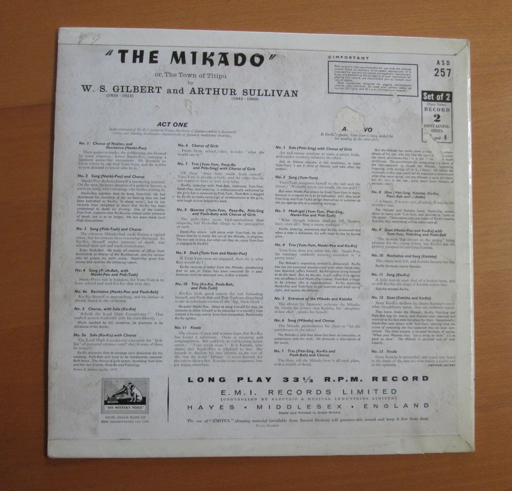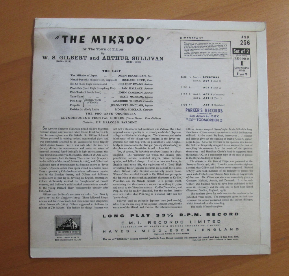 Combined Postage Available UK Free after first item Europe £20 p&p for unlimited items Worldwide postage discounts available on all items Gilbert & Sullivan : The Mikado Sir Malcolm Sargent / Owen Brannigan / Geraint Evans / Richard Lewis etc Vinyl excellent / Cover excellent (2xLP) EMI ASD 256 / 257 1958 Stereo 2xLP ED1 White Gold Label Free UK postage for additional items International postage discounts available on request All records cleaned on an OKKI NOKKI machine before posting Professionally packed in record mailer with polythene sleeve and cardboard stiffeners Vinyl is visually graded under strong natural light and briefly audio tested for any problems. MINT (M) : Sealed or unplayed. NEAR MINT (NM) : Vinyl as new, no marks or scratches. Cover looks and feels like a new item. EXCELLENT (EX) : One or two hairline marks to vinyl, cover has slight wear to edges/creasing etc. VERY GOOD (VG) : Feels more worn. Cover has creasing/wear and vinyl has several marks and possibly some surface noise Unusual or rare items are occasionally listed below VG quality in which case "see description" Items are graded vinyl/cover While these grades are useful as a general guide, each individual LP is given a more accurate detailed description in the listing. S&W