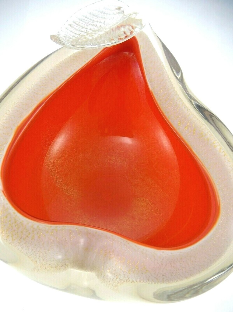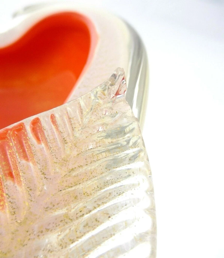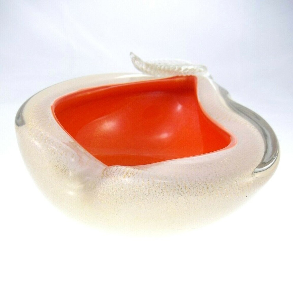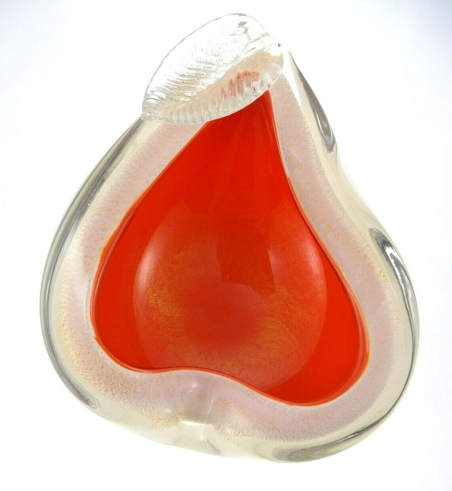 7" Alfredo Barbini Murano Gold Orange Pear Bowl Ashtray Mid-Century Glass. Slightly Damaged But Still Beautiful. There Is A Long Shallow Chip On The End Of The Leaf & The Stem Is Broken Off. Both Noticeable Only On Close Inspection. See Last 2 Photos.