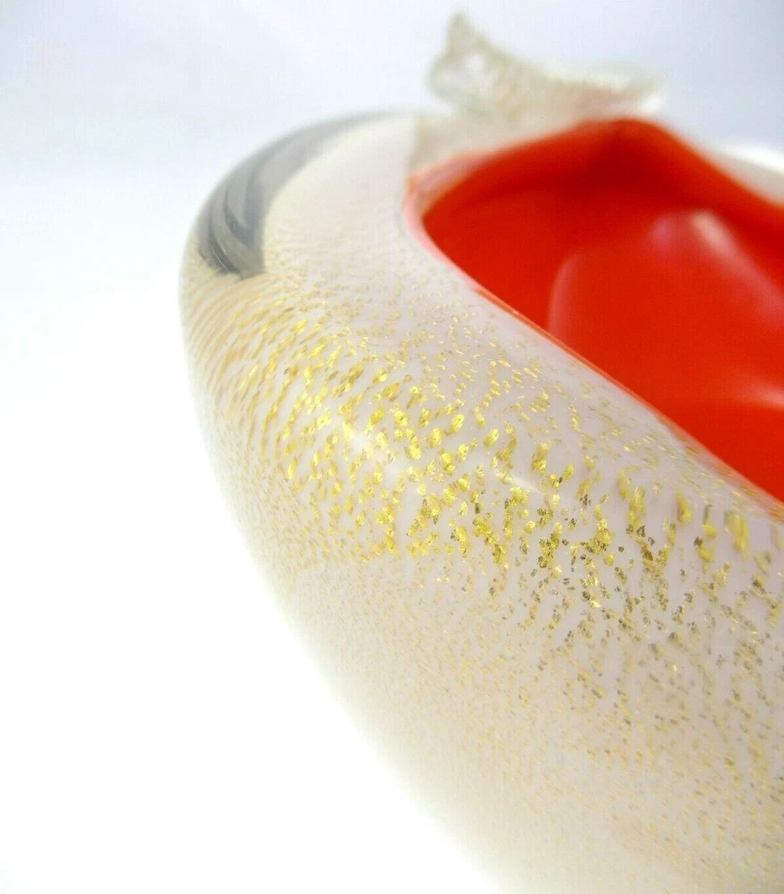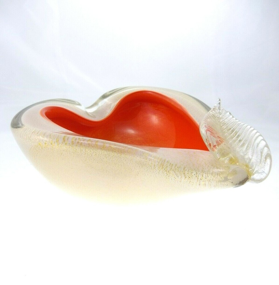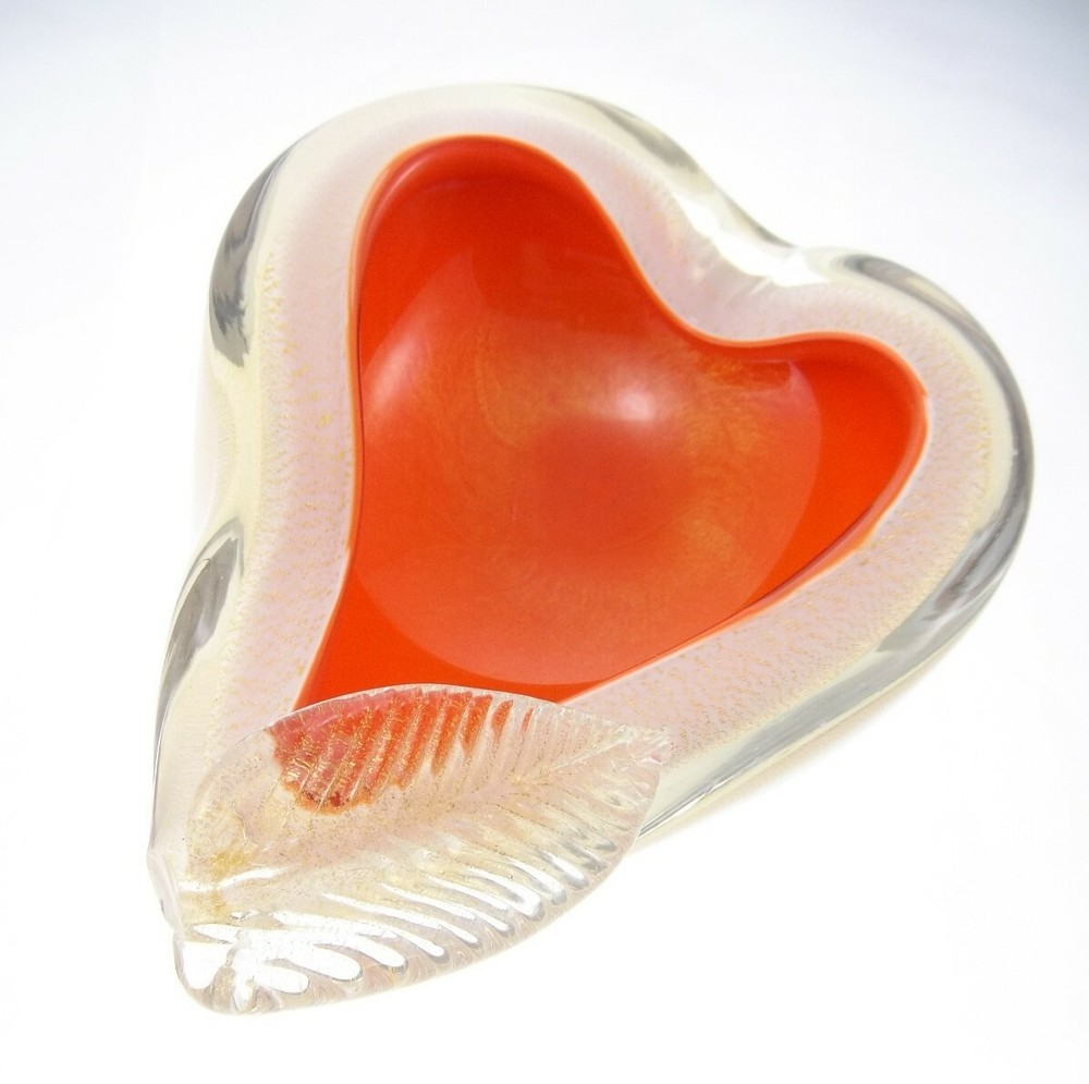 7" Alfredo Barbini Murano Gold Orange Pear Bowl Ashtray Mid-Century Glass. Slightly Damaged But Still Beautiful. There Is A Long Shallow Chip On The End Of The Leaf & The Stem Is Broken Off. Both Noticeable Only On Close Inspection. See Last 2 Photos.