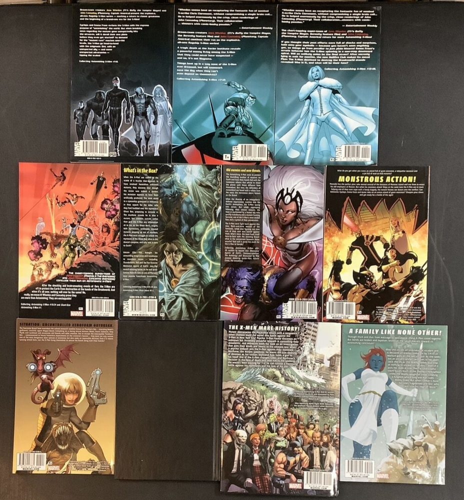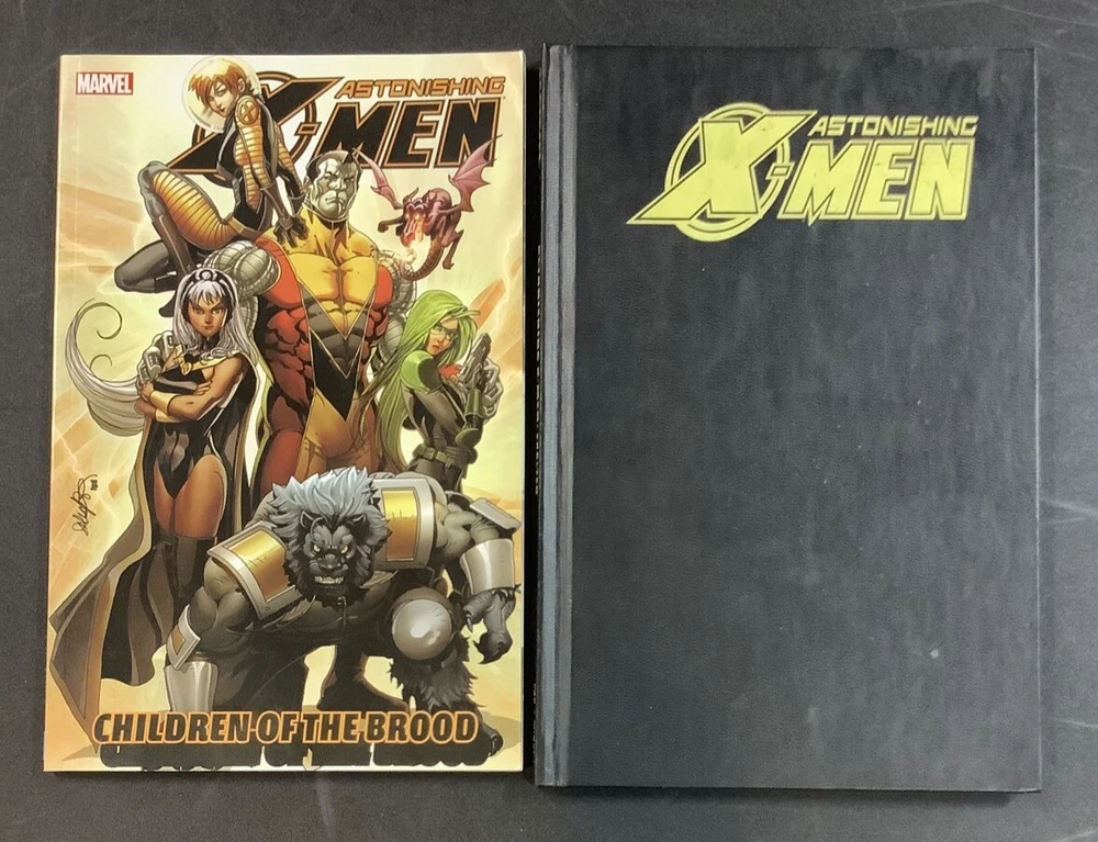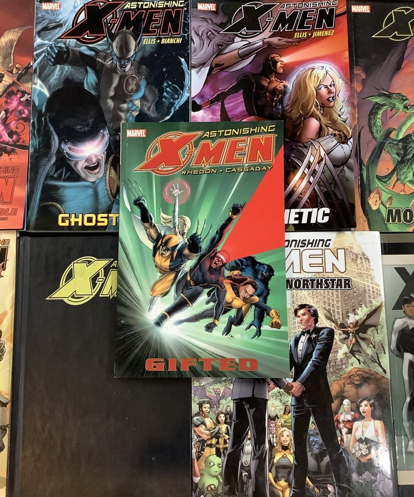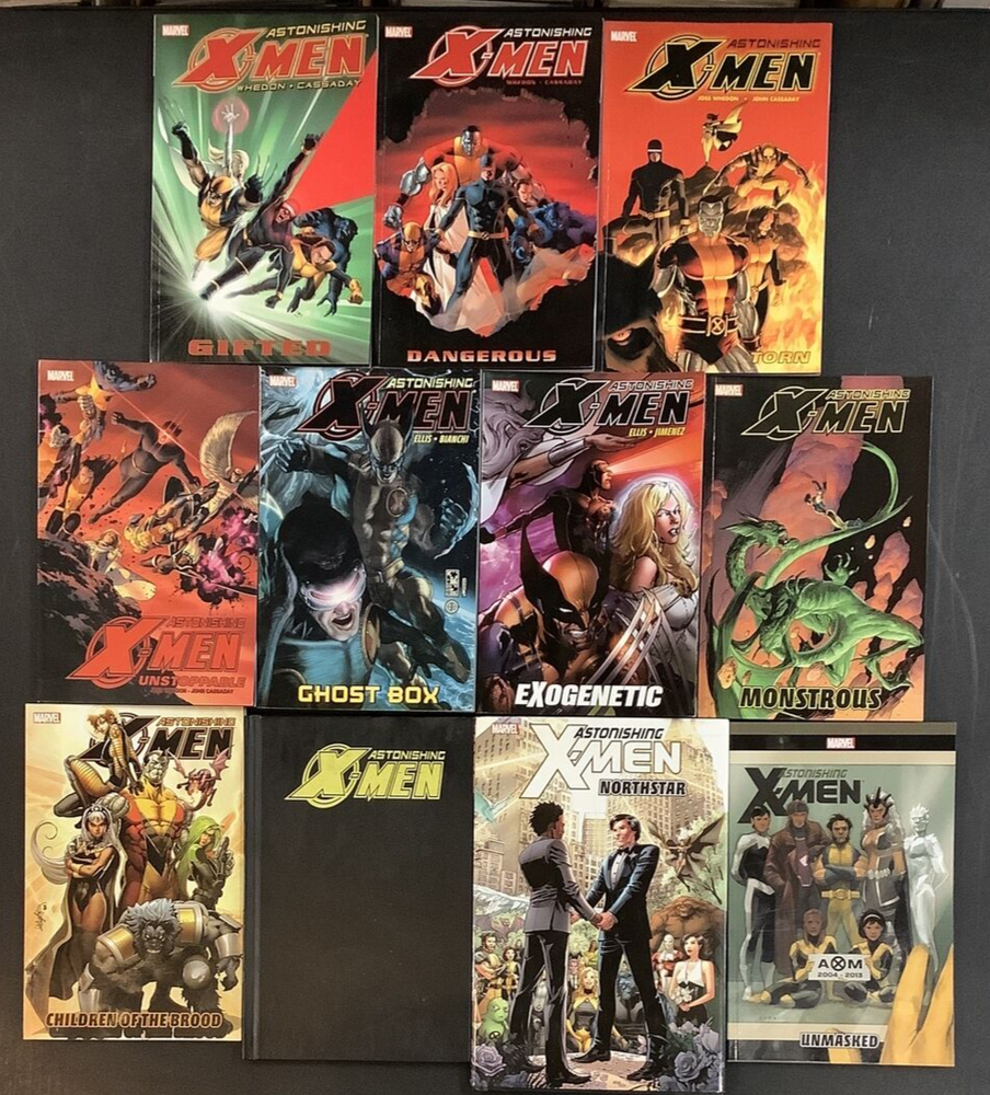 ASTONISHING X-MEN 11 VOLUME COLLECTED EDITION COMIC BOOK LOT FEATURING THE WORK OF JOSS WHEDON JOHN CASSADAY WARREN ELLIS & MORE This is a great lot for fans & collectors of the Astonishing X-Men. The winner of this lot will receive: ASTONISHING X-MEN VOL 1 GIFTED TP Written by JOSS WHEDON Pencils & Cover by JOHN CASSADAY Dream-team creators Joss Whedon (TV's "Buffy the Vampire Slayer") and John Cassaday (Planetary, CAPTAIN AMERICA) present the explosive, all-new flagship X-Men series - marking a return to classic greatness and the beginning of a brand-new era for the X-Men! Cyclops and Emma Frost re-form the X-Men with the express purpose of "astonishing" the world. But when breaking news regarding the mutant gene unexpectedly hits the airwaves, will it derail their new plans before they even get started? As demand for the "mutant cure" reaches near-riot levels, the X-Men go head-to-head with the enigmatic Ord, with an unexpected ally - and some unexpected adversaries -- tipping the scales! Collects ASTONISHING X-MEN #1-6. ASTONISHING X-MEN VOL 2 DANGEROUS TP Written by JOSS WHEDON Pencils & Cover by JOHN CASSADAY A tragic death at the Xavier Institute reveals a powerful enemy living among the X-Men that they could never have suspected - and no, it's not Magneto. Things heat up in a way none of the X-Men ever dreamed, but will teamwork save the day when they can't even depend on themselves? Collects ASTONISHING X-MEN #7-12. ASTONISHING X-MEN VOL 3 TORN TP Written by JOSS WHEDON Pencils & Cover by JOHN CASSADAY They're back! The chart-topping super-team of Joss Whedon and John Cassaday return for more Astonshing X-Men! If you thought their past efforts were full of shocks and surprises, hold onto your eyeballs - because you haven't seen anything yet, as things go from peculiar to just plain bizarre! Emma Frost's erratic behavior has the X-Men spinning in a non-stop downward spiral. Will an unlikely union be the final straw? After secretly lying in wait for months, the new Hellfire Club makes its move! Plus: The X-Man destined to destroy the Breakworld stands revealed! Who is it, and what will be their fate? Collecting ASTONISHING X-MEN #13-18. ASTONISHING X-MEN VOL 4 UNSTOPPABLE TP Written by JOSS WHEDON Pencils & Cover by JOHN CASSADAY Strap yourselves in, folks! It's Joss Whedon and John Cassaday's final arc on Astonishing X-Men! After the shocking and brain-smashing events of recent issues, the X-Men are off to protect the Earth from its destruction at the hands of the Breakworld. And when it's all over, nothing will ever be the same! No, really, we mean it! Whedon and Cassaday prove they are more than Astonishing: They are unstoppable! Collecting ASTONISHING X-MEN #19-24 and GIANT-SIZE ASTONISHING X-MEN #1. ASTONISHING X-MEN VOL 5 GHOST BOX TP Written by WARREN ELLIS Penciled by SIMONE BIANCHI, ALAN DAVIS, ADI GRANOV, CLAYTON CRAIN & KAARE ANDREWS Cover by SIMONE BIANCHI The X-Men are called to the scene of a murder that appears to have involved heretofore unknown mutants. The team's resident scientist, Beast, discovers that though the victim was indeed a mutant, his mutation appears to be artificially produced. The team races to a spaceship graveyard in Indonesia in their search for the murderer, who they find huddled over the mysterious Ghost Box, preparing to activate it. The murderer reveals himself to also be a mutant, but commits suicide rather than give the X-Men any information as to his, or the Ghost Box's, origins. With mysterious, artificially created mutants popping up out of nowhere, the X-Men must struggle to unlock the mysteries of the Ghost Box: What is the device's purpose, and why was it sent to Earth? Collecting ASTONISHING X-MEN #25-30 and GHOST BOXES #1-2. ASTONISHING X-MEN VOL 6 EXOGENETIC TP Written by WARREN ELLIS Penciled & Cover by PHIL JIMENEZ When the director of an intergalactic defense organization crashes into the Earth's atmosphere, the Astonishing X-Men spring into action. But while regrouping following their rescue mission, the team is confronted by a former ally who quickly transforms into a mutant-hunting Sentinel, one of the X-Men's most reviled foes and a symbol of their persecution. The X-Men must fight back against this new, flesh-and-bone version of the Sentinels, while also figuring out how one of their own was turned against them. What's more, the team finds itself face-to-face with the monstrous aliens known as the Brood. What is the connection between these attacks? And will it prove too much from the X-Men to handle? Collecting ASTONISHING X-MEN #31-35 and material from ASTONISHING X-MEN/AMAZING SPIDER-MAN: THE GAUNTLET SKETCHBOOK. ASTONISHING X-MEN VOL 7 MONSTROUS TP Written by Daniel Way Art by Jason Pearson & Various Cover Art by Michael William Kaluta What do you get when you cross an island full of giant monsters, a telepathic terrorist and a jet full of mad-as-hell mutants? Monstrous action! Mentallo has the perfect plan: take mental control of the denizens of Monster Island and use them to extort his old employers at Roxxon. But when his monsters attack Tokyo at the same time the X-Men are in town helping one of their own cope with a family tragedy, the mutant heroes are drawn into the conflict. Can Wolverine, Cyclops, Emma Frost and Armor take on an entire island of giant monsters? Sharpen your claws, and get ready for a battle of the ages! Collecting ASTONISHING X-MEN (2004) #36, #37, #39 and #41, and material from STRANGE TALES (1951) #89. ASTONISHING X-MEN VOL 8 CHILDREN OF THE BROOD TP Featuring the work of: Salvador Larroca, Christos Cage, James Asmus, David Yardin & more The fearsome Brood have overtaken the orbital research satellite known as Pandora's Box - stranding Beast's girlfriend, S.W.O.R.D. agent Abigail Brand. Embarking on a daring rescue mission, Beast, Storm, Colossus, Kitty Pryde and Lockheed will encounter old friends and older enemies. But to escape the inescapable Pandora's Box - commissioned to house hazardo