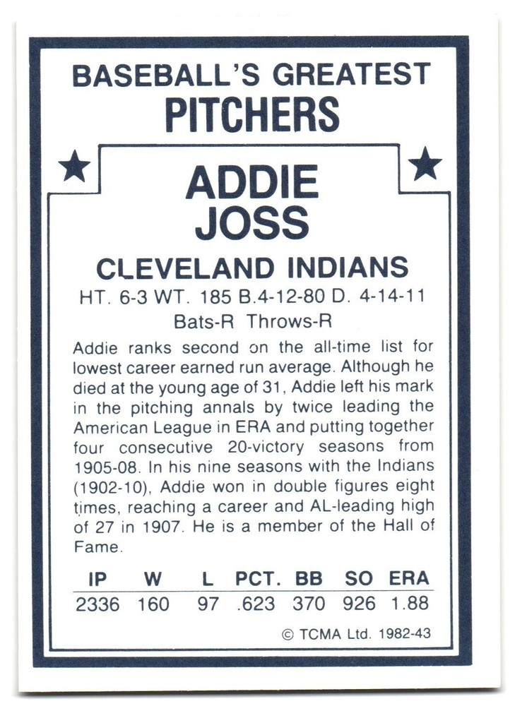 Addie Joss 1982 TCMA ML Baseball Pitchers Sluggers Card #43. This card is in EXMT condition. You can use the scan to judge for yourself. Any significant variations from the following conditions will be noted above. ***** Shipping for all purch ases United States of America Insurance Registered or Priority Mail is available at buyer's request. ***** Calculated-International Shipping. First Class International Only. Insurance & Registered or Priority Mail is available at buyer's request. All purchases are shipped within 1 day. Please feel free to ask us any questions you may have and thank you for looking. *****