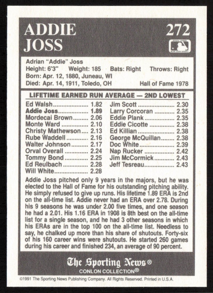 You will receive a Near Mint or Better, Addie Joss 1991 Conlon Collection TSN #272 Cleveland Indians card Please note, we are not a professional graders and the condition of a raw card is highly subjective. Please refer to the high quality scans of the card included in this auction to determine the condition of the card for yourself. Any questions, please just ask! All cards are in EX - NM+ condition, unless stated otherwise. Chrome cards from various brands might have minor light surface scratches, which is typical with these types of cards. Any major, deep scratches will be noted, if present. Coupons and other discounts will not apply to Accepted Offers. We take pride in the condition of all our cards, including commons. Our promise to you is, we would not sell a card in a condition we would not want to receive ourselves! We are also very proud of our shipping standards, and all cards, including commons will come in a penny sleeve and very well protected! Please check out our other Sports Cards listings, as the more you buy, the buy you save! Be sure to save us as a Seller, as we are always growing, and listing cards daily! Listed with Card Dealer Pro Use the code " MSC " when signing up to Card Dealer Pro to receive 500 FREE Scans!