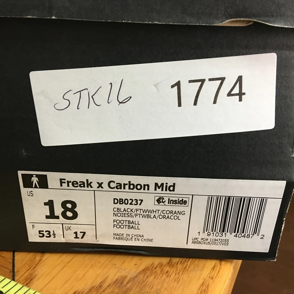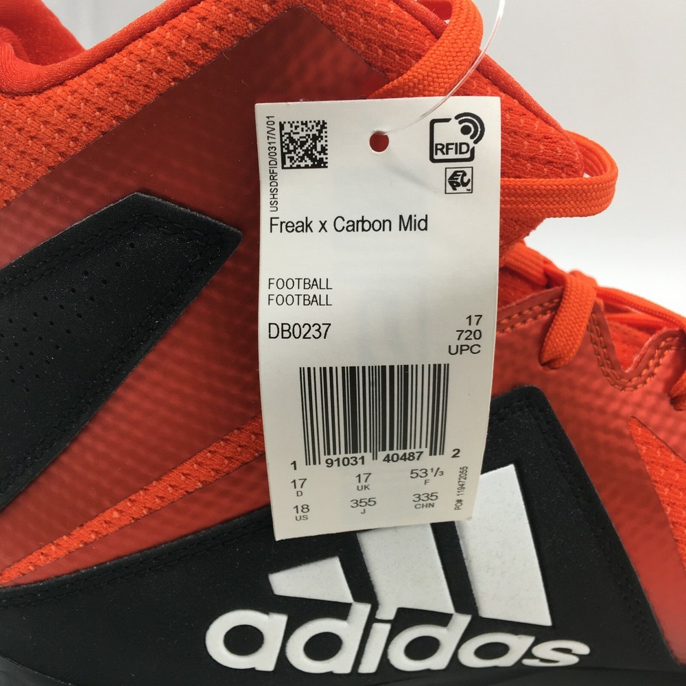 Adidas Freak X Carbon Mid Mens Football Orange Black DB0237 Cleat Shoes Size 18 Brand: Adidas Department: Men Type: Cleats Sport: Football Color: Orange US Size: 18 UK Size: 17 Model: Freak X Carbon Mid Style Code: DB0237 Country/Region Of Manufacture: China Condition: New With Tags 100% GENUINE ? U S A SELLER Check out MY FEEDBACK! PROFESSIONAL SHIPPING! PLEASE NOTE: Please look at the measurements before purchasing. If you're not sure about the size, flat lay a similar item of your own and measure that item to compare with our measurements. This definitely helps in deciding if the item is the right size. Return Policy If your item does not fit, we do accept returns within 30 days. Please note, the item must be returned in the exact same condition as it was received. We request that you select "Item does not fit" when returning an item that does not fit. Thank you! Please see pictures for an accurate description of the item and condition