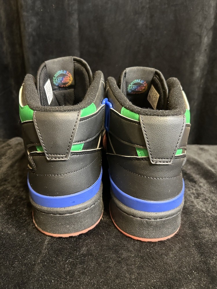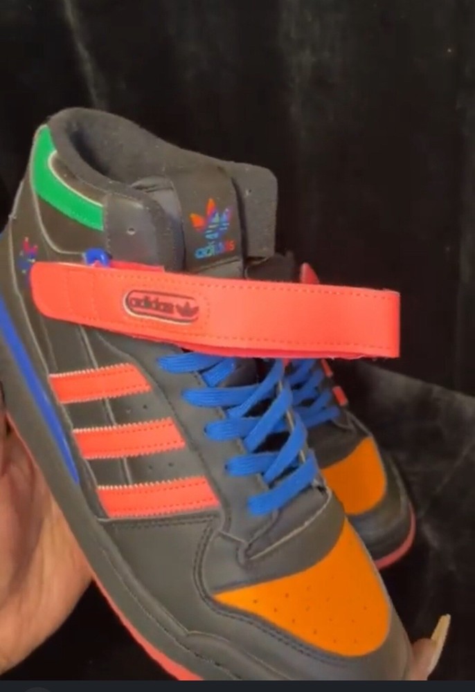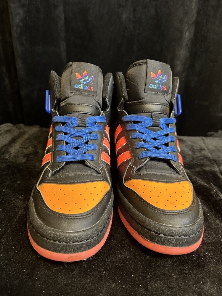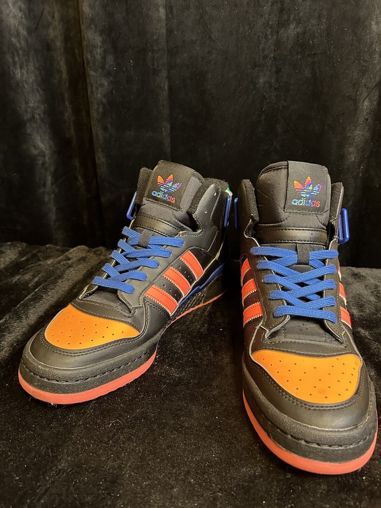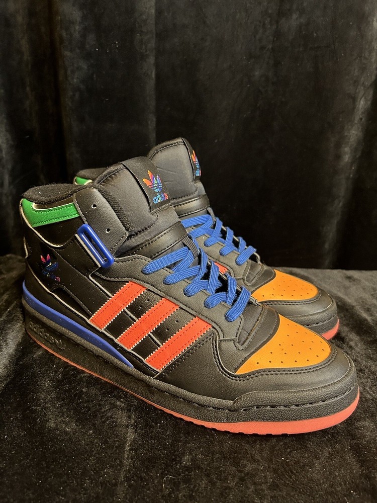Elevate your sneaker game with these Adidas Forum Mid kicks in black, orange, pink, and blue. Designed for men, these athletic shoes feature a stylish and comfortable mid-top silhouette that's perfect for any occasion. The brand's signature three stripes can be found on the sides, while the model name is embossed on the tongue. These sneakers are sure to turn heads and make a statement with their unique colorway. Whether you're playing sports or simply running errands, these Adidas Forum Mids will keep you looking and feeling great.