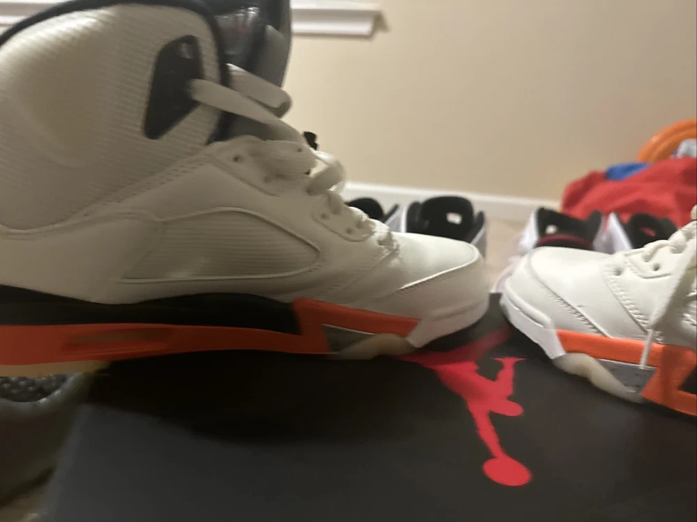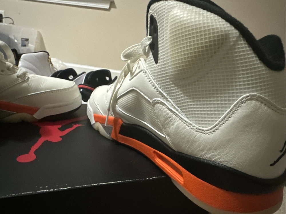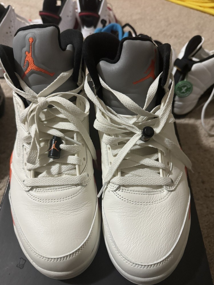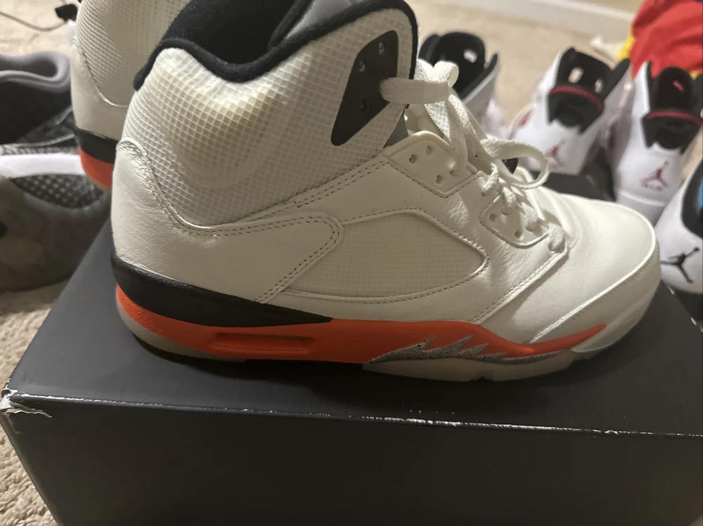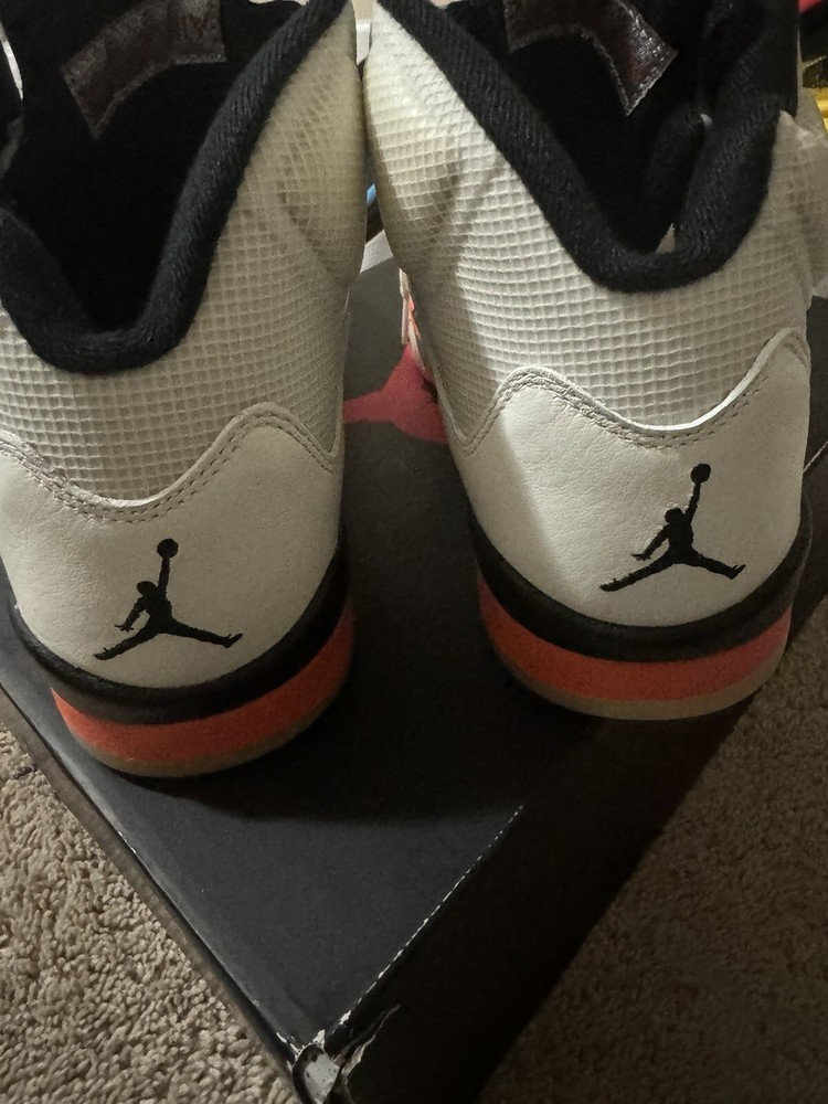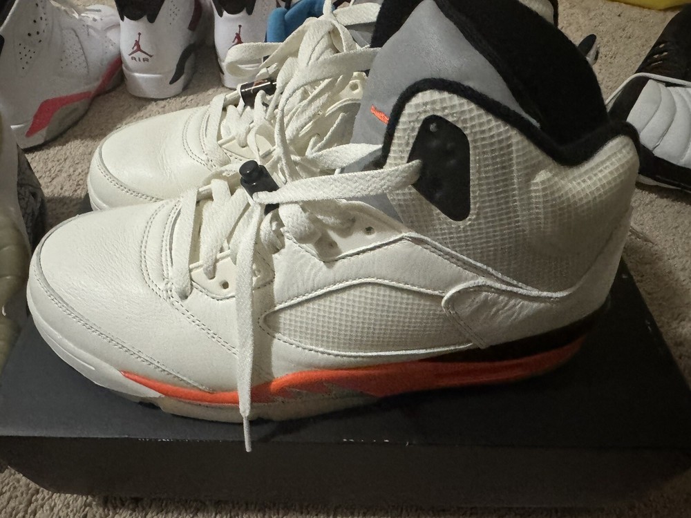 This pair of Air Jordan 5 Shattered Backboard sneakers is a must-have for any collector or fan of the iconic brand. The mid-top silhouette features a white colorway with accents of orange and black, paying tribute to the Shattered Backboard moment from Michael Jordan's exhibition game in 1986. Crafted with premium materials, these sneakers are designed to provide both style and comfort. They are perfect for athletic activities or casual wear. The shoes come in a size 10.5, and are ideal for men who appreciate high-quality footwear. Add these Air Jordans to your collection today and step up your shoe game!