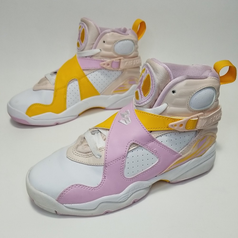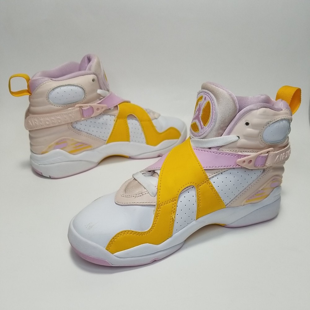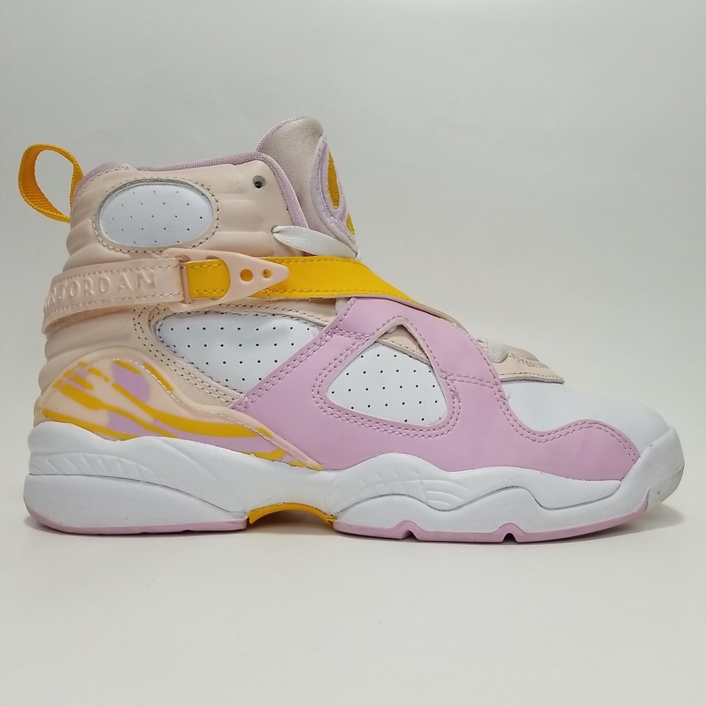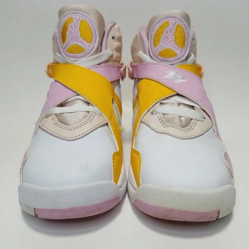 Air Jordan 8 Retro GS Kids Sneakers size 4Youth Orange Pearl Arctic Pink 580528 816, white leather upper with perforated sides, pink and orange leather cross-strap, rubber overlays on heels, foam midsole, heel air-sole unit rubber sole. Shows light wear out and few light scratches, in good condition. See photos for more details. PREOWN.