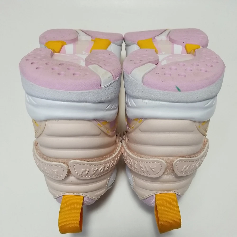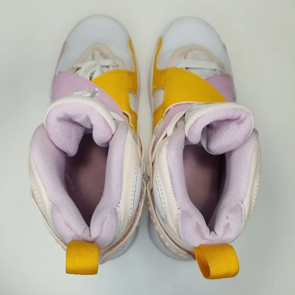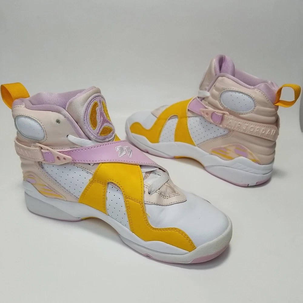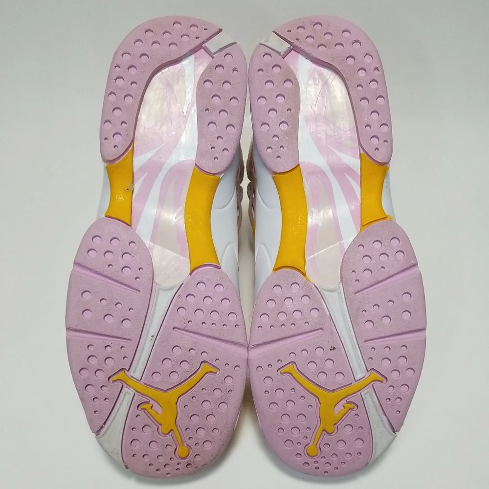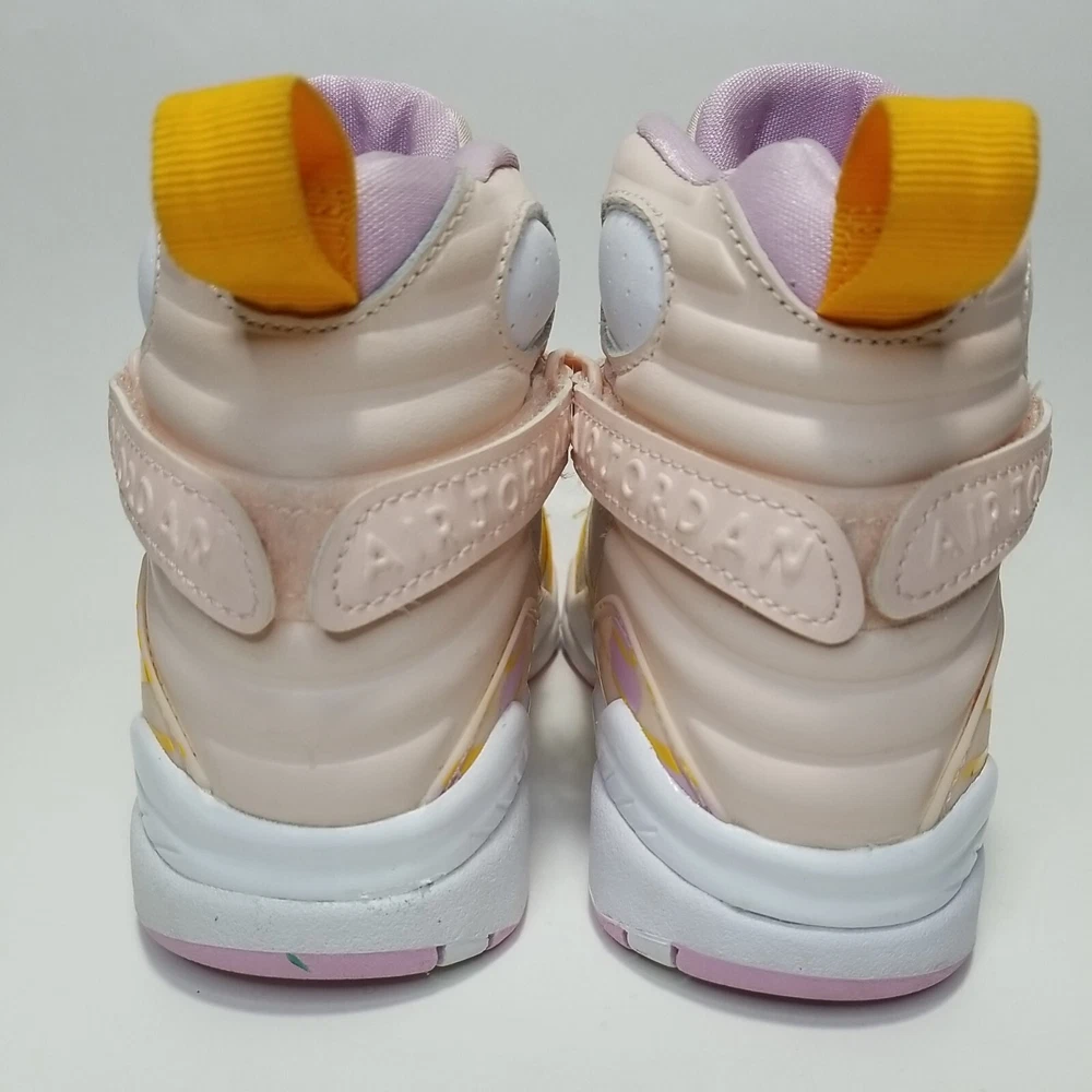 Air Jordan 8 Retro GS Kids Sneakers size 4Youth Orange Pearl Arctic Pink 580528 816, white leather upper with perforated sides, pink and orange leather cross-strap, rubber overlays on heels, foam midsole, heel air-sole unit rubber sole. Shows light wear out and few light scratches, in good condition. See photos for more details. PREOWN.