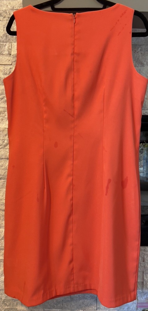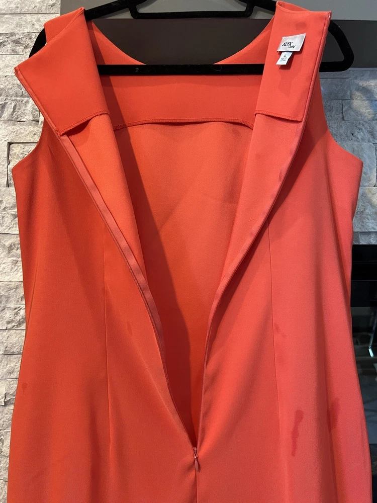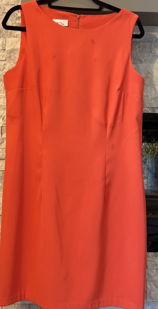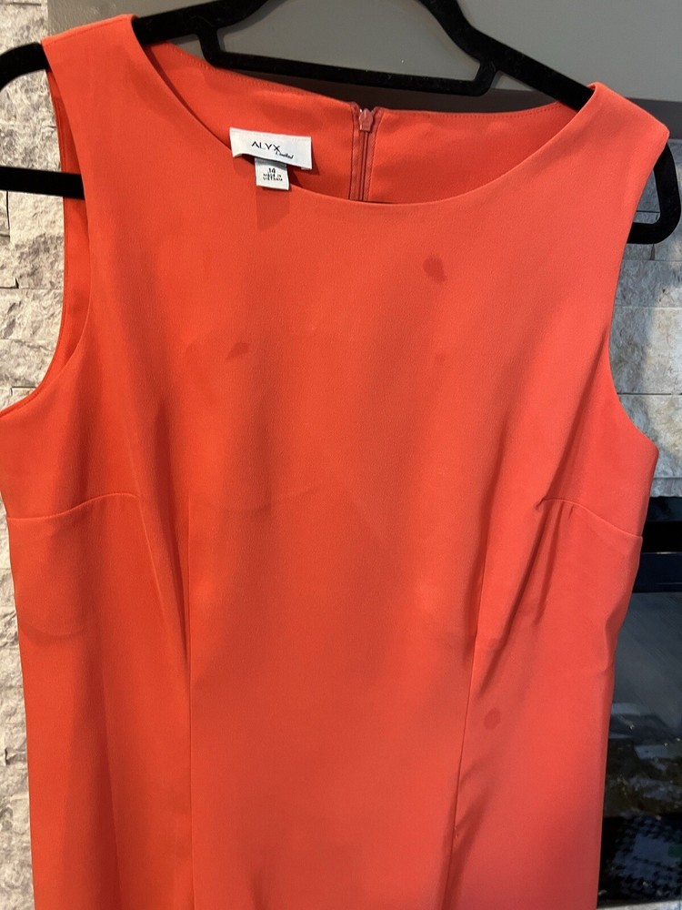 Alyx Orange dress with zipper closure in back Sleeveless size 14 Shoulder strap to strap 14 in Armhole opening 8 in Armpit to armpit width 19 1/2 in Waist 18 1/4 in Length 35 in Excellent condition...