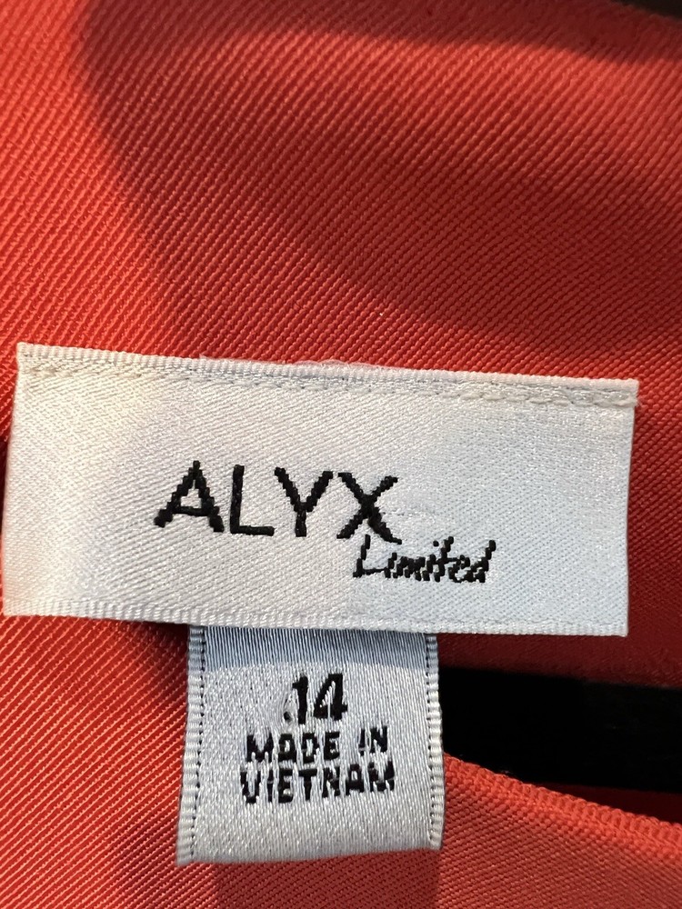 Alyx Orange dress with zipper closure in back Sleeveless size 14 Shoulder strap to strap 14 in Armhole opening 8 in Armpit to armpit width 19 1/2 in Waist 18 1/4 in Length 35 in Excellent condition