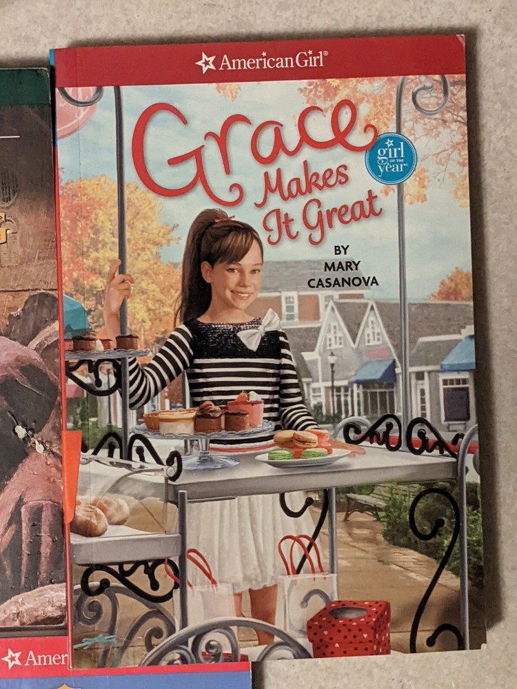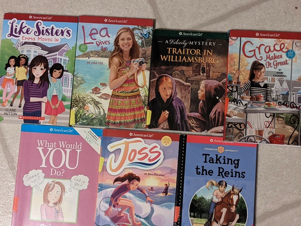 American Girl Books lot of 7 Joss Grace Makes it Great, Like Sisters, Lea Dives. Some books have stickers Joss Taking the Reins What would you do? Traitor in Williamsburg Grace makes it Great Like Sister Emma Moves in Less Dives in