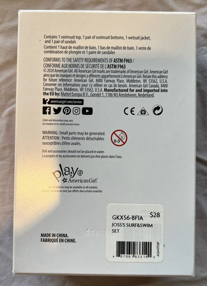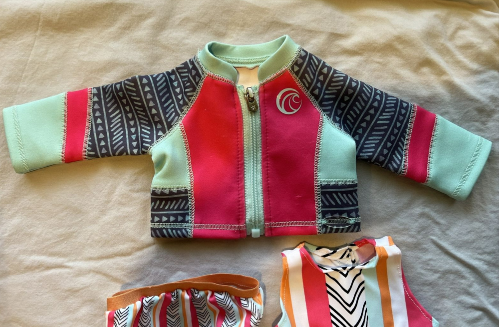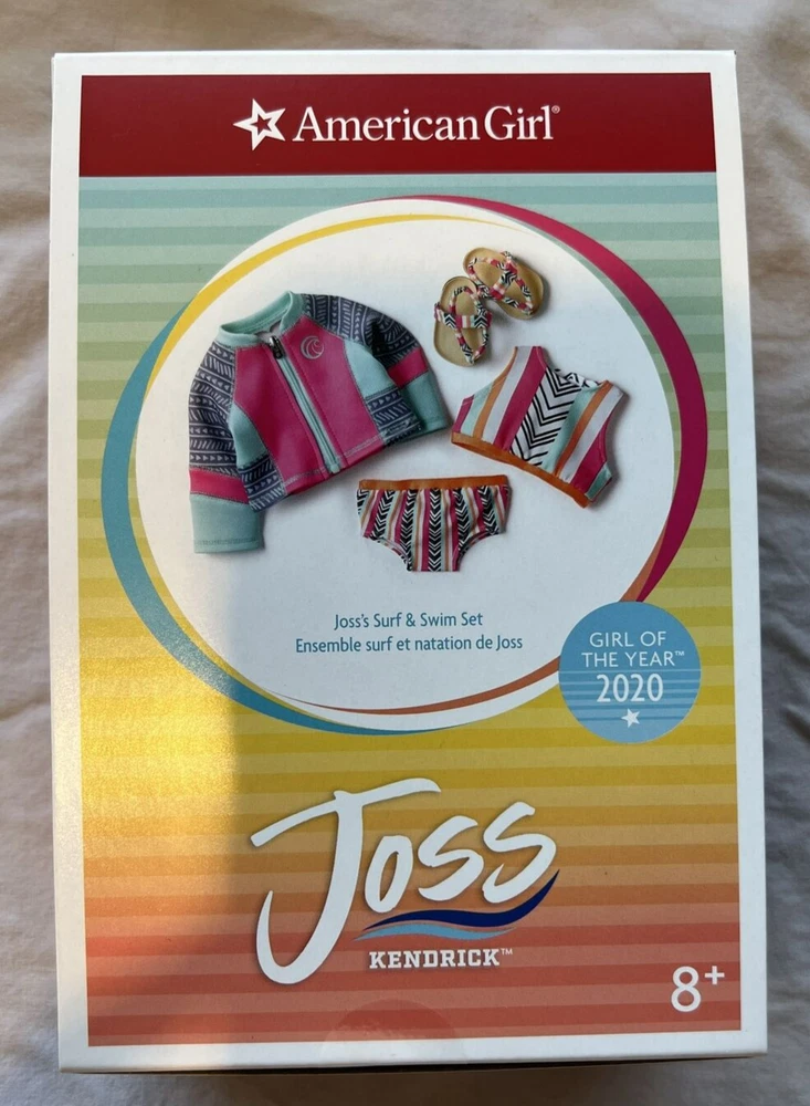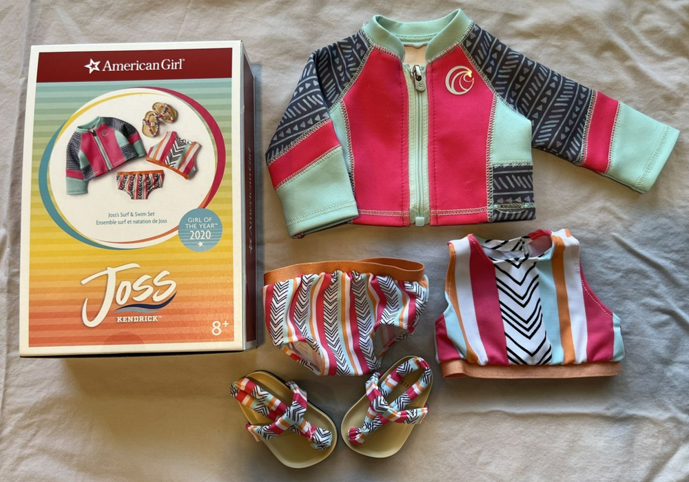 American Girl Joss Kendrick Joss’s Surf & Swim Set COMPLETE SET INCLUDES: 1 Swimsuit Top, 1 Pair of Swimsuit Bottoms, 1 Wetsuit Jacket, and 1 Pair of Sandals Comes with original box Used, but in good clean condition I will combine shipping. Please put all your items in your cart & click Buy Now. BUT DONT PAY. At this point, send me a message and I can send you an invoice with the total cost, including combined shipping. I cannot combine shipping once you pay for the item.
