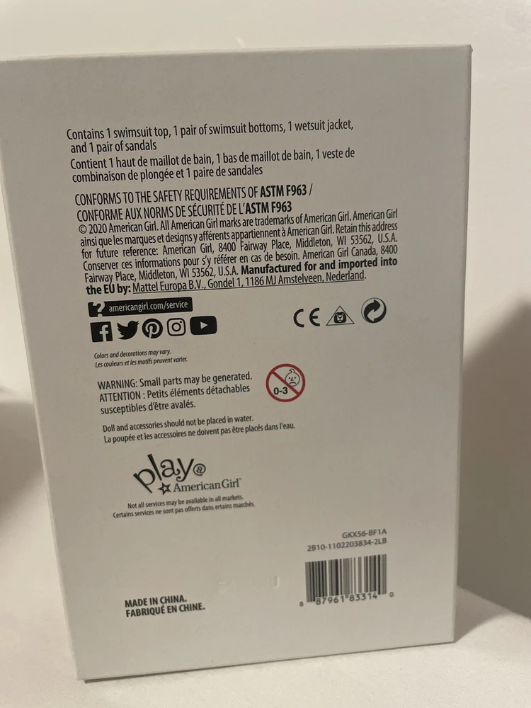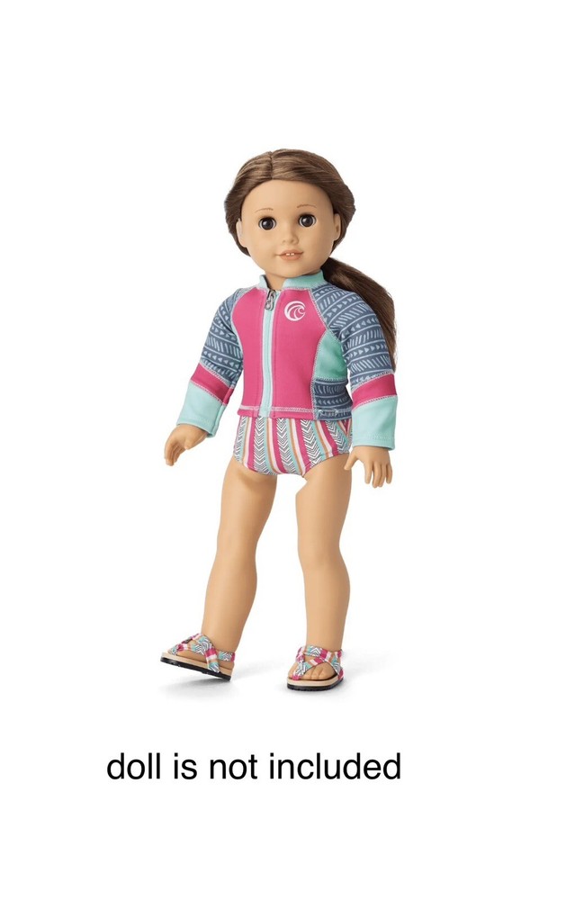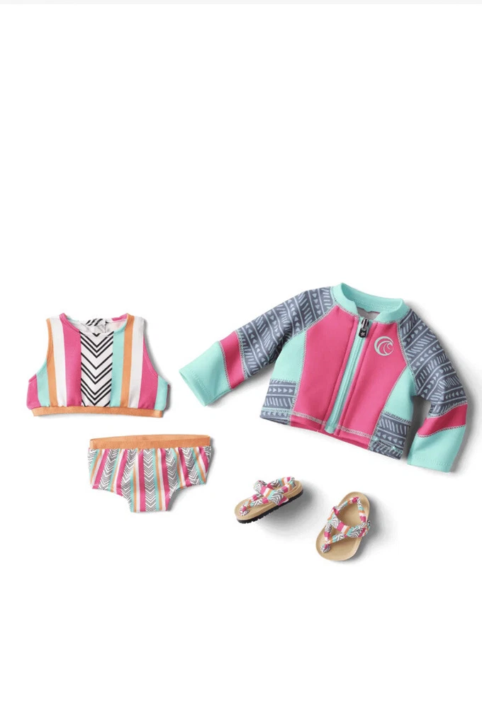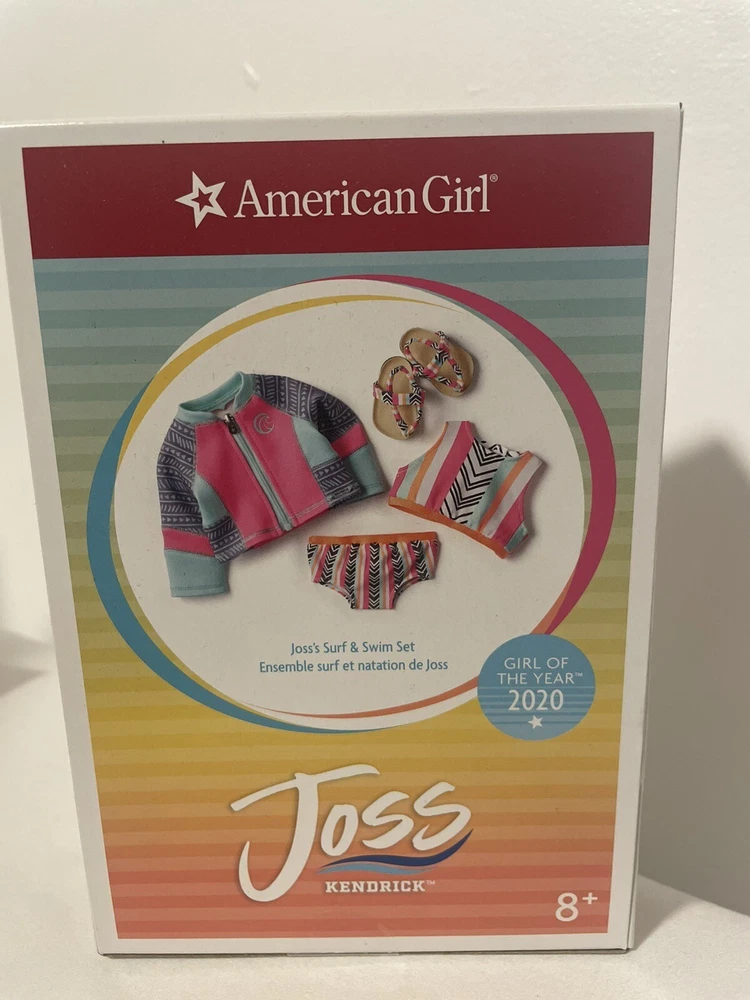 Brand new in box. From girl of the year 2020. Joss would love to spend every day at the Break, the beach near her house. Whatever the season or condition, she's ready to hang with friends or hang ten. Outfit includes: -A high-neck swimsuit top and bottom with a geometric pattern she can wear while catching waves -A zip-front wetsuit jacket she wears to help her be more buoyant in the water and to protect her from scrapes, stings, and sunburn -A pair of sandals that match her swimsuit From smoke free and pet free home.