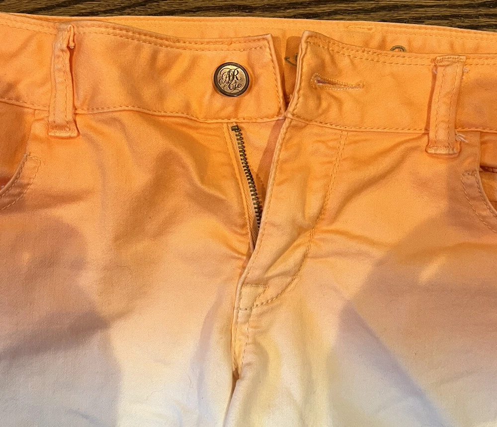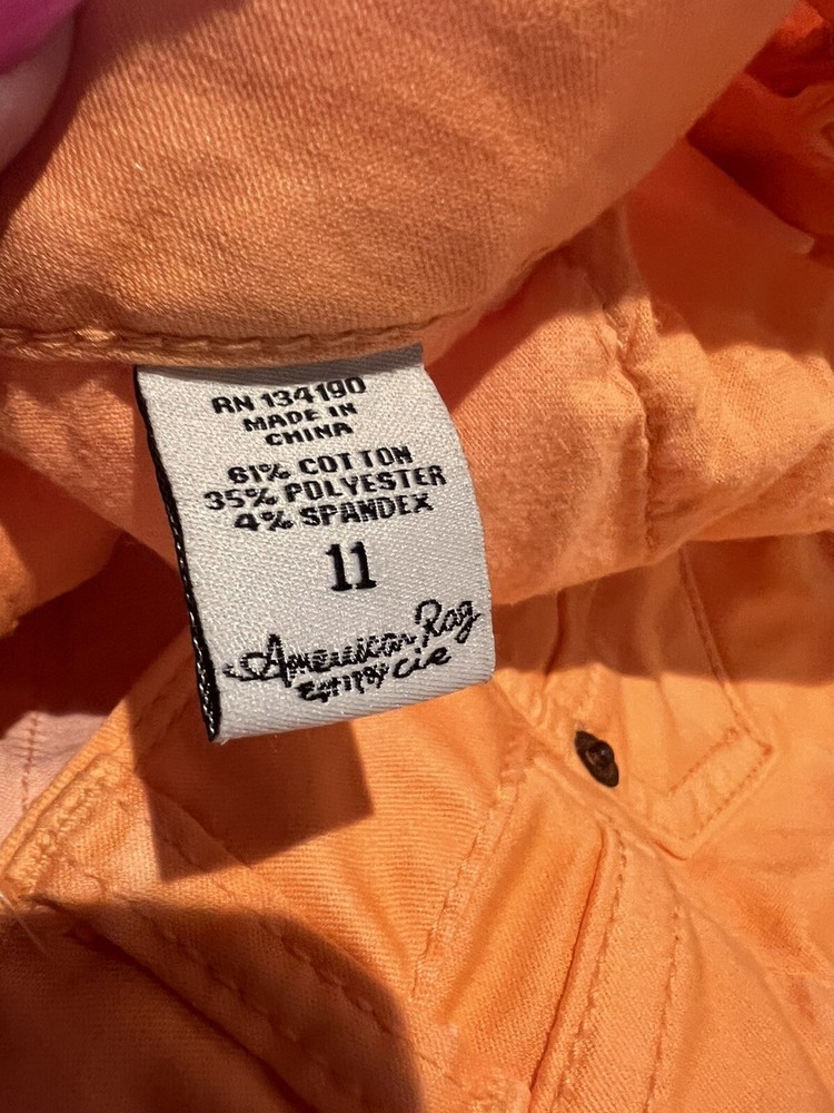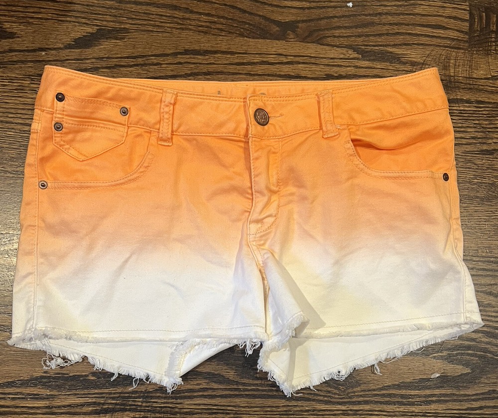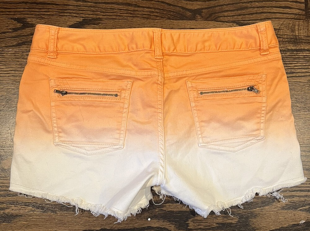 American Rag Orange White Ombré Back Zip Pockets. Juniors Size 11. Brand: American Rag Size: 11 Color: Orange, White These soft orange and white ombré shorts are perfect for summer! Two front pockets and 2 back pockets with zipper closure. Zip and button front closures. Measurements: Wasit 17" Length: 11" Rise: 10.5"