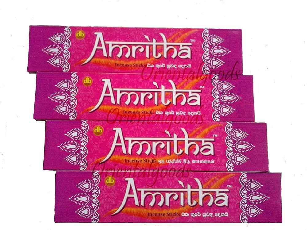 Amritha incense sticks Irrespective of how technology grows, the fragrance of the incense sticks has no competitors that can bring out a sense of composure and calmness. The aroma of the incense sticks energizes our surroundings, lifts up our sprites and reconnects with a world that is close to nature. With Amritha Aromatics, it is a mini vacation you can experience, the favors of the lavender field, the scent of the huge pine trees, the ambiance of the rain forests or a particular little herb or flower. Apart from the incense sticks that burn clean, the scents have captivating and incense aroma Amritha incense sticks are unique because of 2 in 1 incense sticks which you can experience two aromas from one incense sticks. Item Description One of the classic incense brands Amritha incense is full of fragrance. • Amritha products are made with the highest quality raw materials. • 1 Package incense sticks. • You get pure incense, not burning wood Burn Time: Approx. 20 Minutes per stick. Weight: 30g per box How to Use: Once the end glows, blow out the flame and place in one of many Incense Holders.