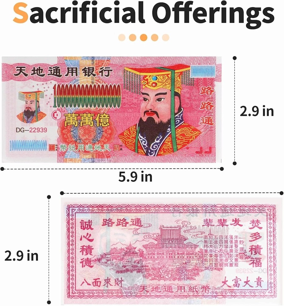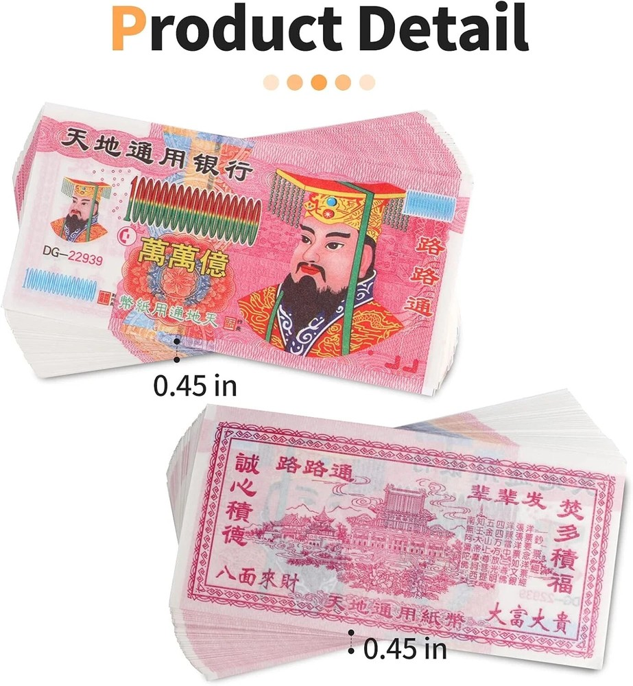 100% Money Back Guarantee if you are not satisfied with your purchase! ___________________ Description: Ancestor money has synonyms known as spirit money, Joss paper, hell money, heaven notes, etc. The desired vision was that the most beloved family members who passed away can use this "note" in another world to make a better living and seek love again. In worldwide culture, we burn joss paper for ancestors on special holidays.Take it for granted to use : Funerals, Tomb-sweeping day, Anniversary of ancestor's death, All Souls Day, Obon Festival. The day you concerning, bone-deep missing and mourning for them. Not only living people can perceive and deliver, but also those spirits clearly sensed by ancestor money burners. The whole process is actually an spiritual information exchange. Such communication and fund donation to ancestor can be viewed as a blessing . Packing and weighing well : 2 bundles, a bundle of 100 sheets. Each sheet measures about : 15.3x7.5 cm. This currency is very colorful and bright in color. very easy to be burnt completely. Please note:Paper money is not legal tender currency issued by any bank or government institution and holds no cash value. ________________________ 100% Money Back Guarantee: We offer 30 Day Money Back Guarantee from the day you purchased if you’re not satisfied with your product. If you have any questions about our products, please contact us as soon as possible. Customer satisfaction is our absolute priority. Shipping: We are always working hard to ensure your package arrives as soon as possible. Please understand that some factors like weather, high postal traffic, and the performance of shipping companies are outside of our control. We offer free shipping to the lower 48 states and ship within 3 business days of payment, usually sooner. We do not accept P.O. Boxes. Please provide a physical address. You will be notified via eBay messages as soon as your items ship. Delivery: We will ship out the item in 2-3 working day after receiving the payment. Usually the delivery takes 2-5 business days. If you don't receive the items after 10 days, please feel free to contact us. You will get a replacement or a full refund. Please DO NOT open a return request or leave negative feedback without asking for help. Returns (Get Free Return Label): We offer a 30-Day Return Policy on defective/wrong items or items which you are not completely satisfied with. You have the option for a full-refund or an exchange of the item. No need to buy eBay return label. Contact us via eBay messages and get free return label. Returned items must be in all of the original packaging and include all of the original accessories or items that came with it. The item and package should be in original condition. Contact Us: Any queries or issues incurred, please feel free to contact us via eBay message, we will get back to you within 24 hours. Please DO NOT open a return request or leave negative feedback without asking for help. Feedback: Your feedback is very important to us. After you get your package and you are satisfied with our service, please leave us positive feedback. We are highly appreciated for your POSITIVE feedback and 5 stars. Enjoy shopping.