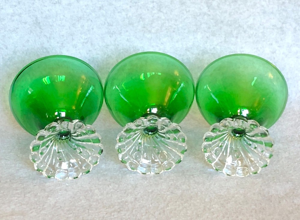 Up for sale is a lot of three (3) of Anchor Hocking Glass Company 'Inspiration' large stemmed sherbet bowls each measuring 4" high by 3.75" wide at the rim. These sherbets, made in the 1950's, are in excellent (possibly unused) condition with no chips, cracks, or scratches. This pattern is also sometimes called 'Boopie' or 'Burple' by collectors.