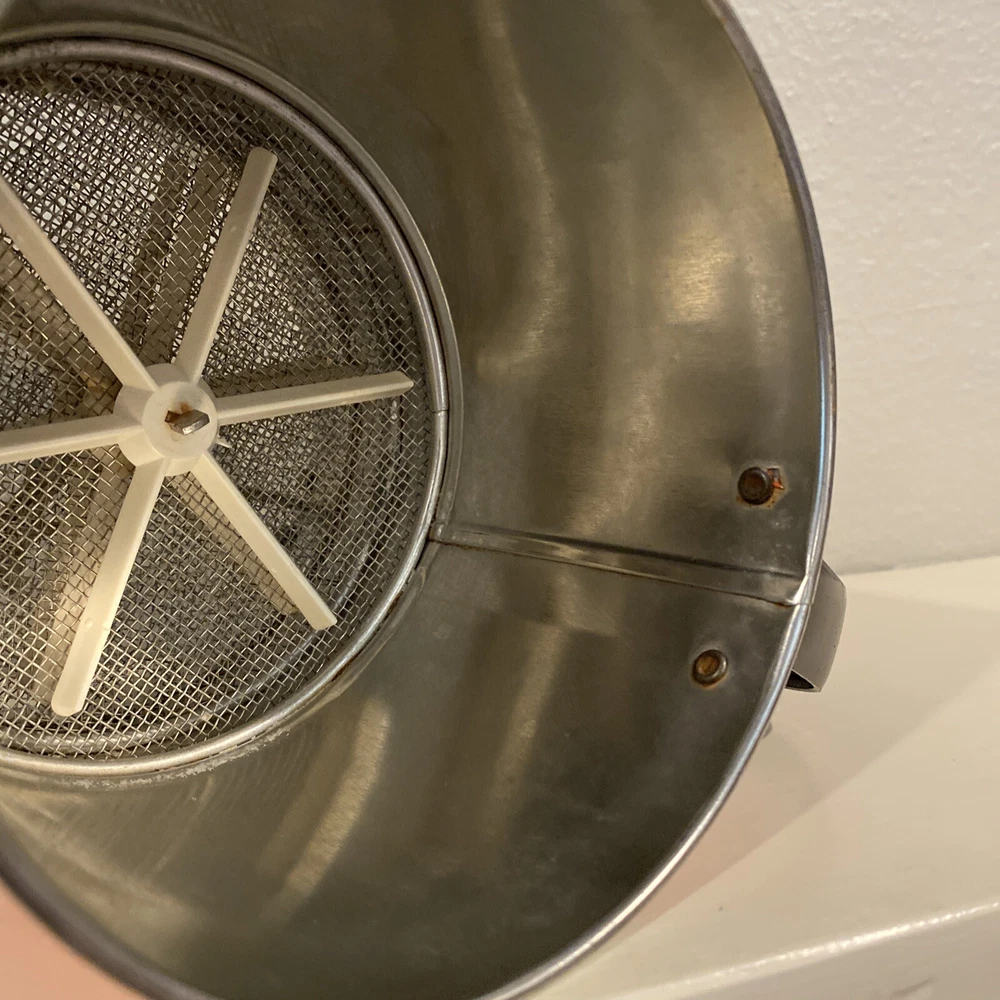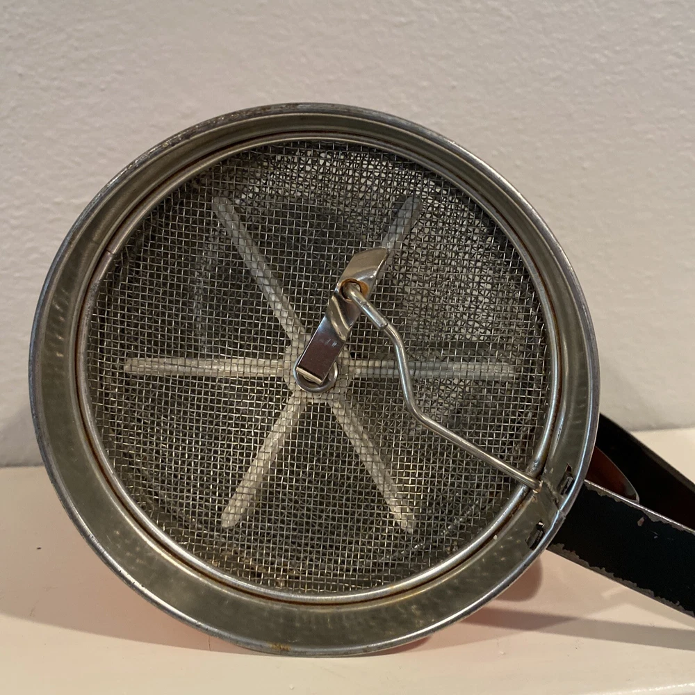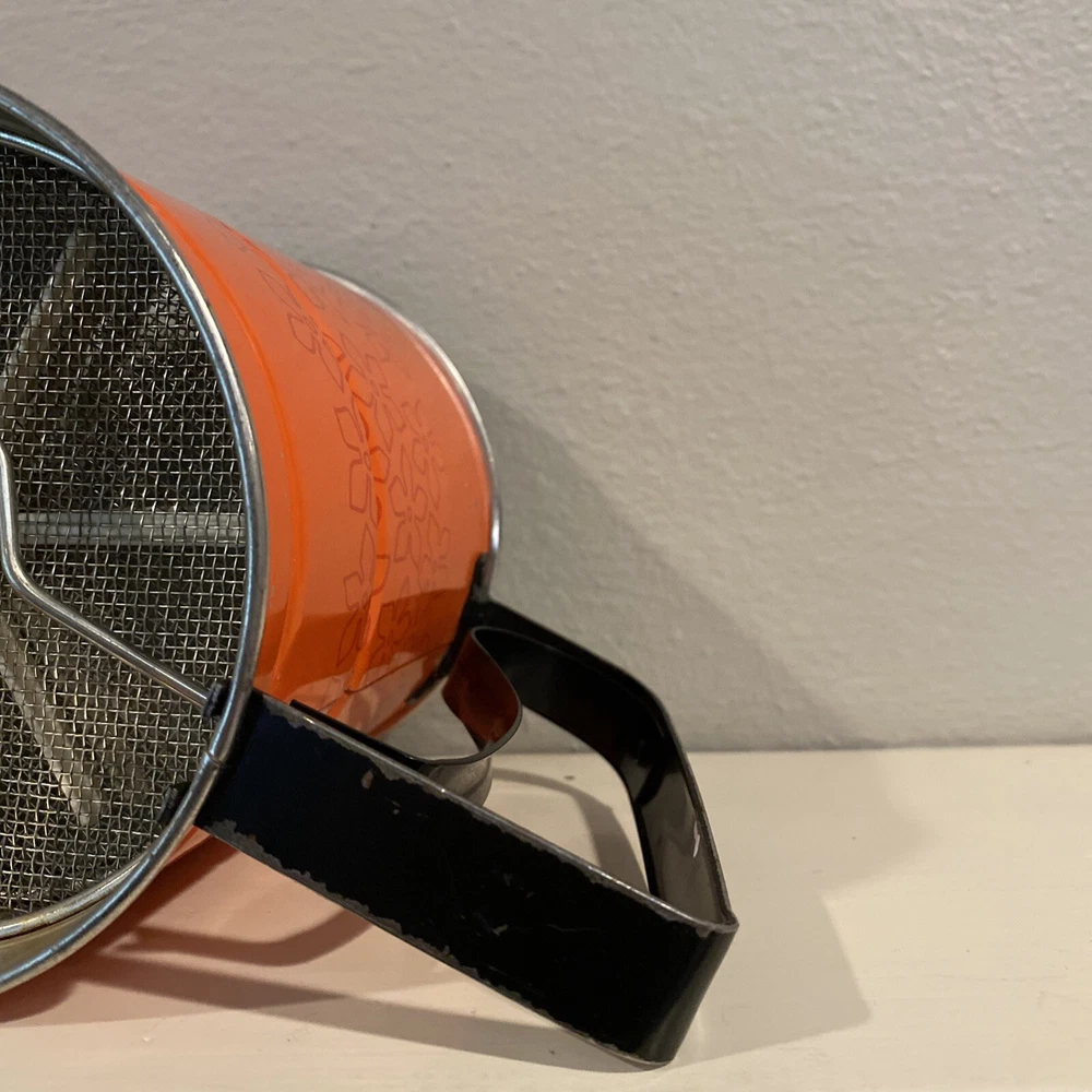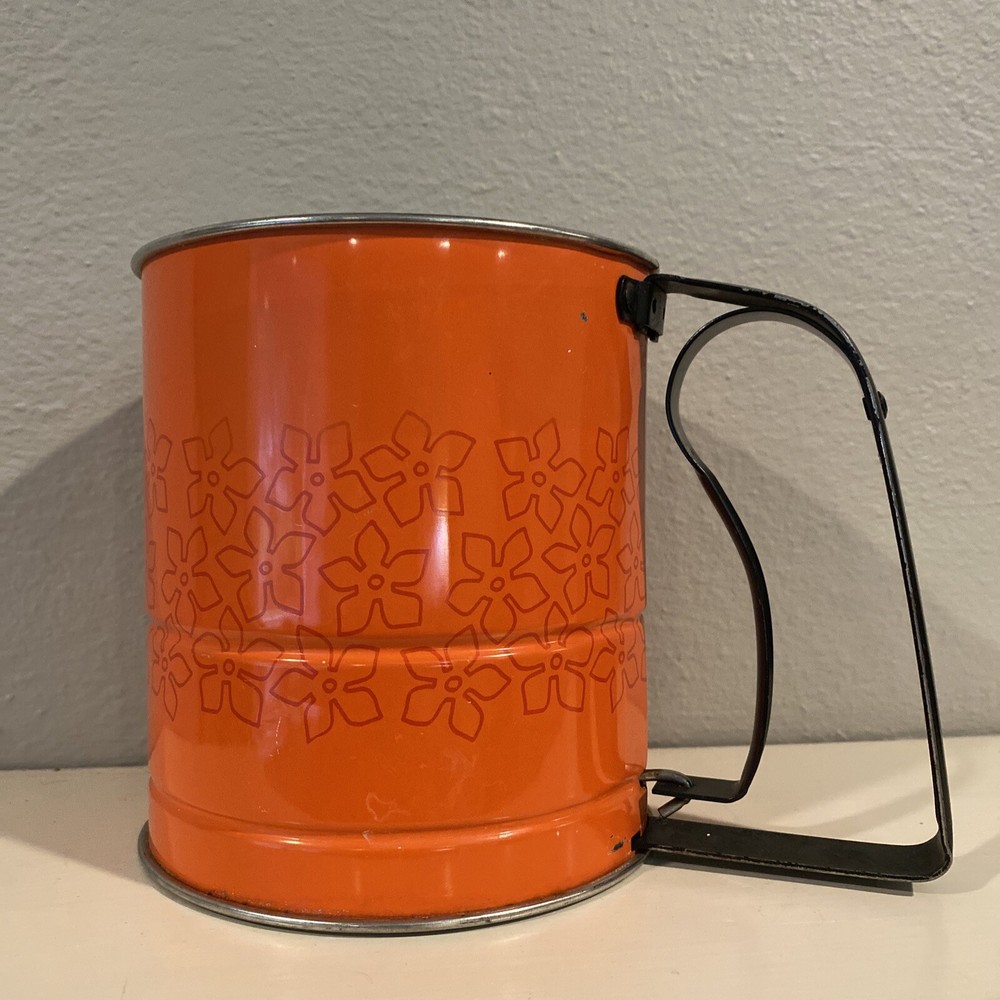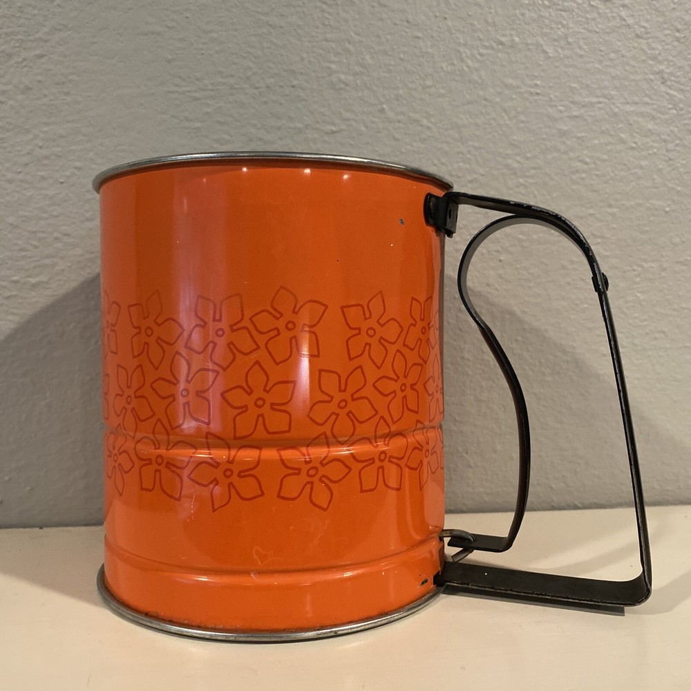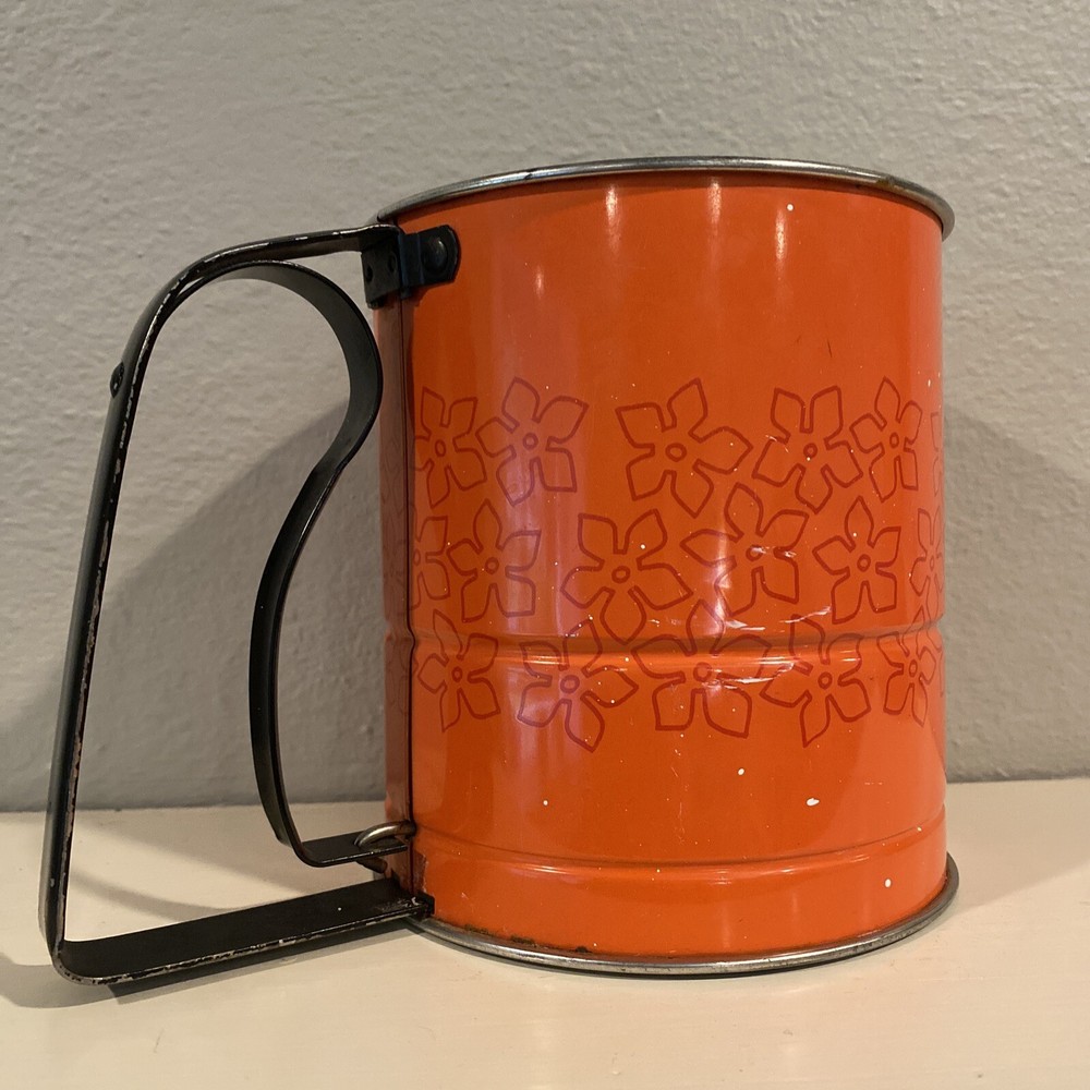 Vintage flour flower sifter in epic atomic red, good vintage condition, no major rust issues, but the sifter and handle shows wear to the paint as expected with pre-loved, vintage items. This sifter is adorable, and still works! Use it to sift flower all day then display in your mid century kitchen. Please review pictures carefully as they are part of the description. I am happy to answer questions. Thank you!