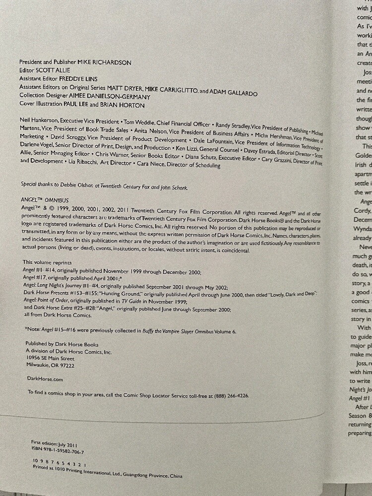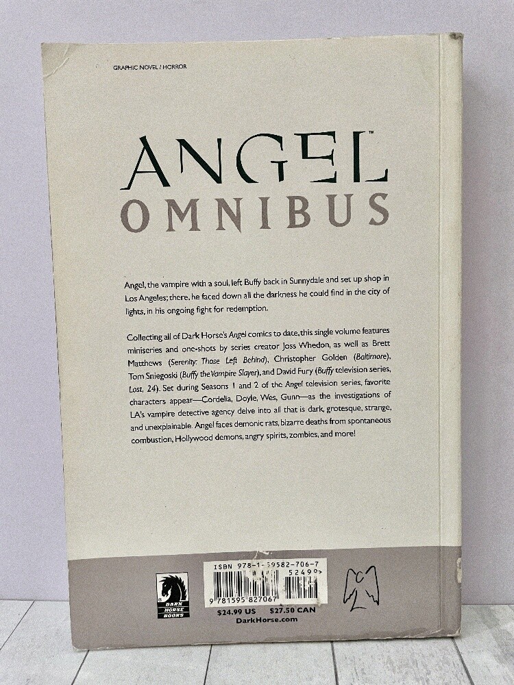 PorterMonkey presents ... Angel Omnibus ISBN: 1595827064 Author: Whedon, Joss; Golden, Christopher; Matthews, Brett; Sniegoski, Tom Publisher: Dark Horse Books Release Date: 2011-07-12 Seller Category: COMICS Qty Available: 1 Condition: Collectible: Good Sku: C1249G-042924A6 Notes: Unmarked, text and graphics appear free of highlighting, underlining and writing. Paperback, cover shows quite a bit of edge, spine and corner wear, corner creasing and shelf wear from regular use. Binding is solid. First edition, first printing thus, paperback, English, Full Print Line Displayed. 2011. Dark Horse Books. A book that is currently Out-Of-Print, Uncommon, A First Edition, or Collectable. Angel Omnibus. Dark Horse Books. Ships quickly and with care. Description: Heralding the return of Angel to Dark Horse Comics! Angel Omnibus collects all of the original Dark Horse Angel comics to date, and features stories by series creator Joss Whedon, Brett Matthews (Serenity: Those Left Behind), and Christopher Golden (Baltimore). Set during seasons one and two of the Angel television series, favorite characters appear - Cordelia, Doyle, Wes, Gunn - as the investigations of LA's vampire detective agency delve into all that is dark, grotesque, strange, and unexplainable. Angel faces demonic rats, bizarre deaths from spontaneous combustion, Hollywood demons encountered courtesy of Cordelia, angry spirits, zombies, and more! Before you take a look at the upcoming new Dark Horse Angel comic series and the aftermath of Buffy Season Eight, take a step back and remember Angel's LA saga!Whedon, Joss; Golden, Christopher; Matthews, Brett; Sniegoski, Tom