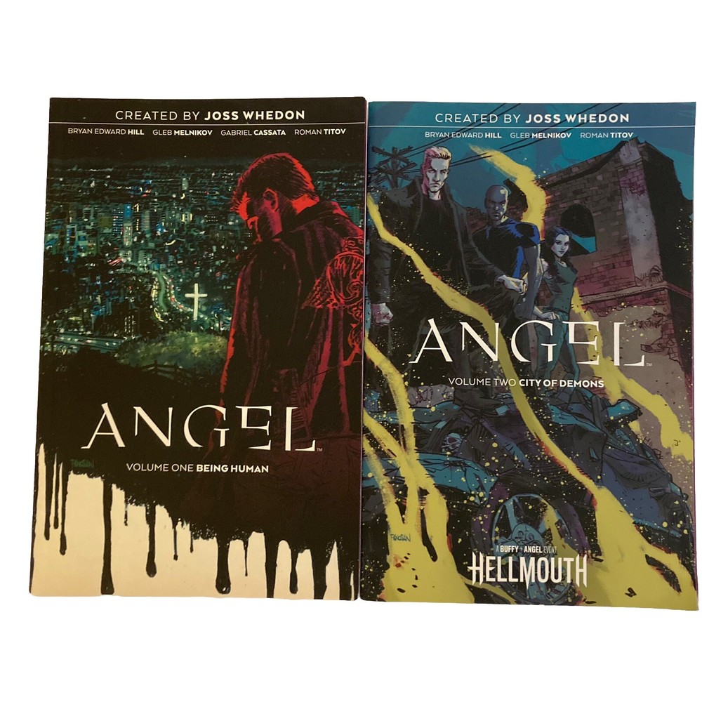 Angel Volume One: Being Human and Volume Two: City of Demons graphic novels created by Joss Whedon. 1st Editions. Very good condition. Please zoom in on all pictures for detail. Color may look different in pictures due to lighting, screen settings, camera, etc. Ships fast and free from a clean, smoke free home.