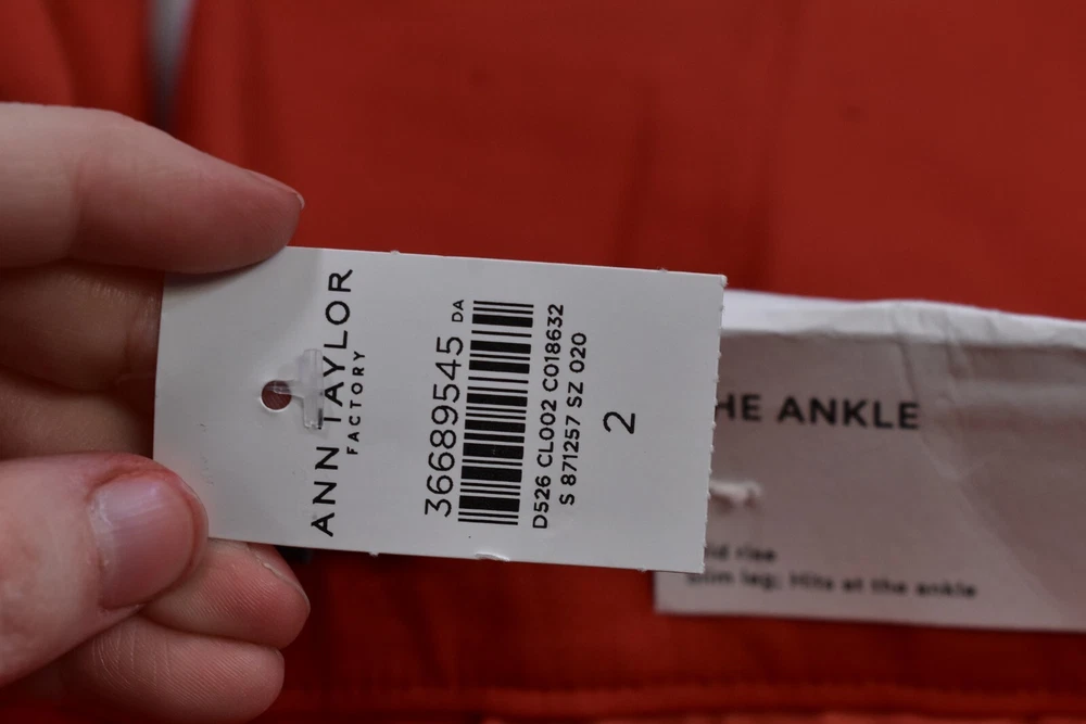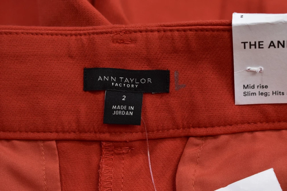 Ann Taylor Mid Rise Slim Leg Ankle Business Pants Burnt Orange Womens 2 Womens US Size 2. 93% Cotton 7% Spandex. Faux Pockets Why Shop with US? Customer Service is our #1 Priority Excellent Pricing Excellent Feedback Quality Assurance Fast Shipping Feedback If you are completely satisfied with your purchase please leave us positive feedback. If there is an issue with your order, please understand we are human and we do make mistakes. Please send us a message and give us a chance to resolve before returning or opening a dispute with eBay. Shipping Policy We will ship almost all items within 1 business day. All items ship from Kansas City MO and take 2-5 days depending on shipping service. On rare occasion, USPS or FedEx may delay a package. Please understand this is out of our control. If you order/pay before 12 PM CST we will try our best to get your package out same day. If you would like an express delivery option, please message us before purchasing, we can update the listing to reflect an express option. (Additional Shipping charges will apply) Disclaimer Prelovedclothes19 is not sponsored by or affiliated with the brands associated with the products being sold. Furthermore, there is no guarantee or assumption that we can provide support or offer any warranty on this product after purchase. Prelovedclothes19 Copyright © Prelovedclothes19