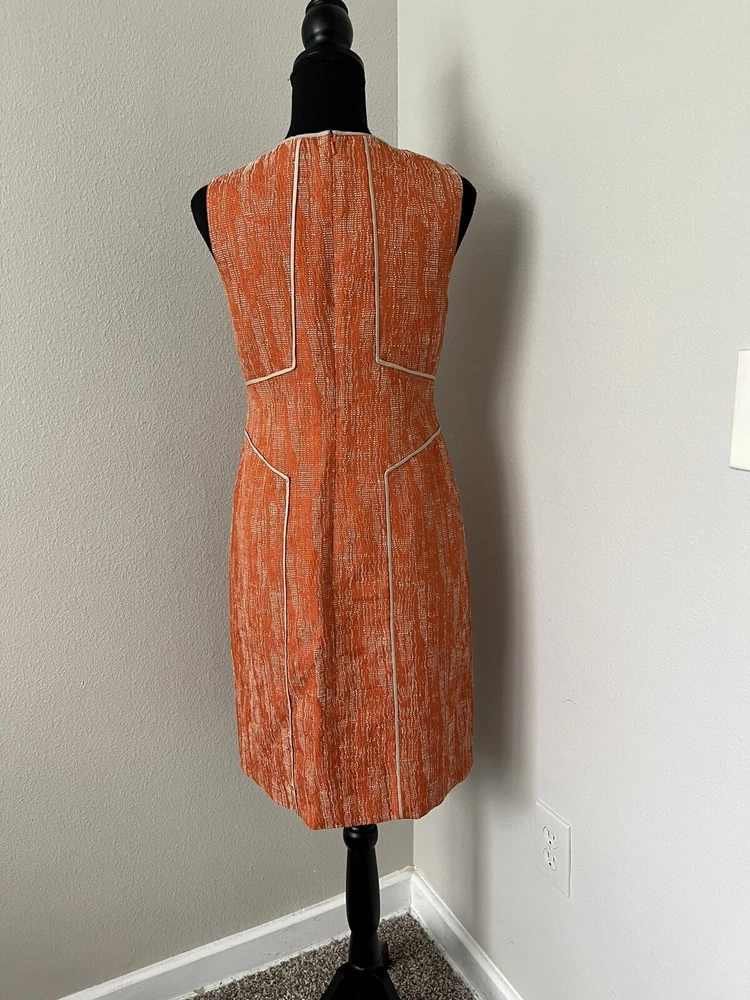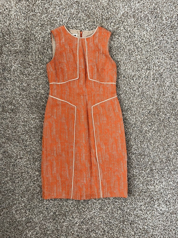 Anne Klein Textured Orange Career Sheath Dress 2. Size: 2 Excellent Condition 16” Chest / 30” Waist / 36” Length 32% Cotton / 27% Polyester / 24% Viscose / 17% Linen MSRP: $124