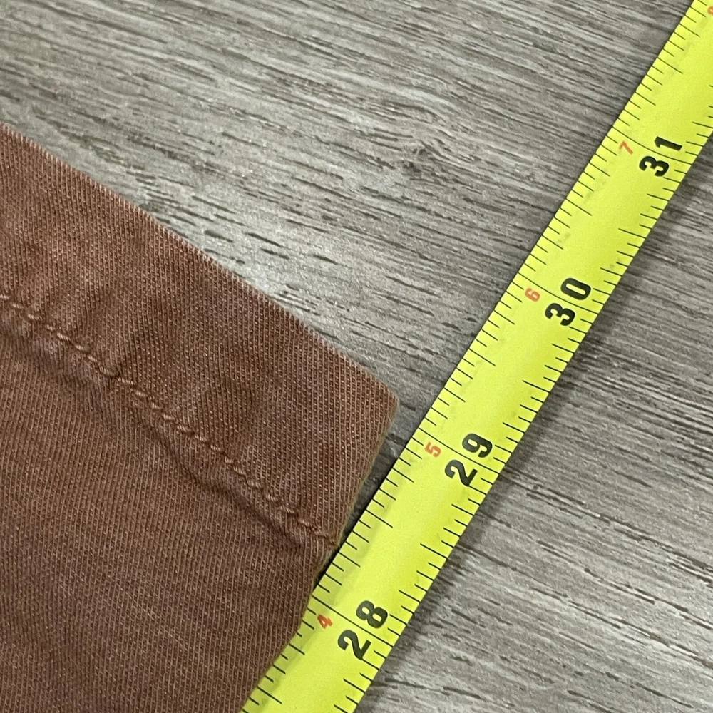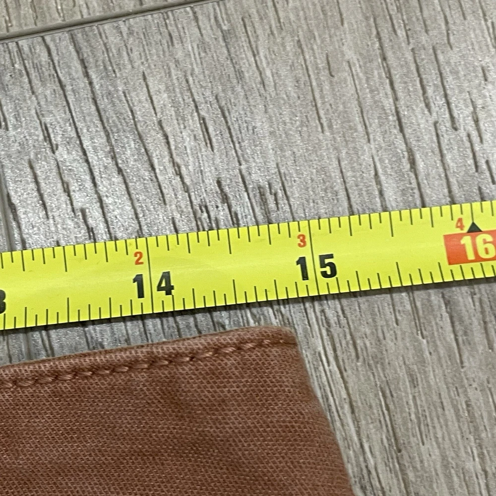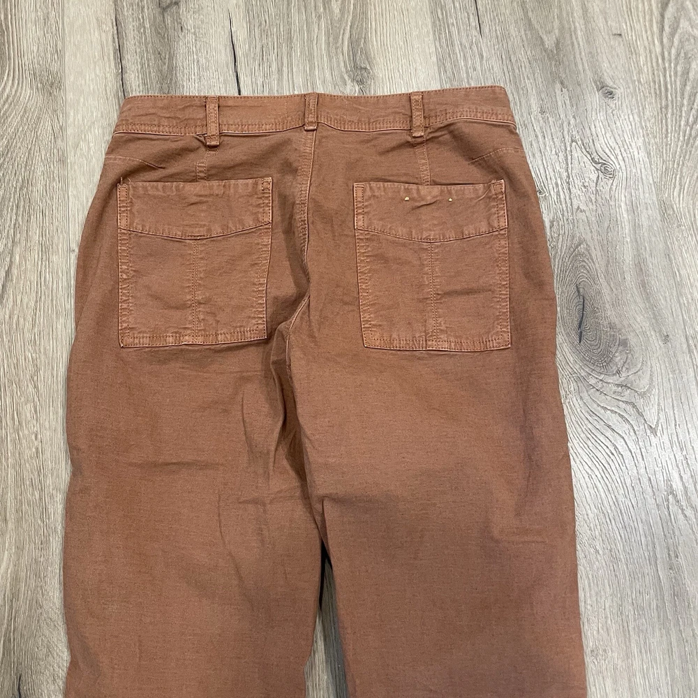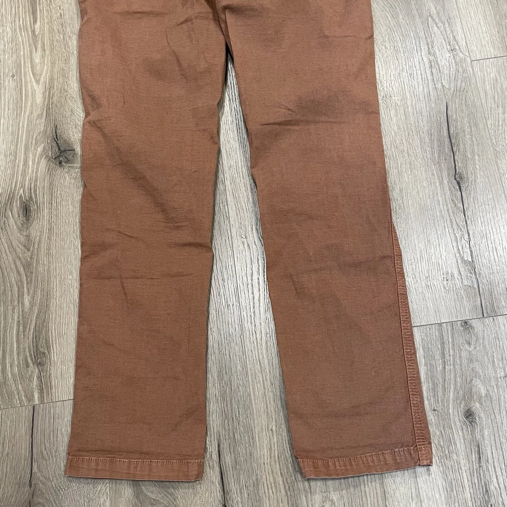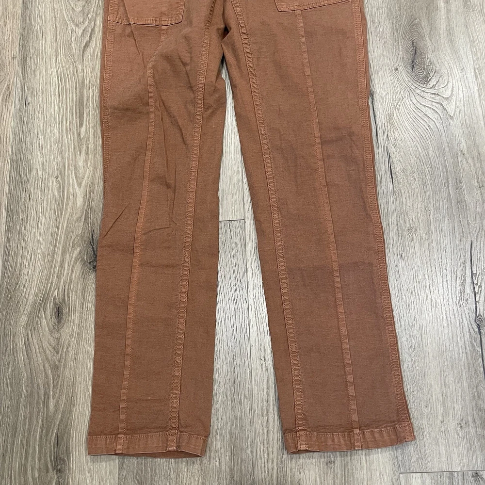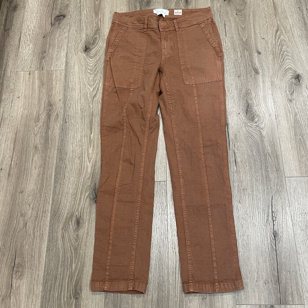 Elevate your wardrobe with these Anthropologie The Wanderer Pants. The pants are a beautiful orange color and are made of a cotton blend material, perfect for a casual or dressy occasion. The pants have a mid-rise waist size, tapered leg style, and ankle length, flattering to any body type. The pants feature a zip and button closure, with a waist size of 29 inches and a size of 25. These pants are perfect for any woman who wants to add a pop of color to their wardrobe. The rust-colored pants are part of the Anthropologie brand and are perfect for any woman looking for a stylish and comfortable pair of pants.