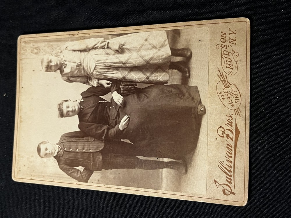 This original antique photo is from a collection of antique photographs mostly from between 1880 and 1910 acquired from a large antique collection. The vast majority of the photos in this collection originate from throughout New York state and cover everything from portraits to landscapes. Type & Size: A 4x7 inches original photograph. Condition: Over 100 years old and definitely shows signs of age. Some photos in this collection have tears, fading, coloring, foxing, and other imperfections. Please take a close look at the provided photos to see precisely what the condition is like. This antique photograph features three individuals posed together, likely taken in a studio-setting by Sullivan Bros. in Hudson, New York. The central figure is a woman seated, wearing a dark dress with a bustle, and the two figures on either side are younger, one in a vest and trousers, and the other in a light dress. The ambiance and the attire suggest the photo was taken during the late 19th century, capturing a moment of familial or friendly connection. Sullivan Bros. was a known photography studio in the late 19th century, and their work often reflected the social customs of the time. This photograph may have been taken during a special occasion or family gathering, as portraits were common for preserving memories in an era when photographs were becoming increasingly popular. The details of their clothing and the ambiance could give clues about their social status and the period in which they lived. The back of the photo contains the text: **Sullivan Bros.** **425 Warren Street,** **Hudson, N. Y.** **The Negative of this Photograph is preserved for future orders and can be reduced for the smallest locket or enlarged up to life-size and finished in Crayon, Ink or Water Color.**