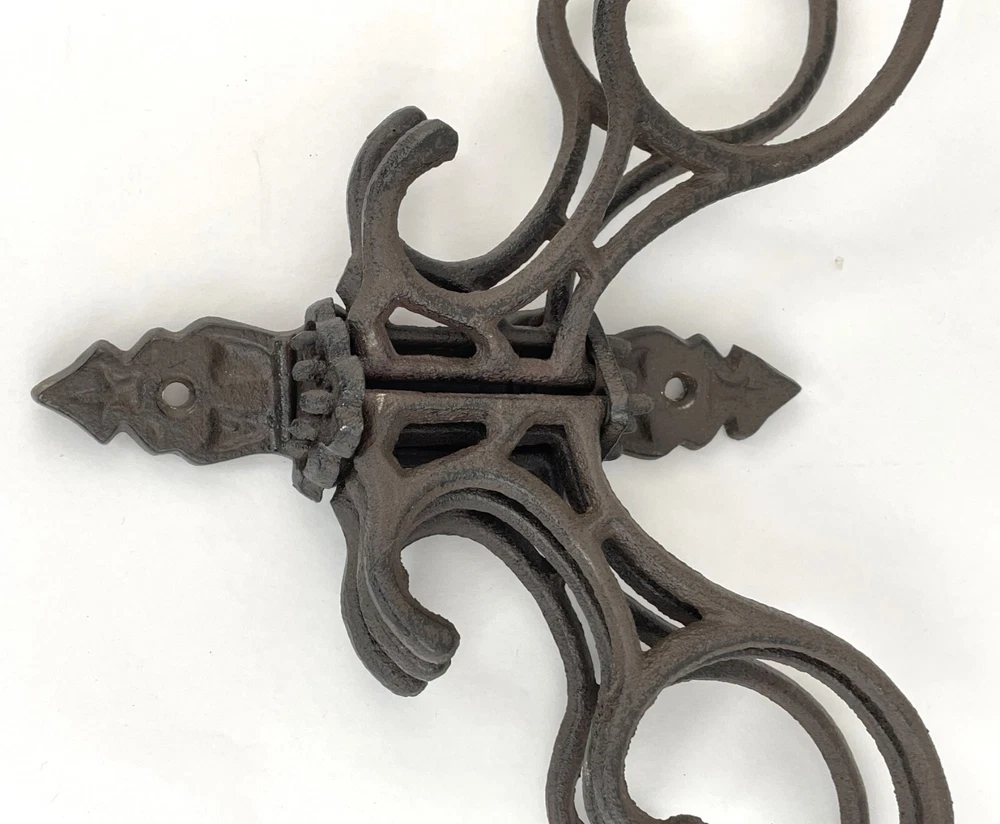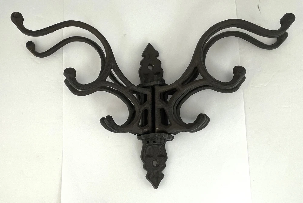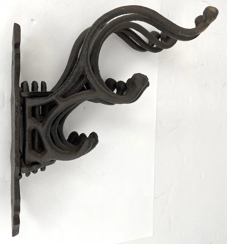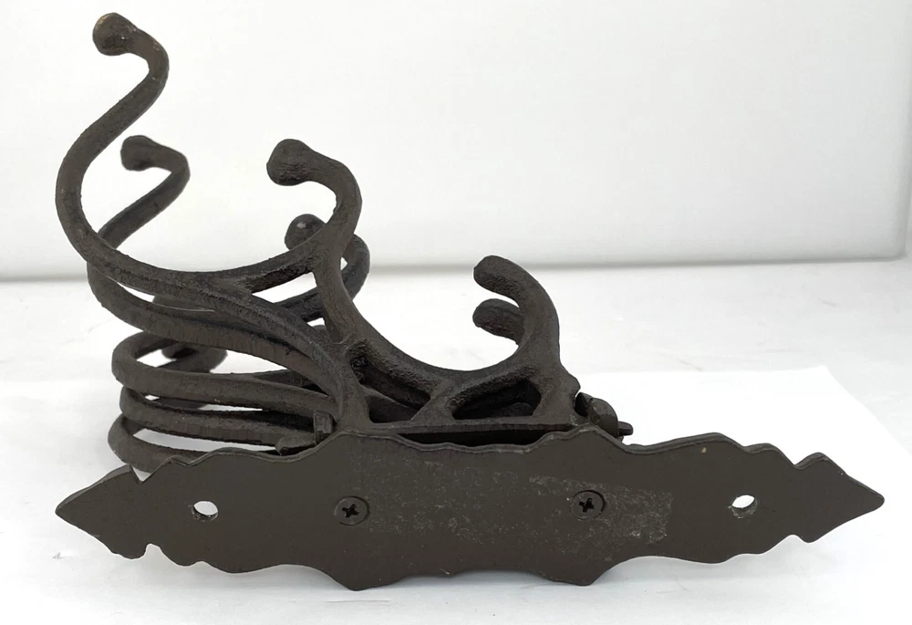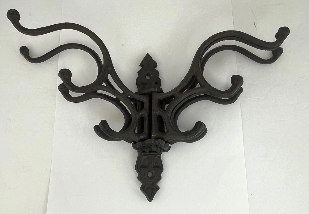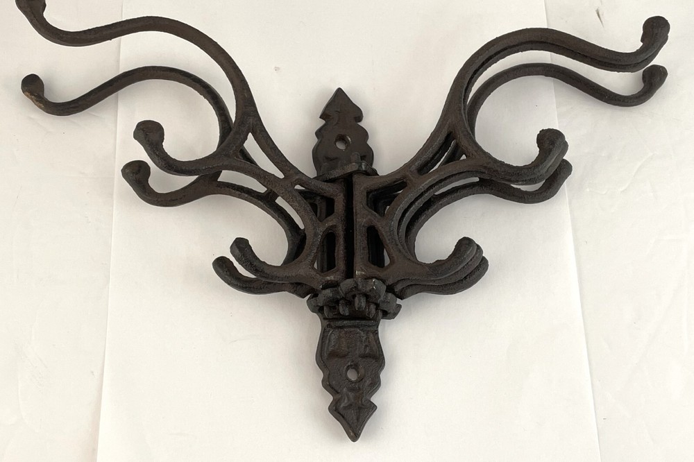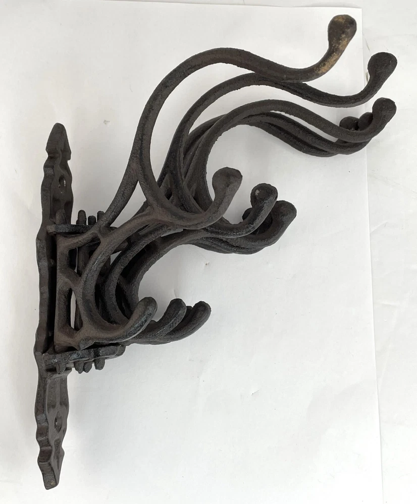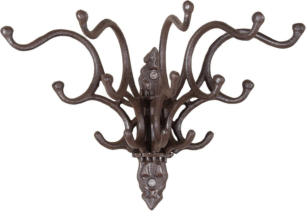 Antique Cast Iron Wall Hooks in Rust Finish Creative Co-Op this farmhouse-inspired, wall-mounted storage piece features an elegant, yet durable, cast iron silhouette in a heavily distressed finish Can be mounted in 2 different directions based on preference, and features 15 sturdy hooks for hanging coats or handbags Each 3-pronged hook swivels independently for easy access to stored items Made from 100% cast iron Wall hook measures 7.25 inches L x 2.5 inches W x 7.5 inches; Each 3-pringed hook measures 0.25 inches L x 2 inches W x 3 inches H