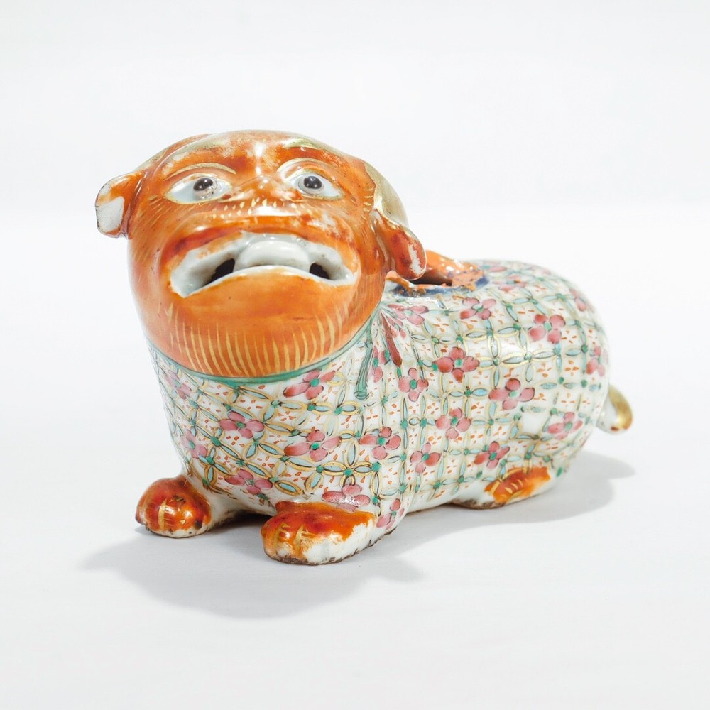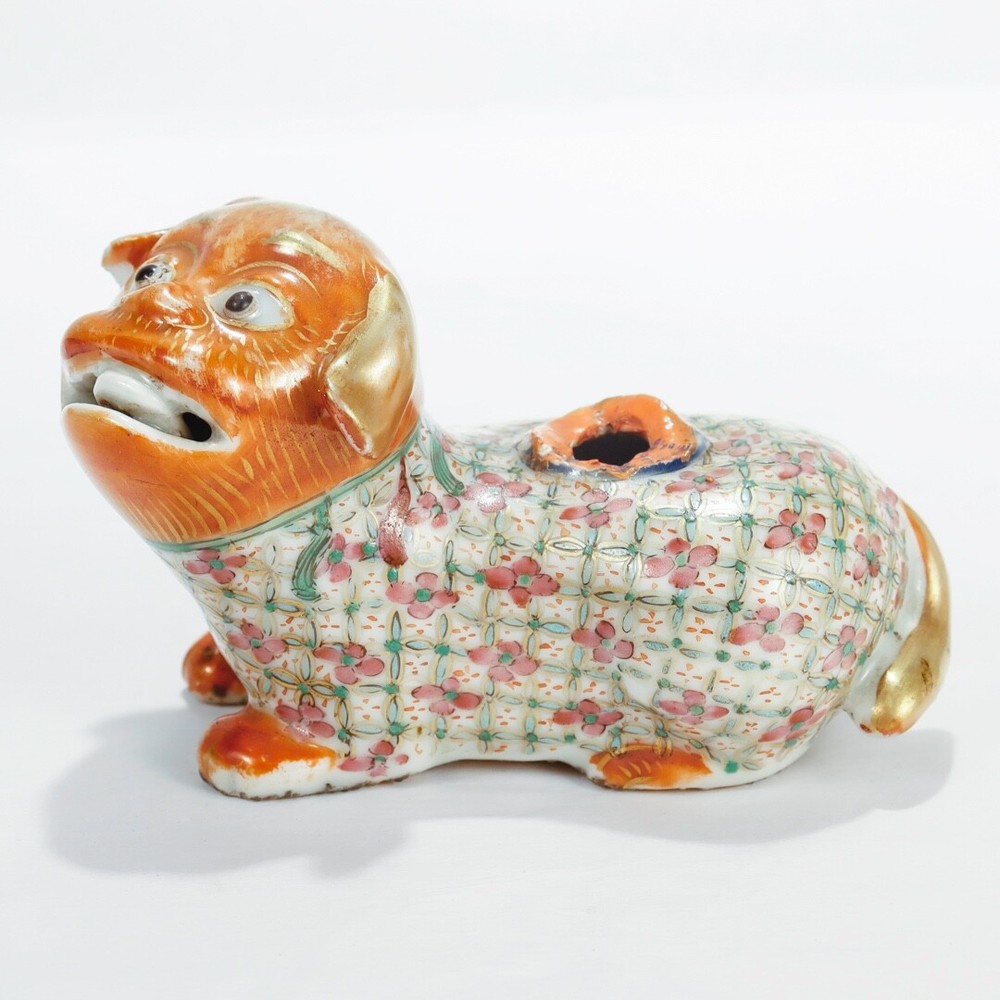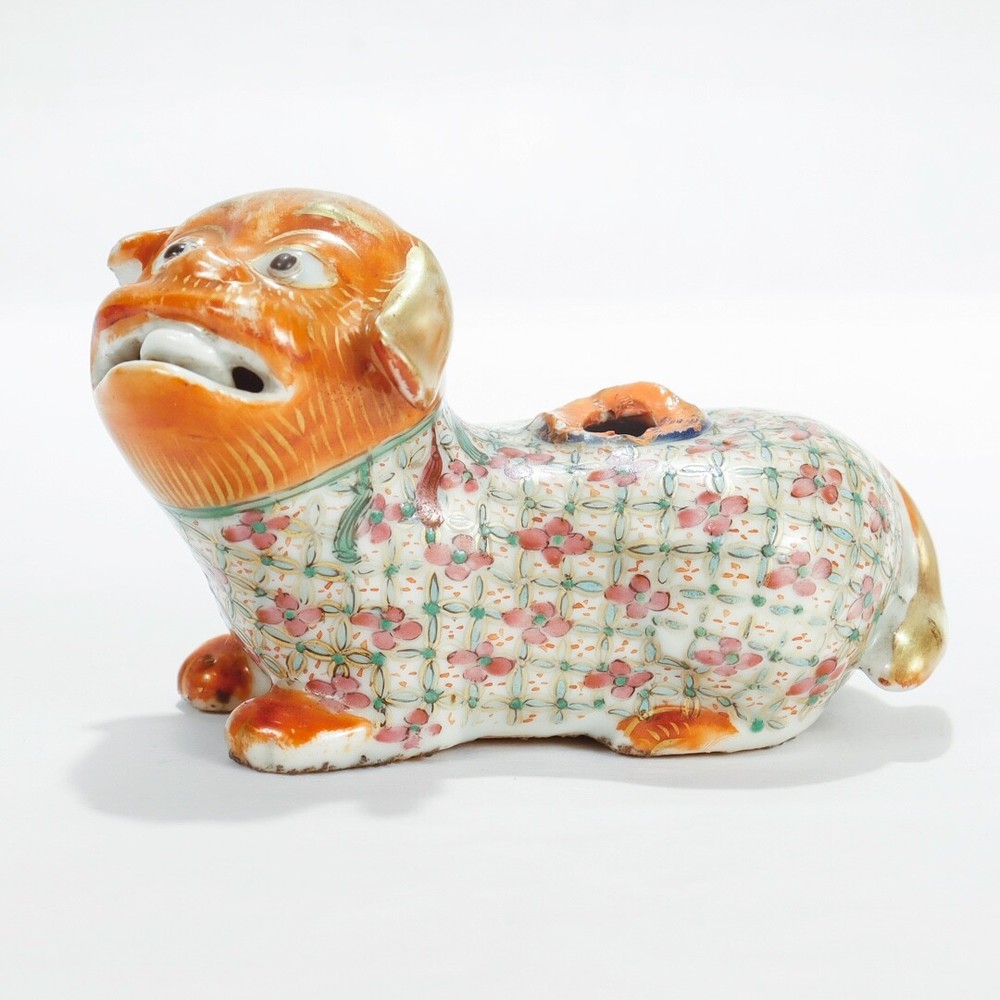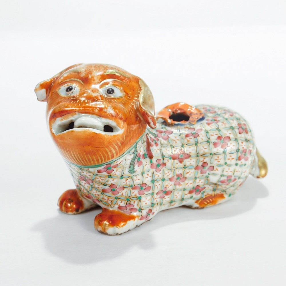 A fine figural Chinese Export joss stick. Additional Details: With an orange head and paws, famille rose coat and neck, and gilt tail. Lacking the joss stick or candlestick holder to its back. Simply a wonderful piece of Chinese porcelain for repair! Date: Late 19th or Early 20th Century Overall Condition: It is in overall fair, as-pictured, used estate condition. Condition Details: It lacks the joss stick/candlestick to the foo dog's back with chips and overpaint at that spot. There's also a chip to one ear, wear to the painted decoration and gilding in spots, and with a firing flaw or popped bubble near the right leg. Overall, i t has some fine & light surface scratches and other signs of expected light wear consistent with age. Measurements: Length: ca. 4 1/2 in. Width: ca. 2 3/8 in. Height: ca. 2 7/8 in. PLEASE READ After the close of the auction or listing we will email the winning bidder an invoice through Ebay based on his/her registered zip code or country code. Smaller domestic packages (under 12" ) shipping will include USPS priority shipping, signature confirmation and a $4 handling fee. Larger domestic packages will ship USPS Parcel Post to save on shipping costs. International shipping will usually include USPS International priority shipping with tracking and a $4 handling fee. Our handling fee applies to each item purchased; multiple purchases will ship together (when possible) to save on shipping fees. We ship one day a week on Thursday. We guarantee each item to be sold as listed. An item may be returned for a full refund within 14 days of receipt. If an item is not as described, you may return it for a full refund. If you would like to return it for any other reason, we will refund your payment minus shipping + handling. 14 days after receipt, the sale is final and returns are not accepted. Thanks for looking and good luck!