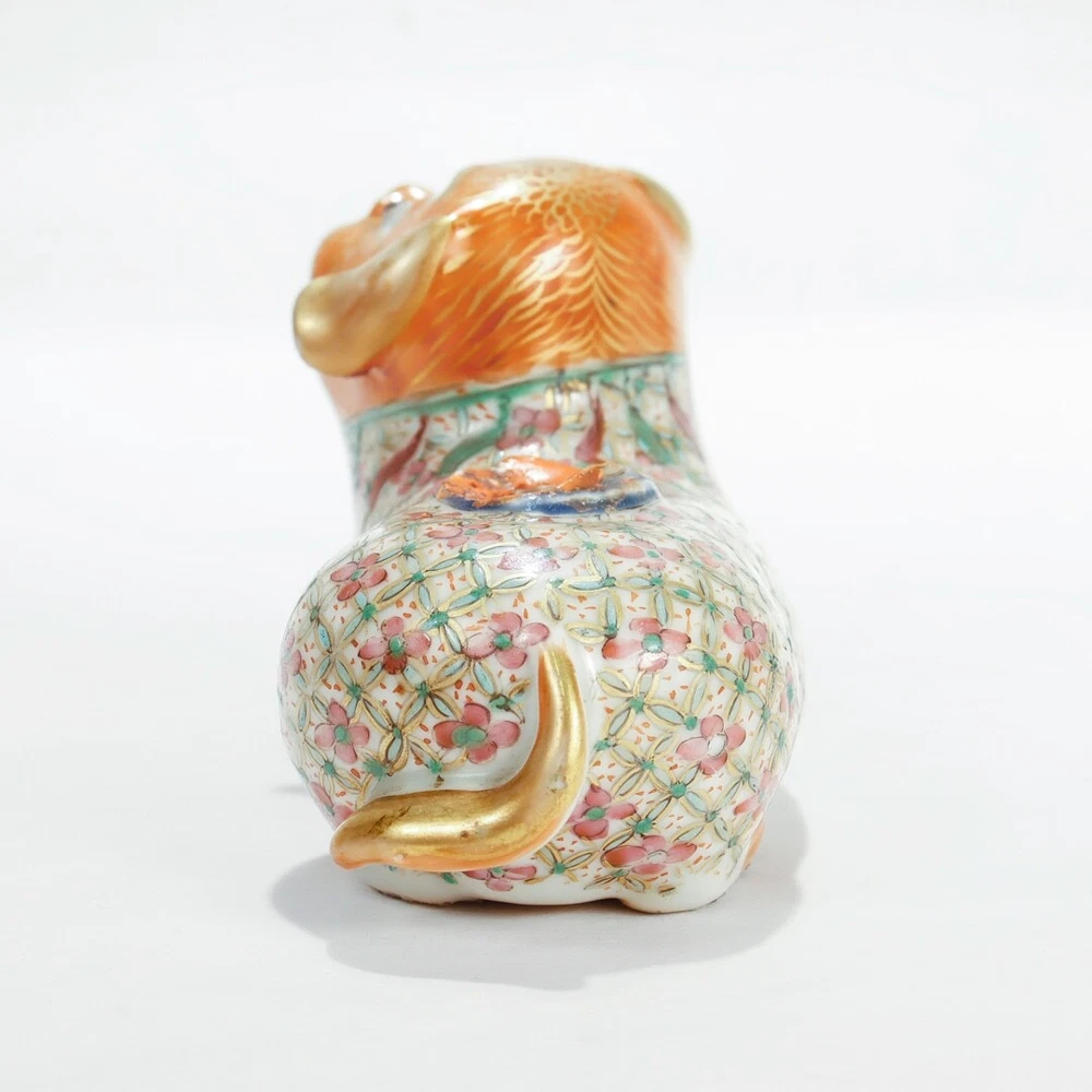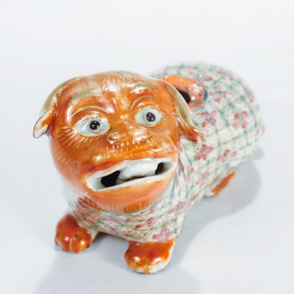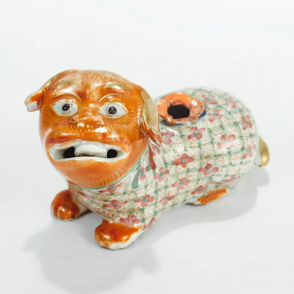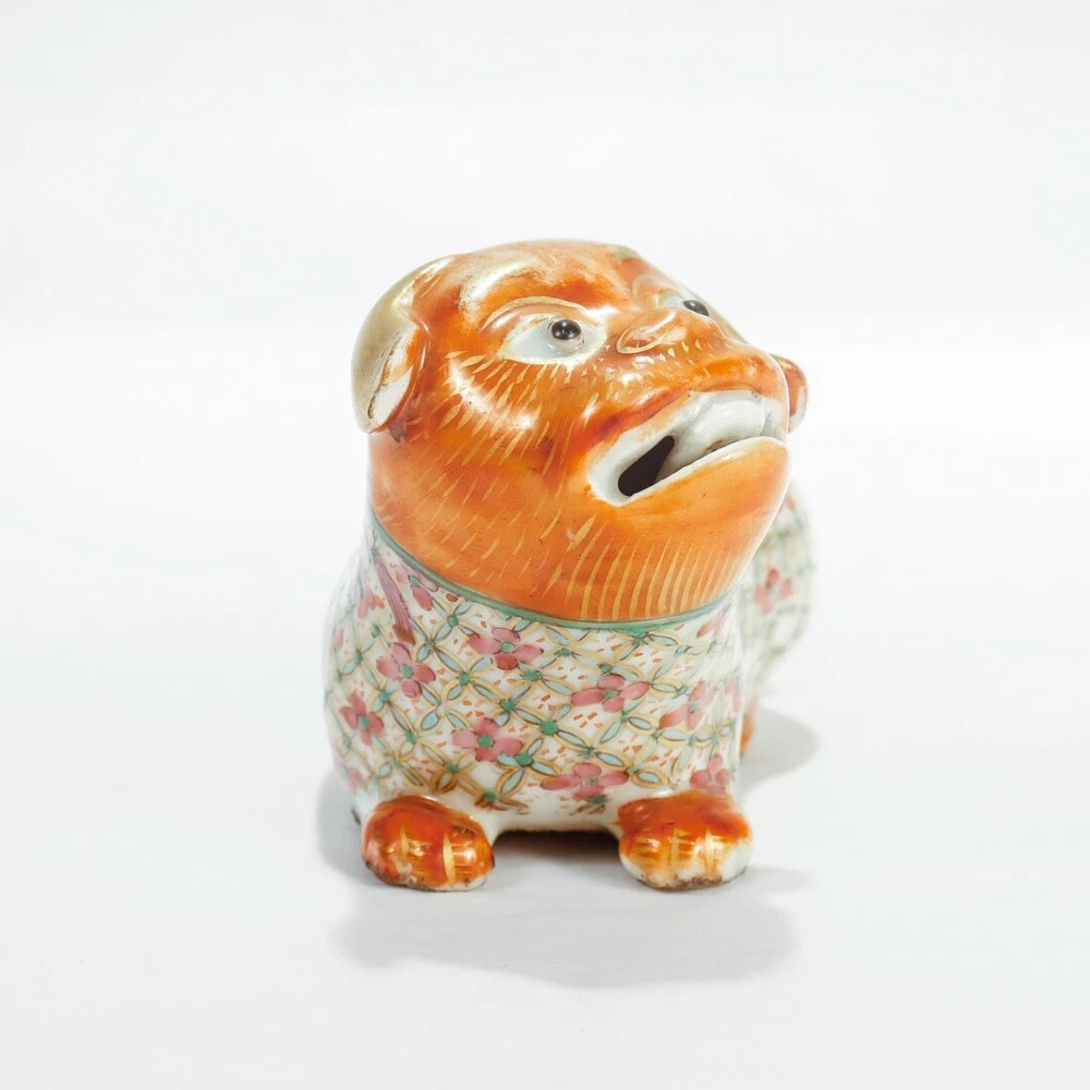 A fine figural Chinese Export joss stick. Additional Details: With an orange head and paws, famille rose coat and neck, and gilt tail. Lacking the joss stick or candlestick holder to its back. Simply a wonderful piece of Chinese porcelain for repair! Date: Late 19th or Early 20th Century Overall Condition: It is in overall fair, as-pictured, used estate condition. Condition Details: It lacks the joss stick/candlestick to the foo dog's back with chips and overpaint at that spot. There's also a chip to one ear, wear to the painted decoration and gilding in spots, and with a firing flaw or popped bubble near the right leg. Overall, i t has some fine & light surface scratches and other signs of expected light wear consistent with age. Measurements: Length: ca. 4 1/2 in. Width: ca. 2 3/8 in. Height: ca. 2 7/8 in. PLEASE READ After the close of the auction or listing we will email the winning bidder an invoice through Ebay based on his/her registered zip code or country code. Smaller domestic packages (under 12" ) shipping will include USPS priority shipping, signature confirmation and a $4 handling fee. Larger domestic packages will ship USPS Parcel Post to save on shipping costs. International shipping will usually include USPS International priority shipping with tracking and a $4 handling fee. Our handling fee applies to each item purchased; multiple purchases will ship together (when possible) to save on shipping fees. We ship one day a week on Thursday. We guarantee each item to be sold as listed. An item may be returned for a full refund within 14 days of receipt. If an item is not as described, you may return it for a full refund. If you would like to return it for any other reason, we will refund your payment minus shipping + handling. 14 days after receipt, the sale is final and returns are not accepted. Thanks for looking and good luck!
