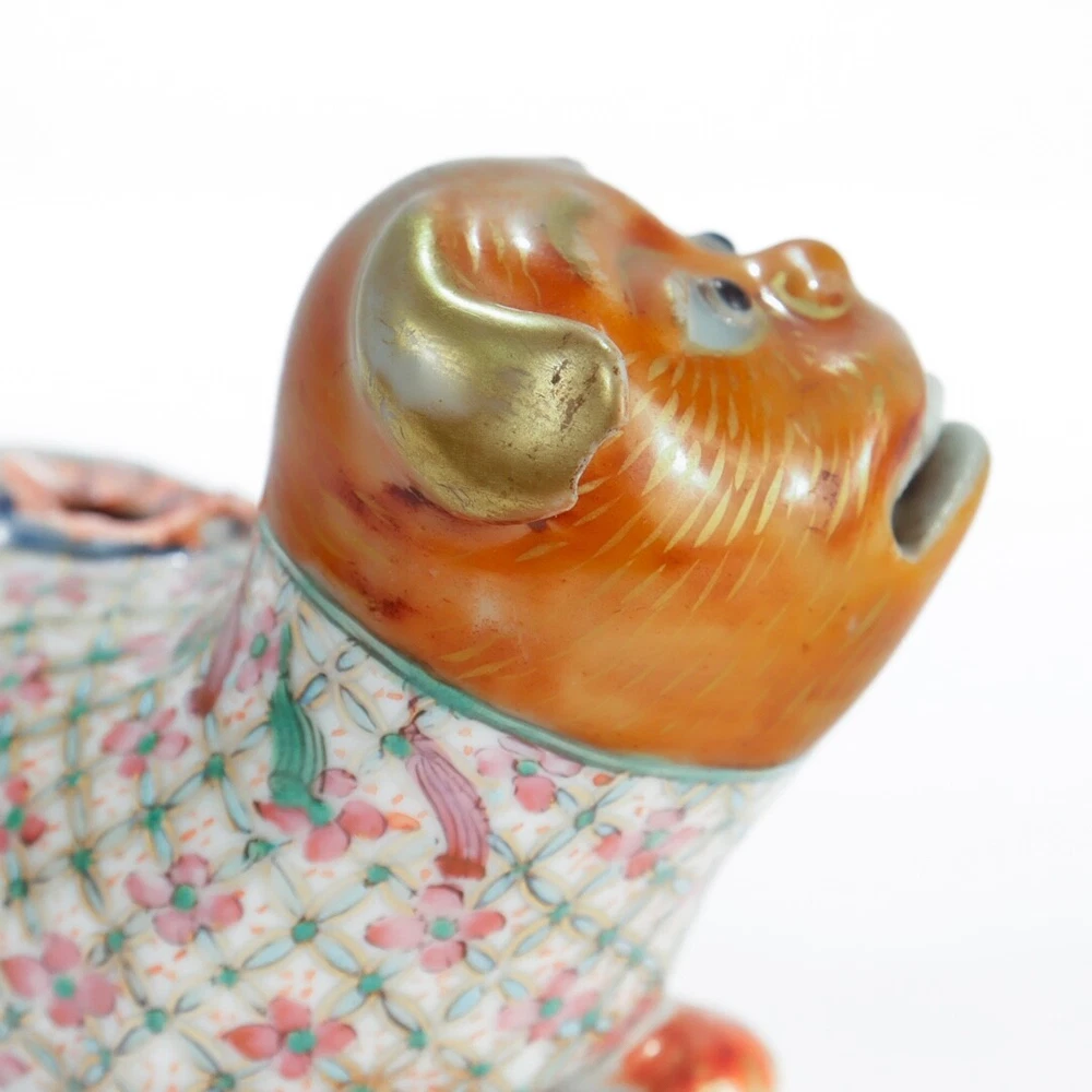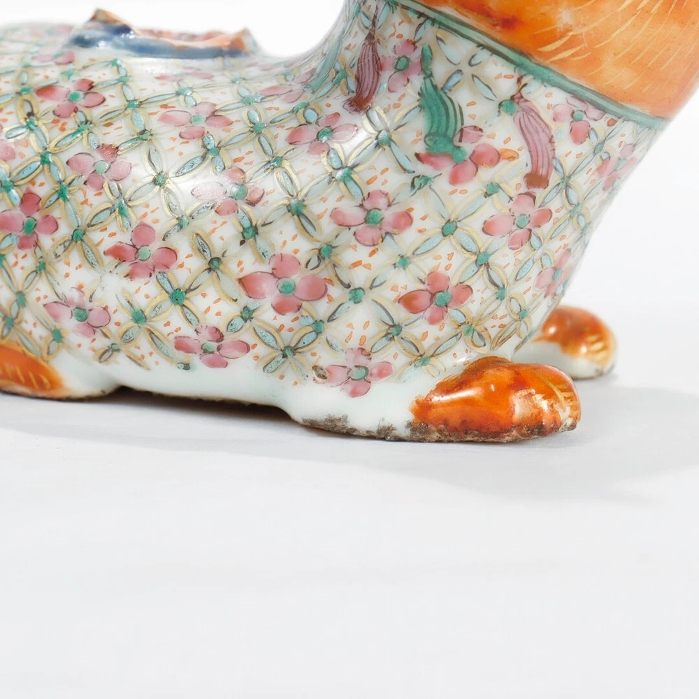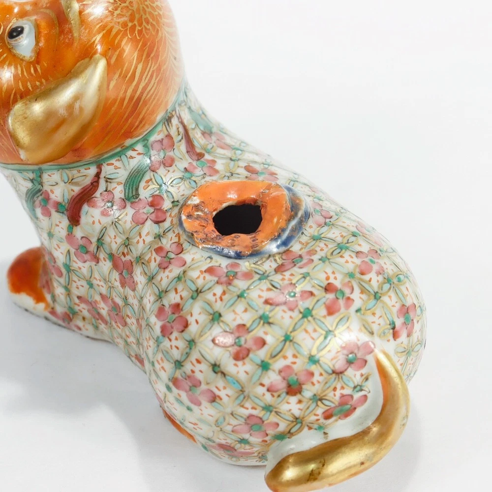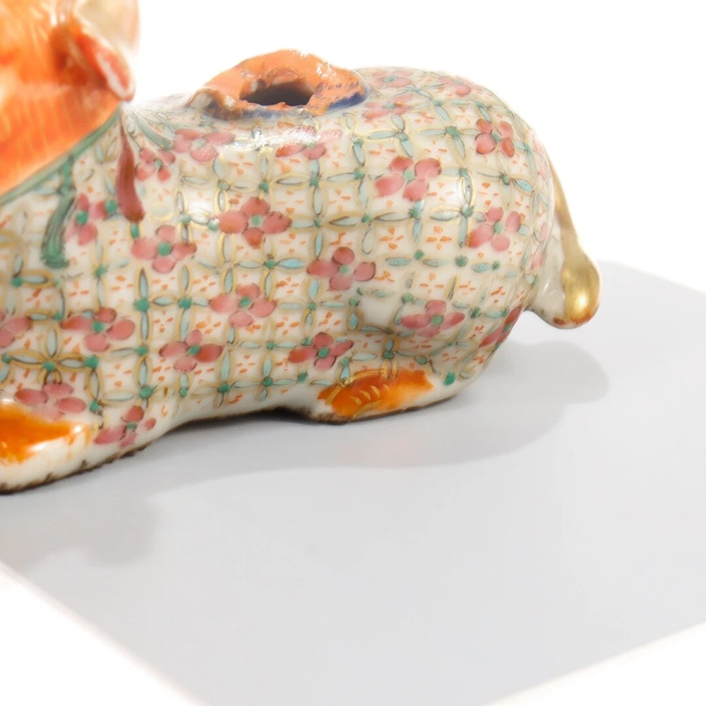 This antique Chinese Famille Rose porcelain foo dog is a stunning piece with vibrant orange accents and intricate detailing. Though it shows some wear and lacks the original joss stick holder, the craftsmanship shines through. Perfect for restoration or display as-is, it adds a touch of vintage charm to any collection. The rich colors and historical appeal make it a unique find for porcelain enthusiasts!