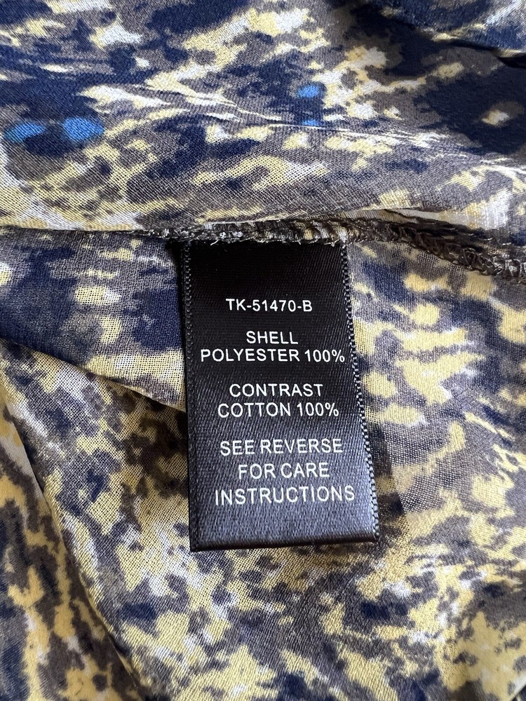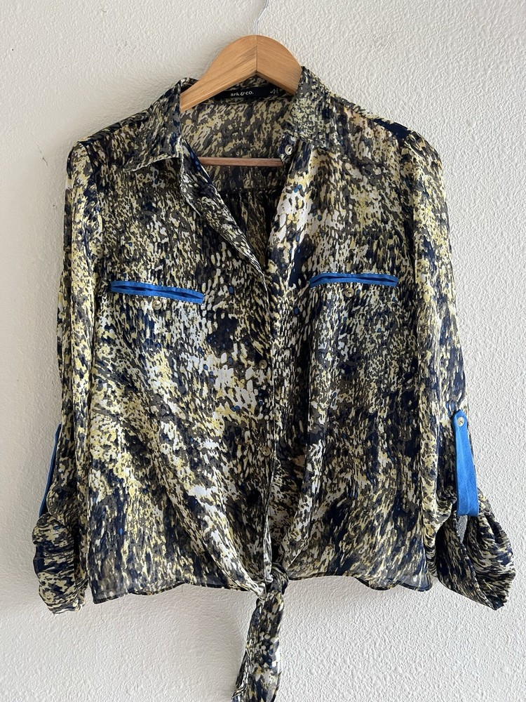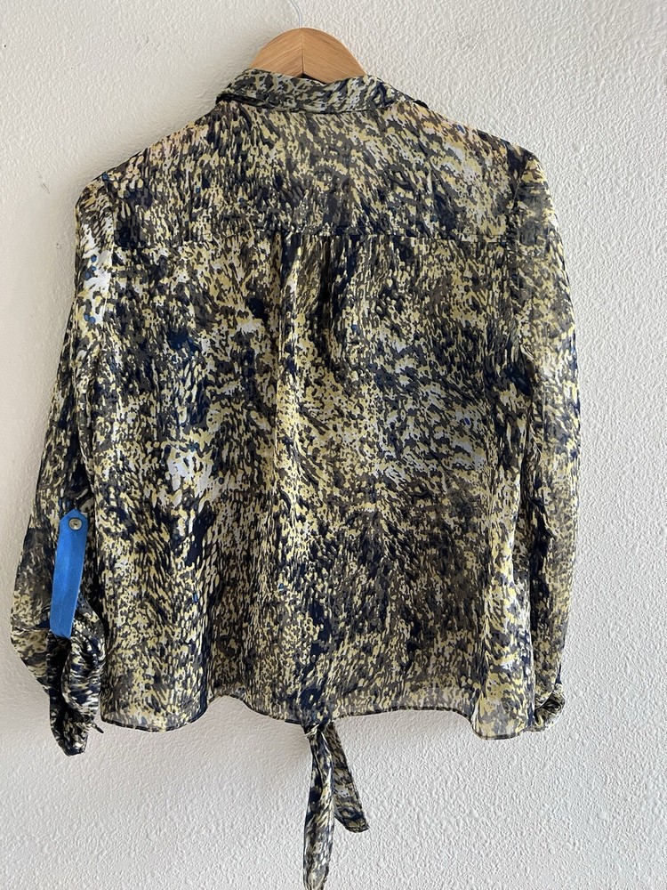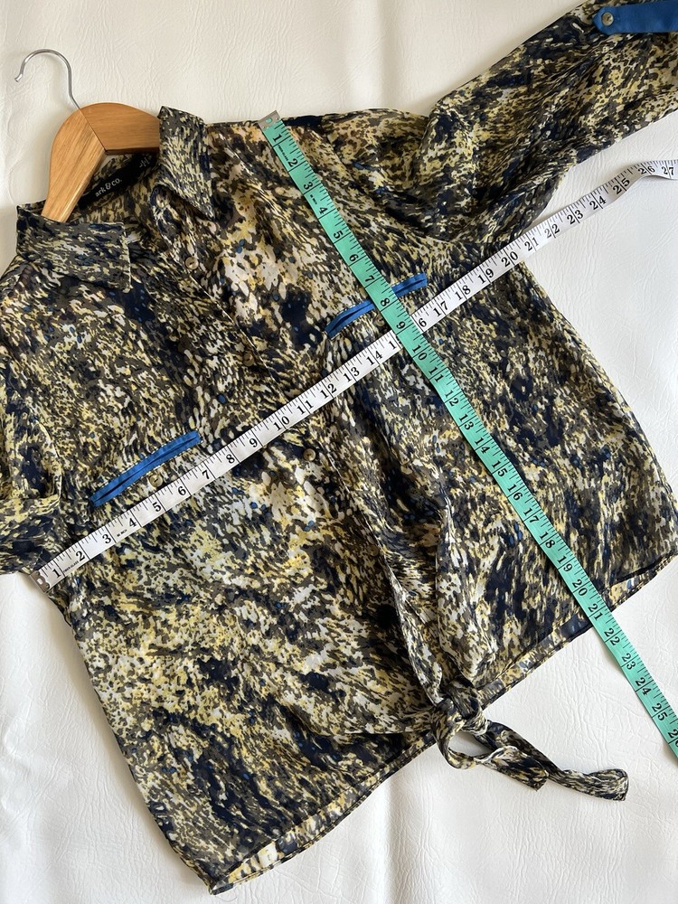 This top is a fun, vibrant piece that adds a playful touch to any outfit! The sheer, flowy fabric makes it perfect for both office and casual wear. It's in excellent condition, just as described, and the measurements are spot-on. Love the artsy, wacky print—it’s a real statement piece! Super happy with this find, and knowing it’s from a pet-friendly home is a bonus. Would definitely recommend!