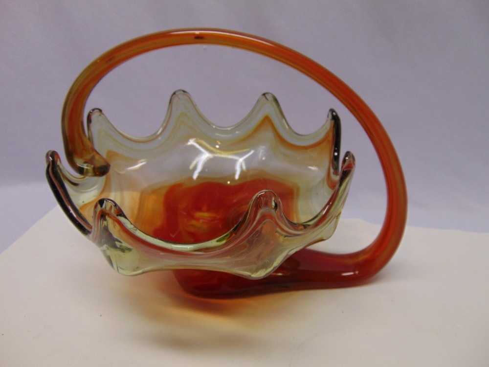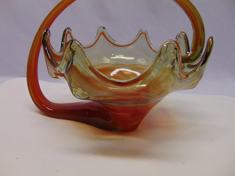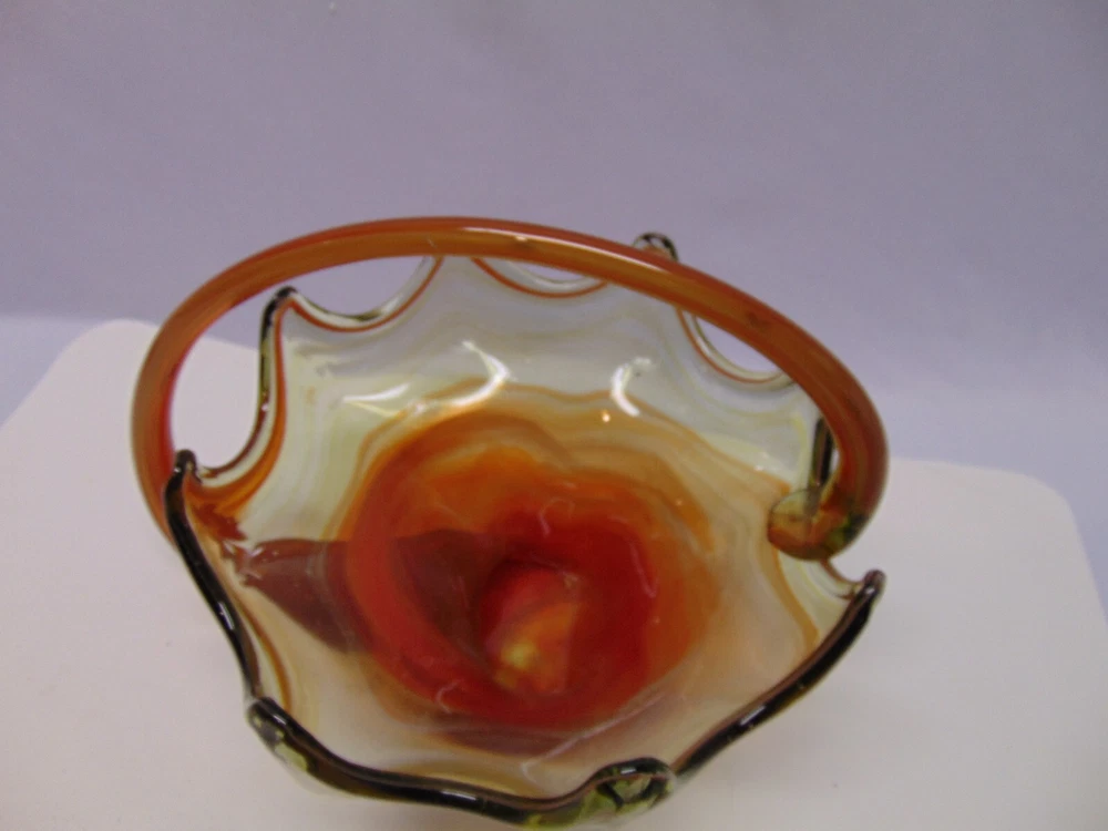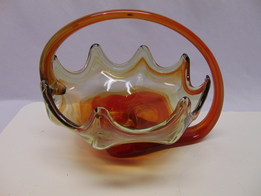 This listing a Art Glass Basket Bowl . It is Orange Clear Swirl, Mid Century Modern . The bowl measures 12" x 9" x 9" . Comes just as shown in the pictures. Thanks for looking at my items. If you have any questions please feel free to email me. All items are shipped either first class, parcel select, media mail, Fedex or UPS, priority mail. All items are packed carefully and securely. If you have any questions on shipping or any other items please feel free to email me and I will get back to you as soon as possible. I do have a variety of different items listed, please feel free to browse my ebay store. Thanks Track Page Views With Auctiva's FREE Counter