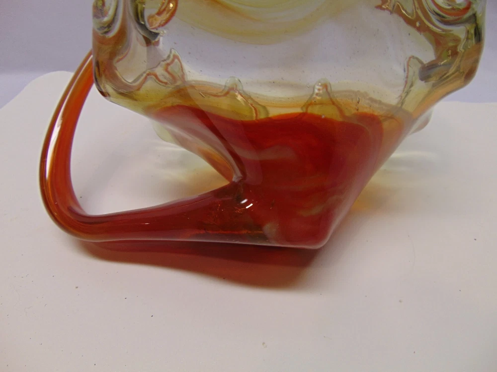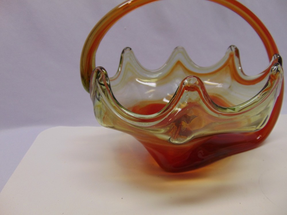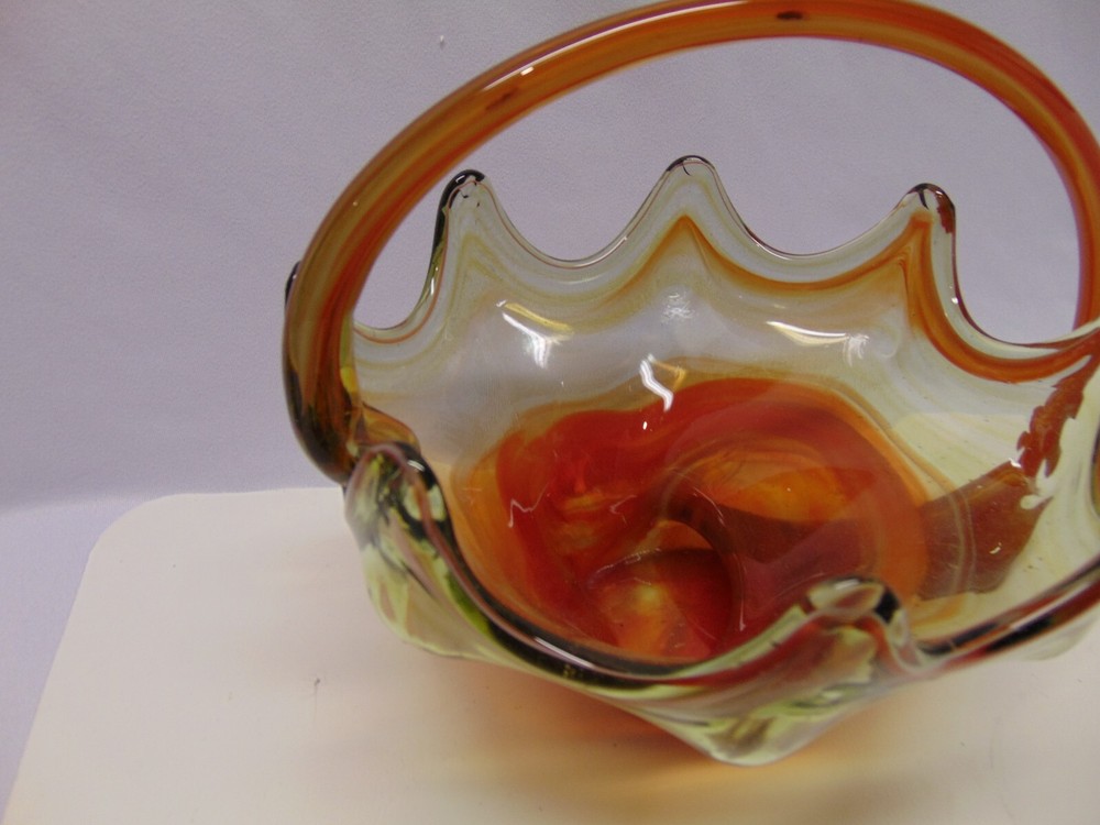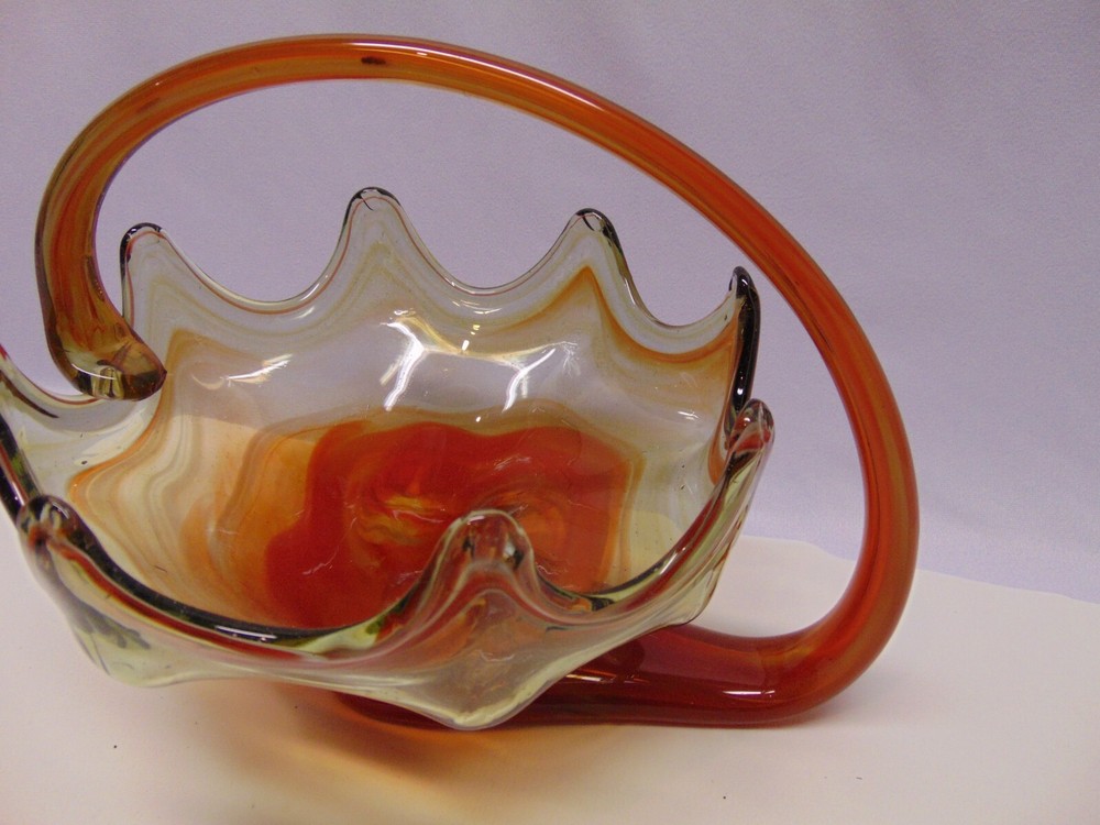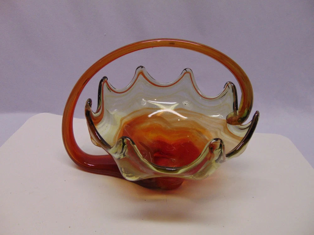 This listing a Art Glass Basket Bowl . It is Orange Clear Swirl, Mid Century Modern . The bowl measures 12" x 9" x 9" . Comes just as shown in the pictures. Thanks for looking at my items. If you have any questions please feel free to email me. All items are shipped either first class, parcel select, media mail, Fedex or UPS, priority mail. All items are packed carefully and securely. If you have any questions on shipping or any other items please feel free to email me and I will get back to you as soon as possible. I do have a variety of different items listed, please feel free to browse my ebay store. Thanks Track Page Views With Auctiva's FREE Counter