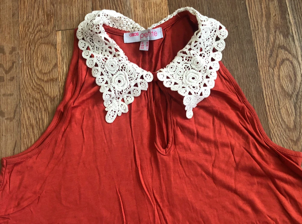 Up for sell is a Asos petites Orange sleeveless dress with crochet neck with keyhole. It’s in excellent condition with no flaws or wear. Size 6. With the dress flat, numbers not doubled, it measures approx. 17” armpit to armpit, 22” at hip, and 33” top of shoulder to bottom hem. All items ship as soon as possible and typically within 24 hours after payment is made. I gladly combine shipping as much as possible. Please feel free to ask questions. Smoke free home. Please see more great items in my store! Save me in your favorites, I have new items going on regularly! Please note-International Customers:Customs/Import duties, taxes, and other charges are not included in the purchase price or shipping cost and are the responsibility of the buyer. Please check with your customs office in your country to see what taxes or other fees may be charged prior buying or bidding. Thank you for looking.