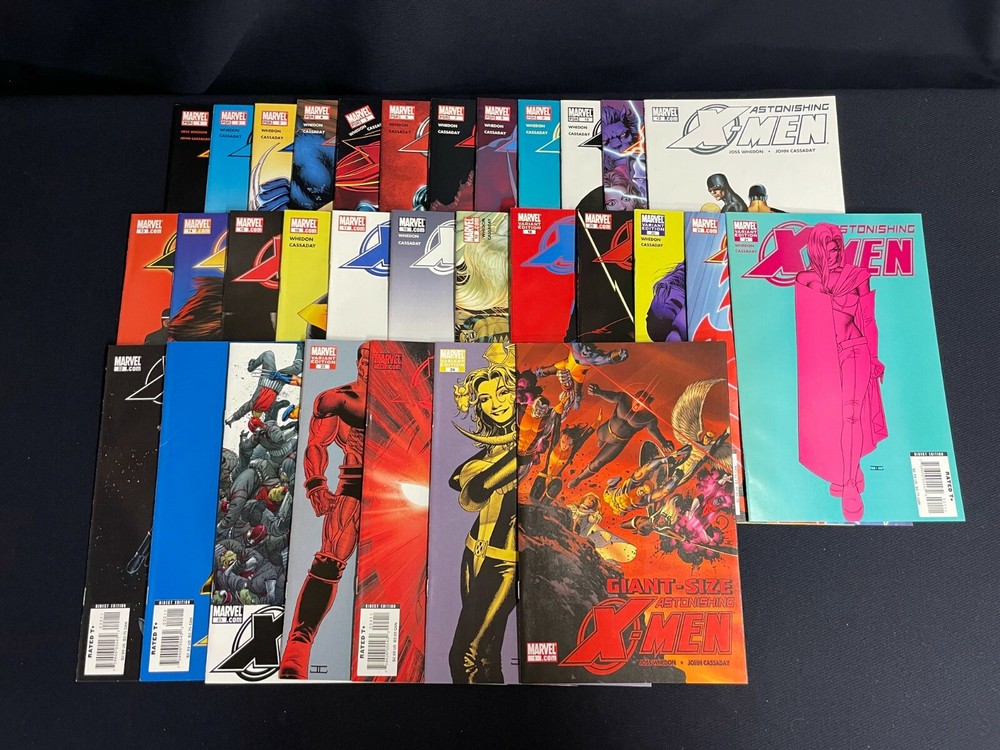 About This Auction: Astonishing X-Men # 1-24 Giant Size Astonishing X-Men The complete Joss Whedon run #19-24 have variant covers included! 31 Comics Total! These comics are solid, gently read, collectible copies* *Unless specified otherwise in the description below. We do not place a grade on individual comics: instead we provide clear pictures for you to gauge the overall quality. Please contact us for any questions or requests for additional photos. Shipping: We offer Priority shipping services and pack items securely. Items are shipped within 1 days after payment has been received barring weekends and holidays. Items over $200 require a signature upon arrival. Our goal is to assemble the best run of a series in its most complete and collectible form. We carefully consider the quality of each comic in the lot when determining its auction value as a whole. We do not place a grade on individual comics; instead we provide clear pictures for you to gauge the overall quality. Please contact us directly to discuss any questions, concerns or to request additional detailed photos. We pride ourselves on our evaluation process and our prompt customer service. We're always happy to work with you to ensure total customer satisfaction before your transaction is complete. - Comicazi Inc. in Somerville, Massachusetts is the 2017 Eisner Award winning retail shop specializing in comic books, graphic novels, toys, games, and more!! - Ebay user ID: comicazionline Inventory: Misc 5 Our comics do not come individually bagged and boarded. (If the images provided show comic books with bags/boards, please note, the bags/boards have been removed! We do not have comics individually bagged and boarded) We bag comics in bundles of 4-7 books per golden bag to prevent movement during shipping. We place boards between the bundles to protect the books on all sides.